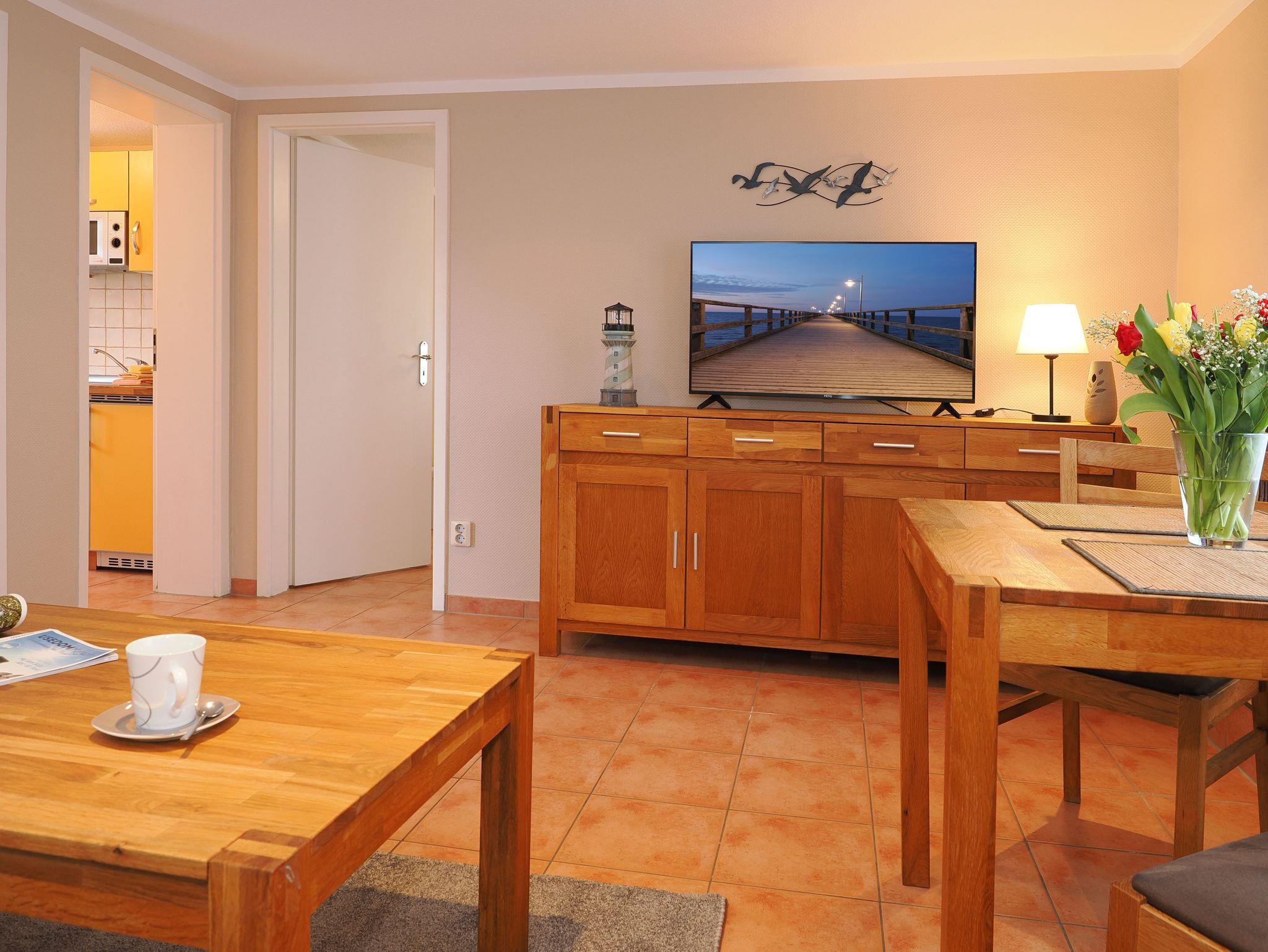 Das Wohnzimmer verfügt über eine Schlafcouch, die als Aufbettung für die 3. Person dient (180 x 200cm) und einen großen TV, der auch an ungemütlichen Tagen für Unterhaltung sorgt.