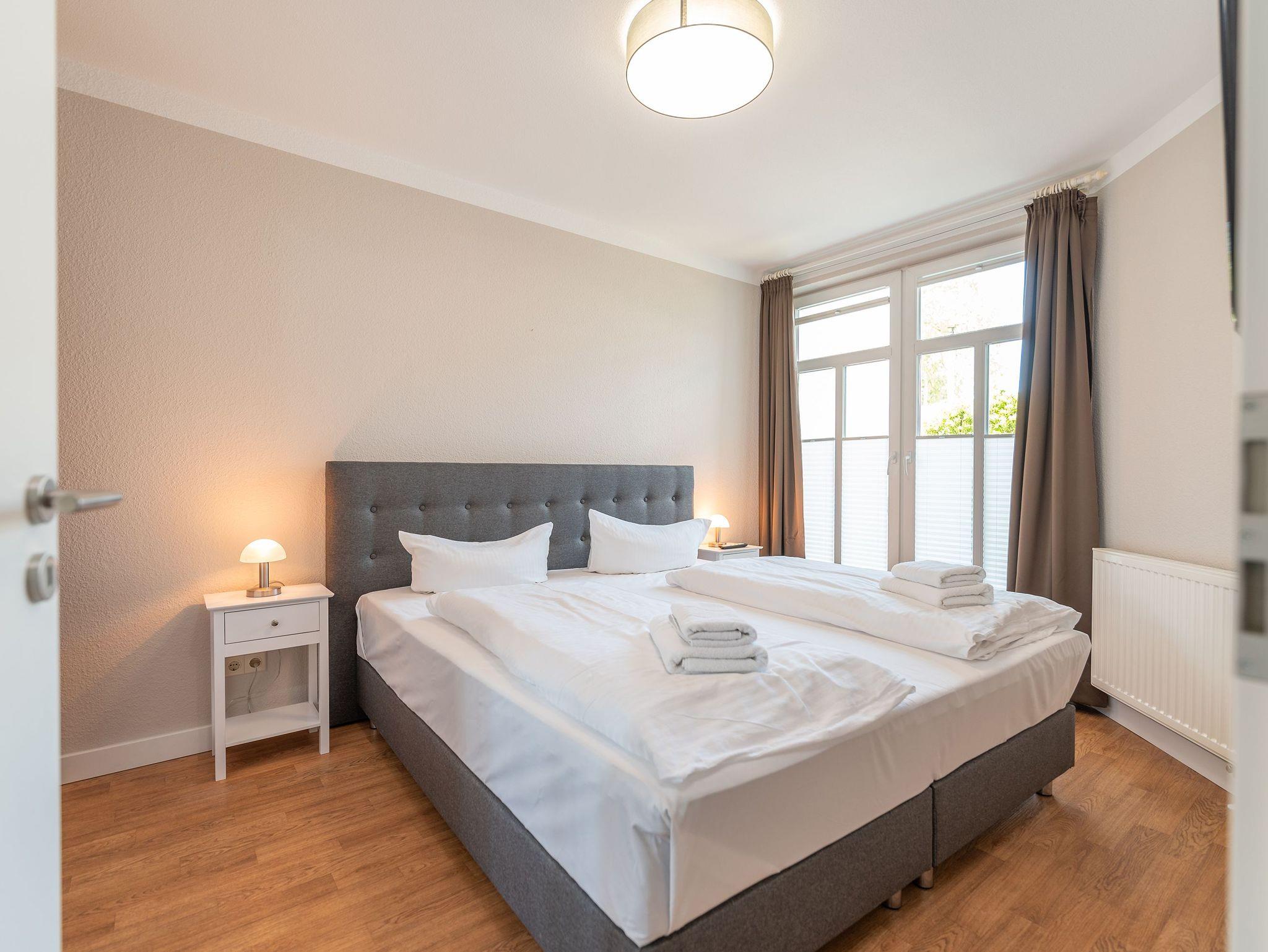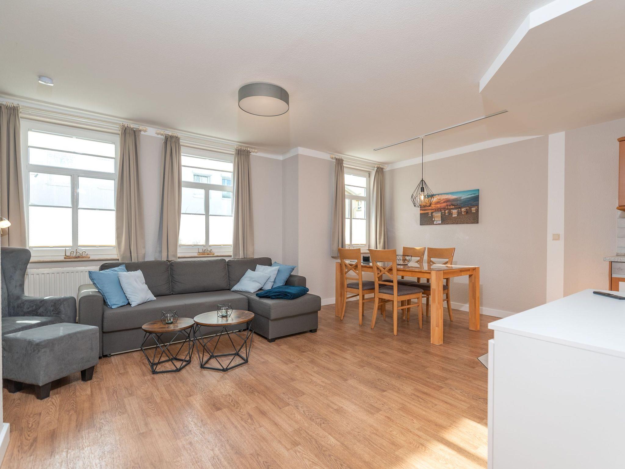 Im Erdgeschoss gelegen, umfasst die Wohnung ein Wohnzimmer mit einer bequemen Schlafcouch, einen Essbereich, eine voll ausgestattete Küchenzeile, ein Schlafzimmer mit einem hochwertigen Boxspringbett und Zugang zu einer kleinen Terrasse sowie ein Badezimmer mit Badewanne. Zu den Annehmlichkeiten gehören kostenfreies WLAN und ein kostenfreier Parkplatz in der abgeschlossenen Tiefgarage, wo auch Fahrräder sicher abgestellt werden können.