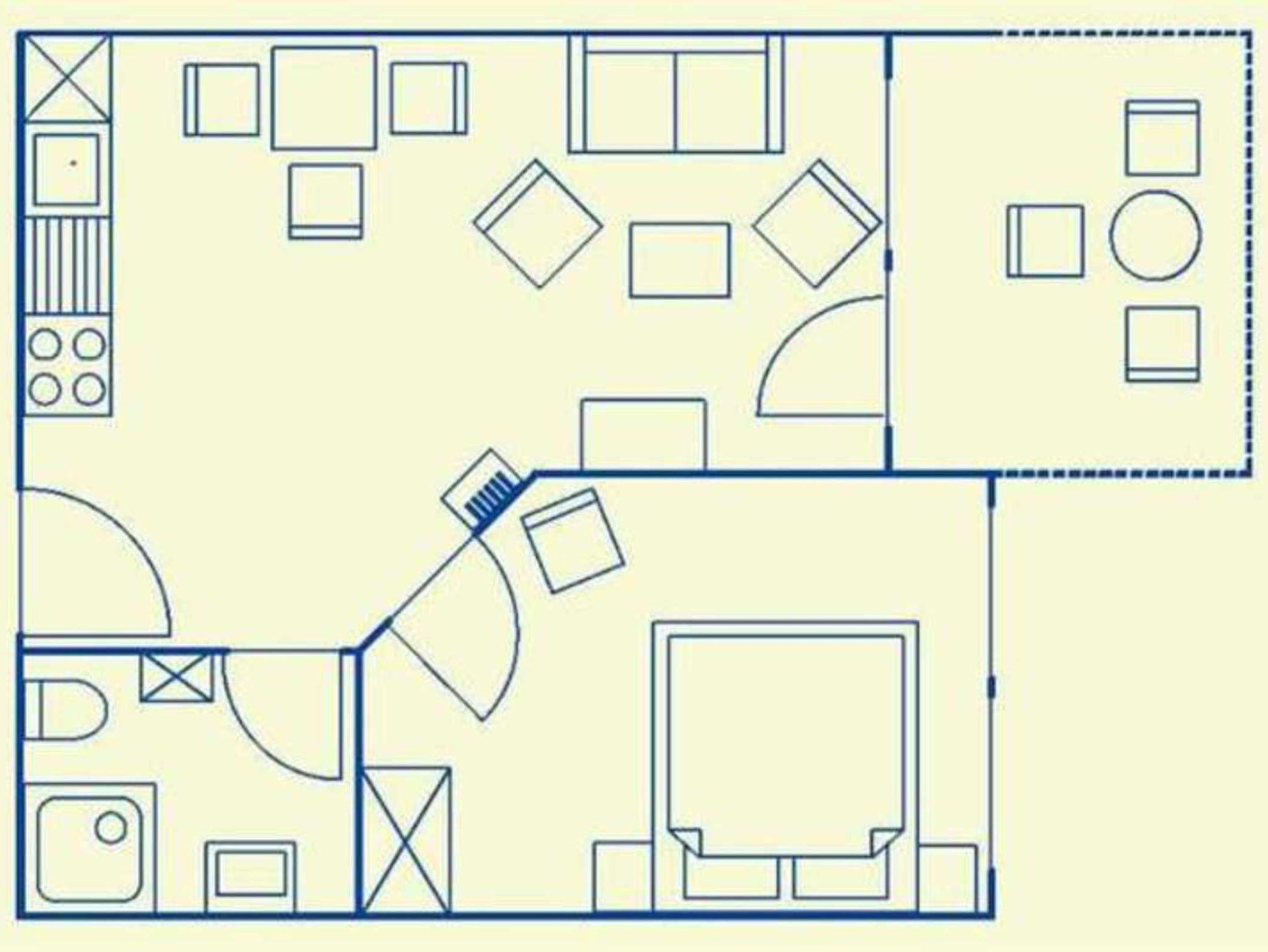 1 Schlafraum, 1 Wohnraum, 1 Küchenzeile, 1 Badezimmer mit Dusche