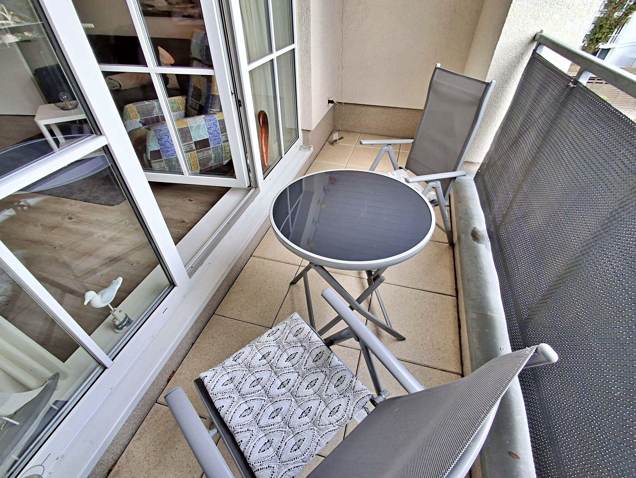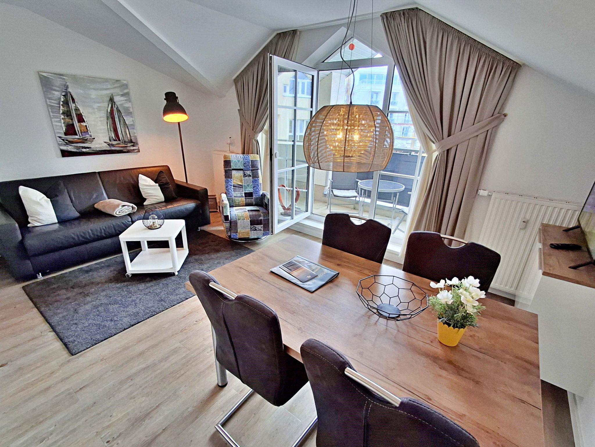 Diese schöne 2-Raum-Wohnung mit Balkon befindet sich im 3.OG (Dachgeschoss, Süd-Ost Lage) auf 45 qm Wohnfläche. Bis zum 2. OG können Sie den Fahrstuhl nutzen. Das sonnige Wohnzimmer verfügt über eine Couch, welche auch zum Schlafen geeignet ist (160 x 200 cm, 7 Zonen Matratze), Fernsehsessel und Esstisch mit 4 Stühlen. Für die Unterhaltung sorgt ein Smart-TV. Die vollständig ausgestattete Küchenzeile mit Ceranherd, Kühlschrank mit Gefriermöglichkeit, Spülmaschine und Mikrowelle mit Grill lässt keine Wünsche offen. Im gemütlichen Schlafzimmer befindet sich ein großes Doppelbett, Kleiderschrank und ein zweiter Flachbild-TV. Das angrenzende Bad mit DU/WC und Haarfön wird Sie zusätzlich begeistern. Ein Balkon lädt zum Sitzen und Verweilen ein.