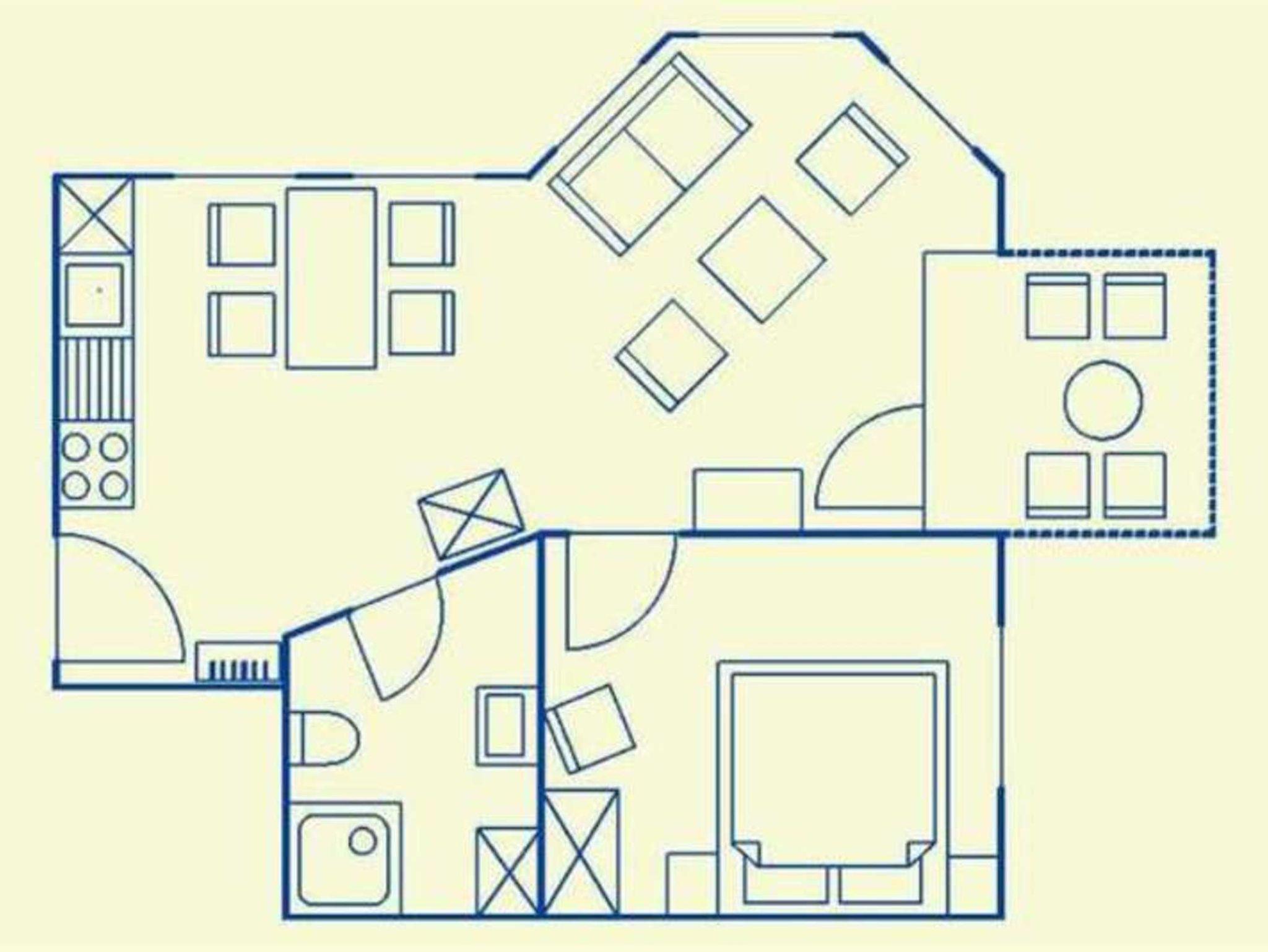 1 Schlafraum, 1 Wohnraum, 1 Küchenzeile, 1 Badezimmer mit Dusche