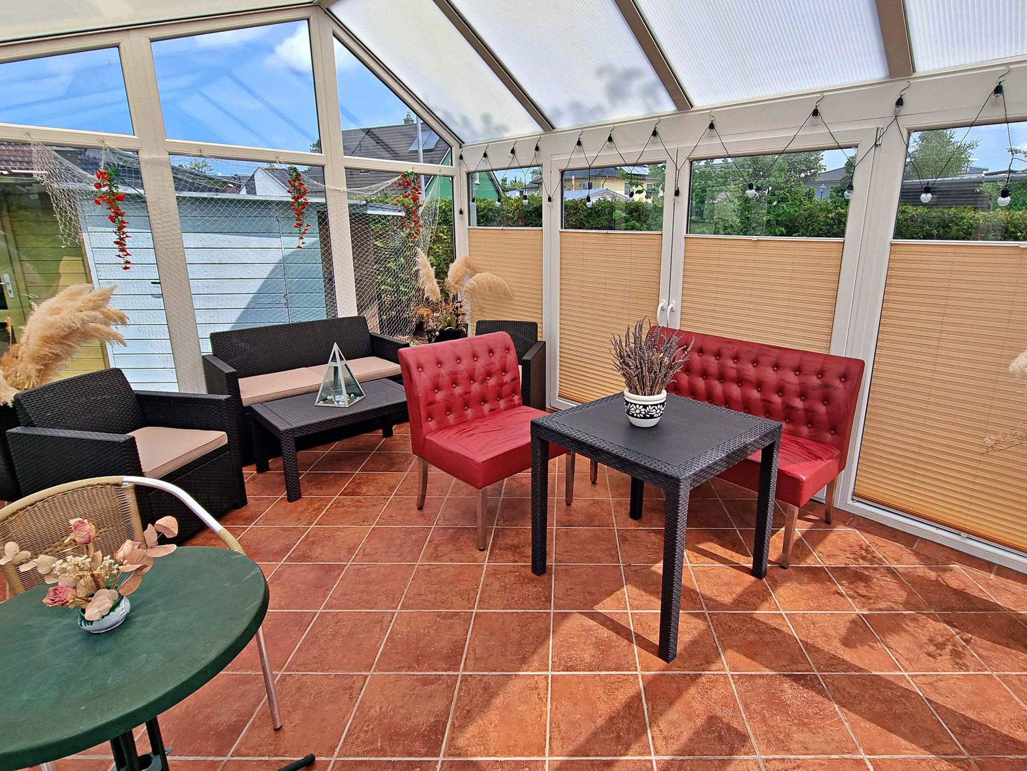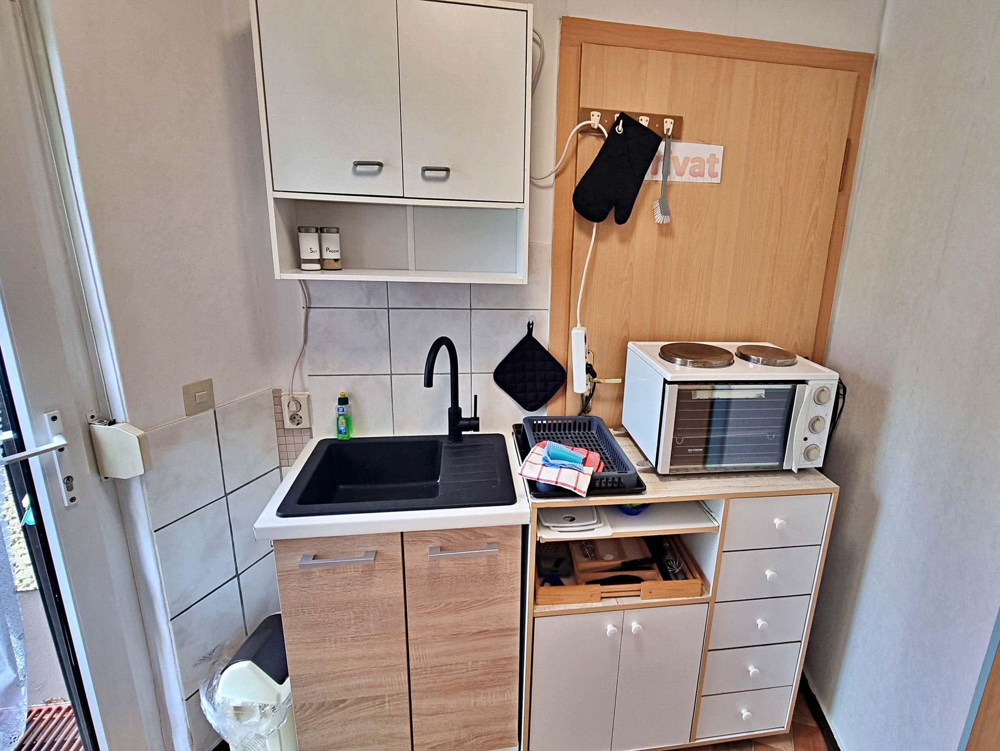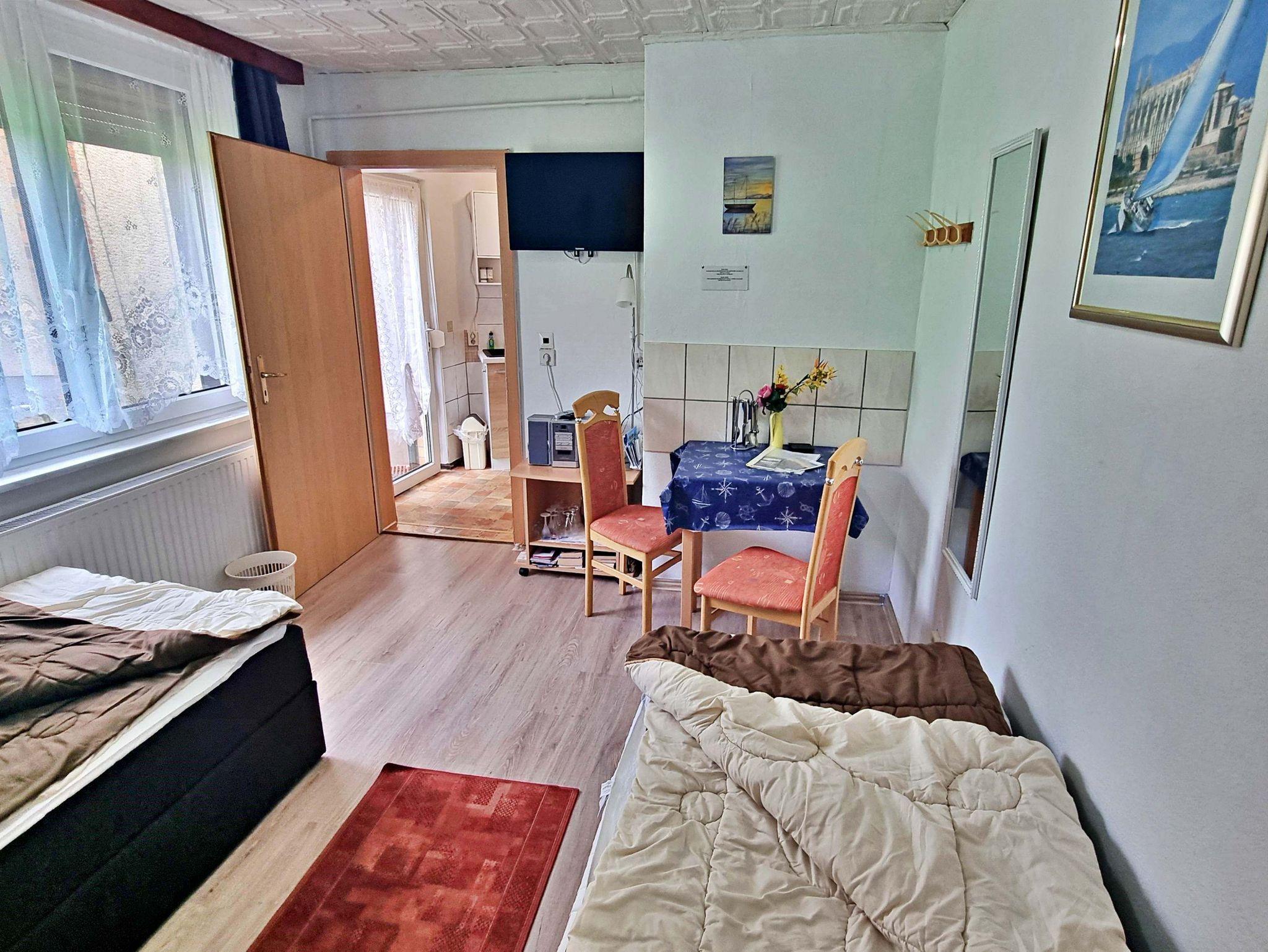 Das ca. 20 qm große freundliche 1-Raum-Appartement verfügt über einen kombinierten Wohn-Schlafraum mit zwei Einzelbetten, Flachbild-TV und einem kleinen Essplatz. Die kleine Küchenzeile ist mit einem Kühlschrank, 2-Platten-Herd, Wasserkocher, Toaster und Kaffeemaschine ausgestattet - alles da, was man braucht für das gemütliche Frühstück oder das kleine Abendessen zu zweit. Das Tageslicht-Badezimmer hat eine ebenerdige Dusche und WC. Auf der angrenzenden möblierten Terrasse können Sie bei schönem Wetter schon morgens Ihren Kaffee genießen oder den Abend bei einem Glas Wein ausklingen lassen. WLAN steht Ihnen während des gesamten Urlaubs zur Verfügung. Ihren Pkw können Sie direkt an der Unterkunft parken und Ihre Fahrräder können Sie gern im Abstellraum sicher unterstellen. Ein besonderes Highlight ist der liebevoll möblierte Gemeinschaftswintergarten, der zu geselligen Abenden einlädt. Bitte beachten Sie, dass Buchungen mit Kindern unter 4 Jahren nicht möglich sind.