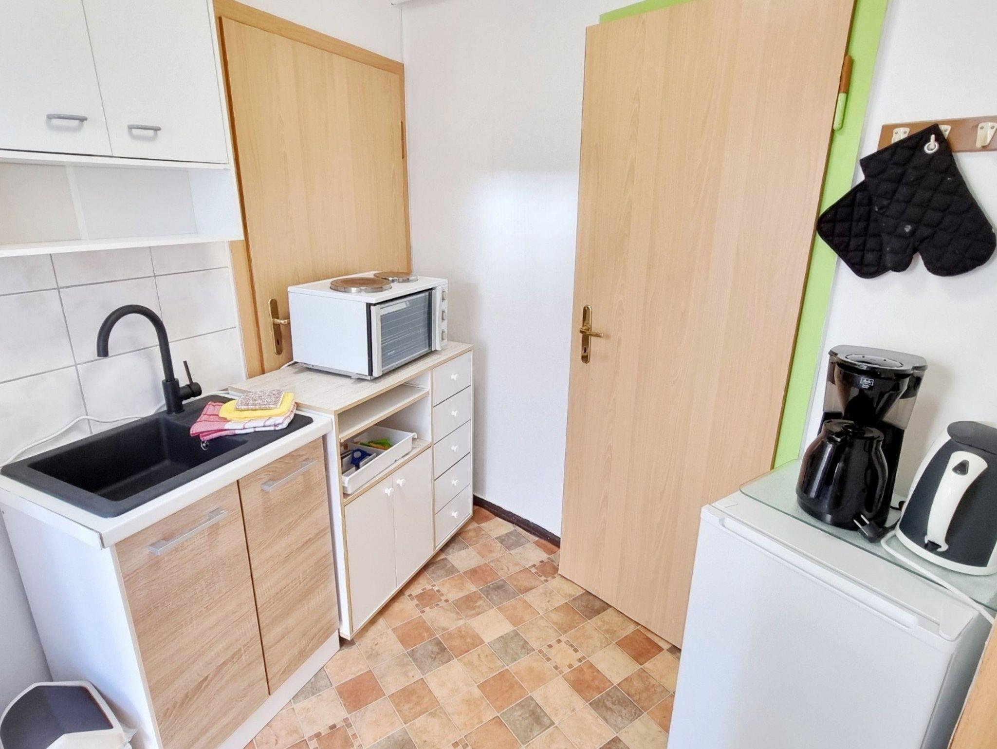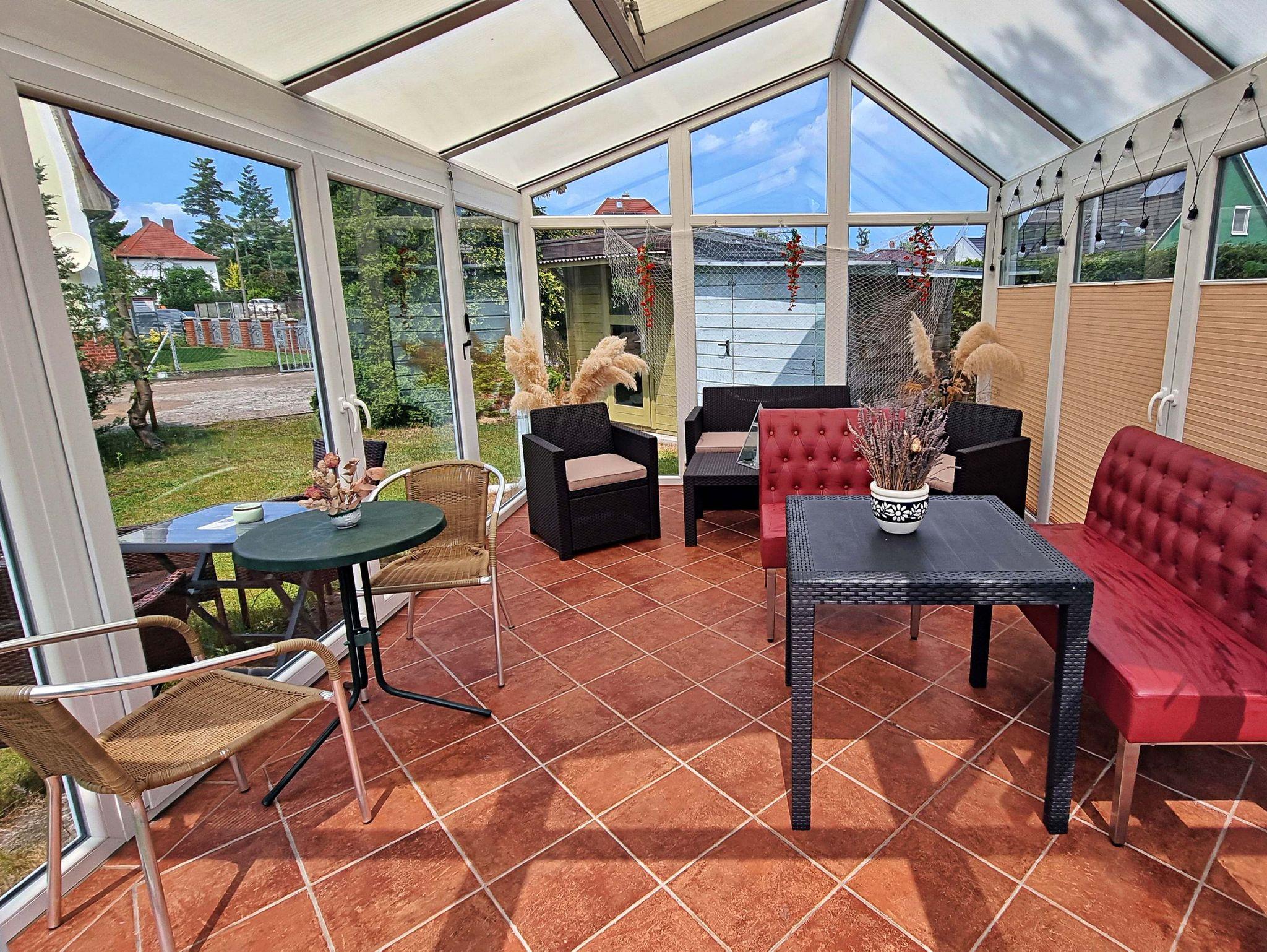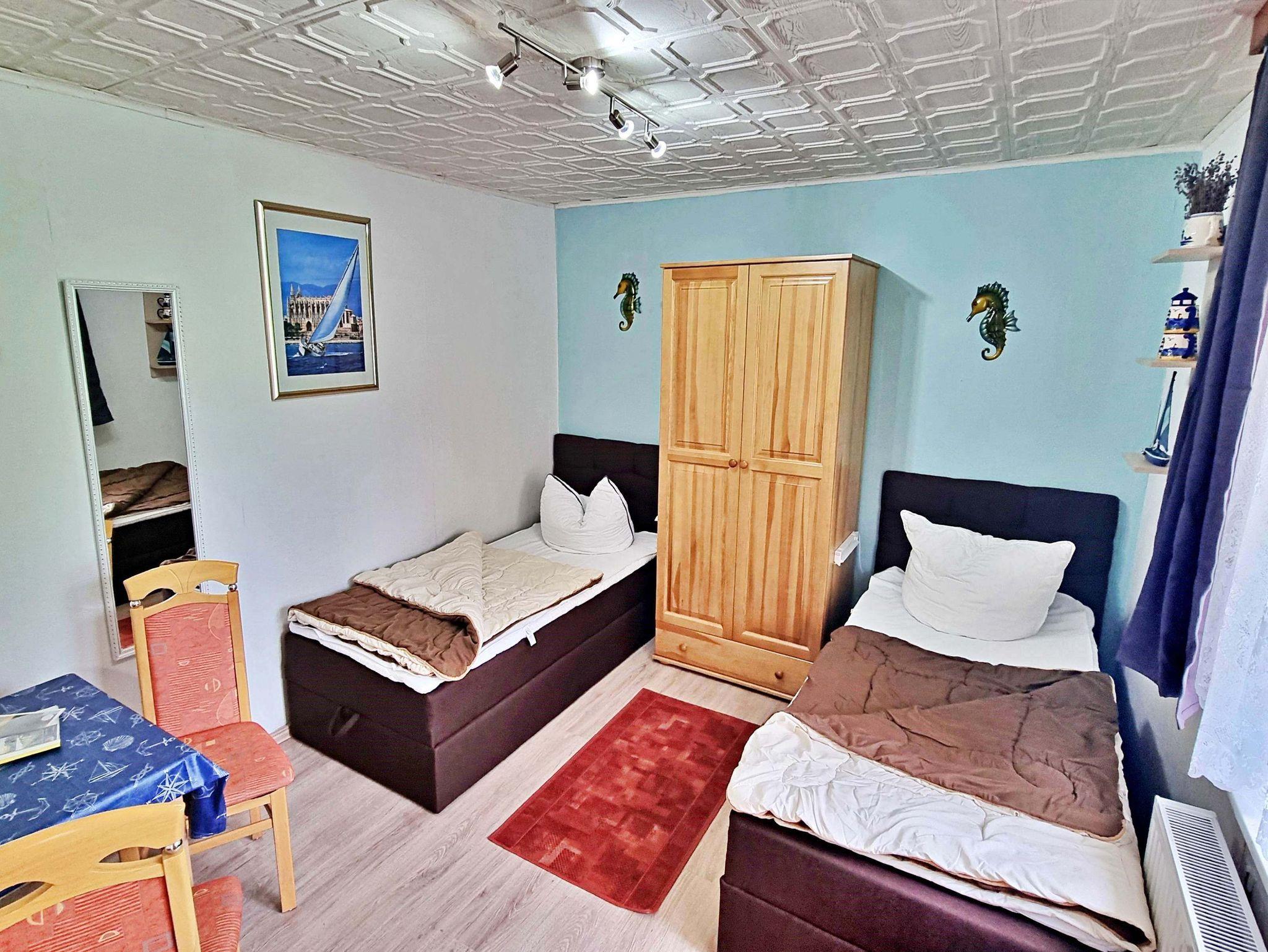 Das ca. 20 qm große freundliche 1-Raum-Appartement verfügt über einen kombinierten Wohn-Schlafraum mit zwei Einzelbetten, Flachbild-TV und einem kleinen Essplatz. Die kleine Küchenzeile ist mit einem Kühlschrank, 2-Platten-Herd, Wasserkocher, Toaster und Kaffeemaschine ausgestattet - alles da, was man braucht für das gemütliche Frühstück oder das kleine Abendessen zu zweit. Das Tageslicht-Badezimmer hat eine ebenerdige Dusche und WC. Auf der angrenzenden möblierten Terrasse können Sie bei schönem Wetter schon morgens Ihren Kaffee genießen oder den Abend bei einem Glas Wein ausklingen lassen. WLAN steht Ihnen während des gesamten Urlaubs zur Verfügung. Ihren Pkw können Sie direkt an der Unterkunft parken und Ihre Fahrräder können Sie gern im Abstellraum sicher unterstellen. Ein besonderes Highlight ist der liebevoll möblierte Gemeinschaftswintergarten, der zu geselligen Abenden einlädt. Bitte beachten Sie, dass Buchungen mit Kindern unter 4 Jahren nicht möglich sind.