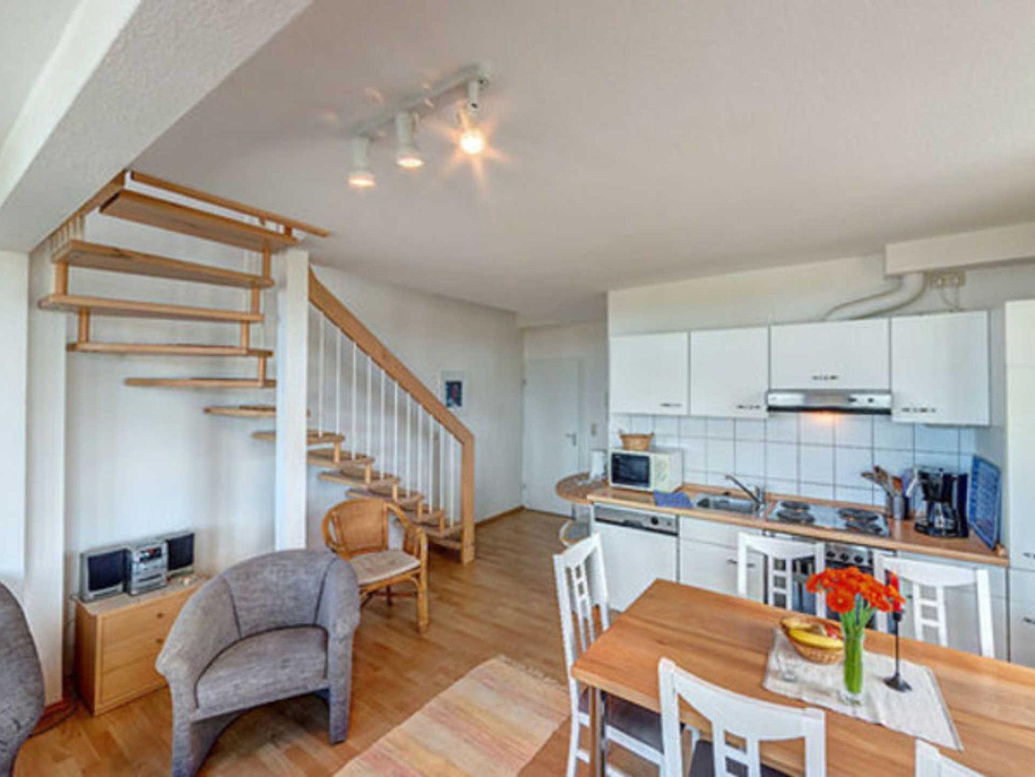 Das große 4-Zimmer-Masionette-Appartement Nr. 14 mit Seeblick und zusätzlichen Schlafraum auf der Empore befindet sich im zweiten und dritten Obergeschoss der Villa Ostseewarte. Auf der unteren Ebene befindet sich ein großer geräumiger Wohnraum mit gemütlicher Sitzgruppe, eine offene, voll ausgestattete Küche mit Kaffeemschine, Wasserkocher, Toaster, Mikrowelle, Backofen und Geschirrspüler sowie einem gemütlichen Essplatz. Das Bad auf der unteren Ebene ist mit Dusche und WC ausgestattet , das separate Schlafzimmer verfügt über ein großes Doppelbett. Ebenfalls auf der unteren Ebene befindet sich der im Sommer möblierte Balkon.