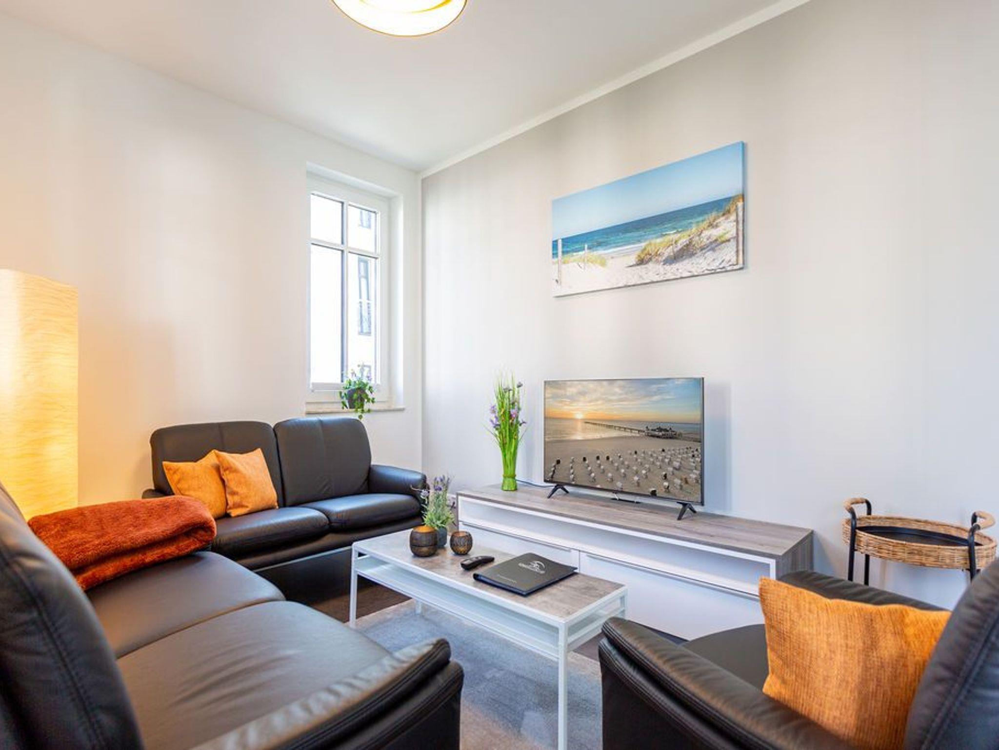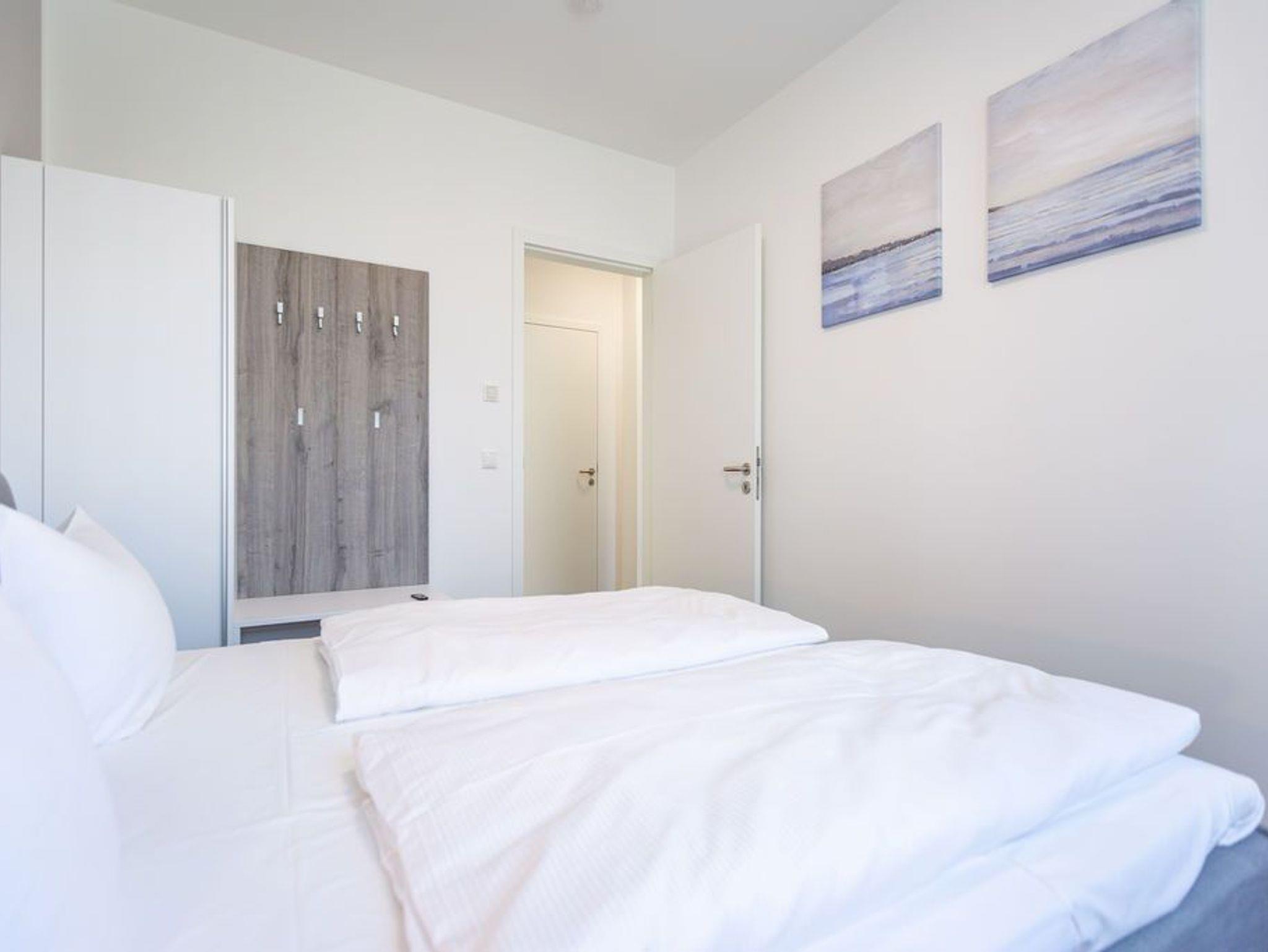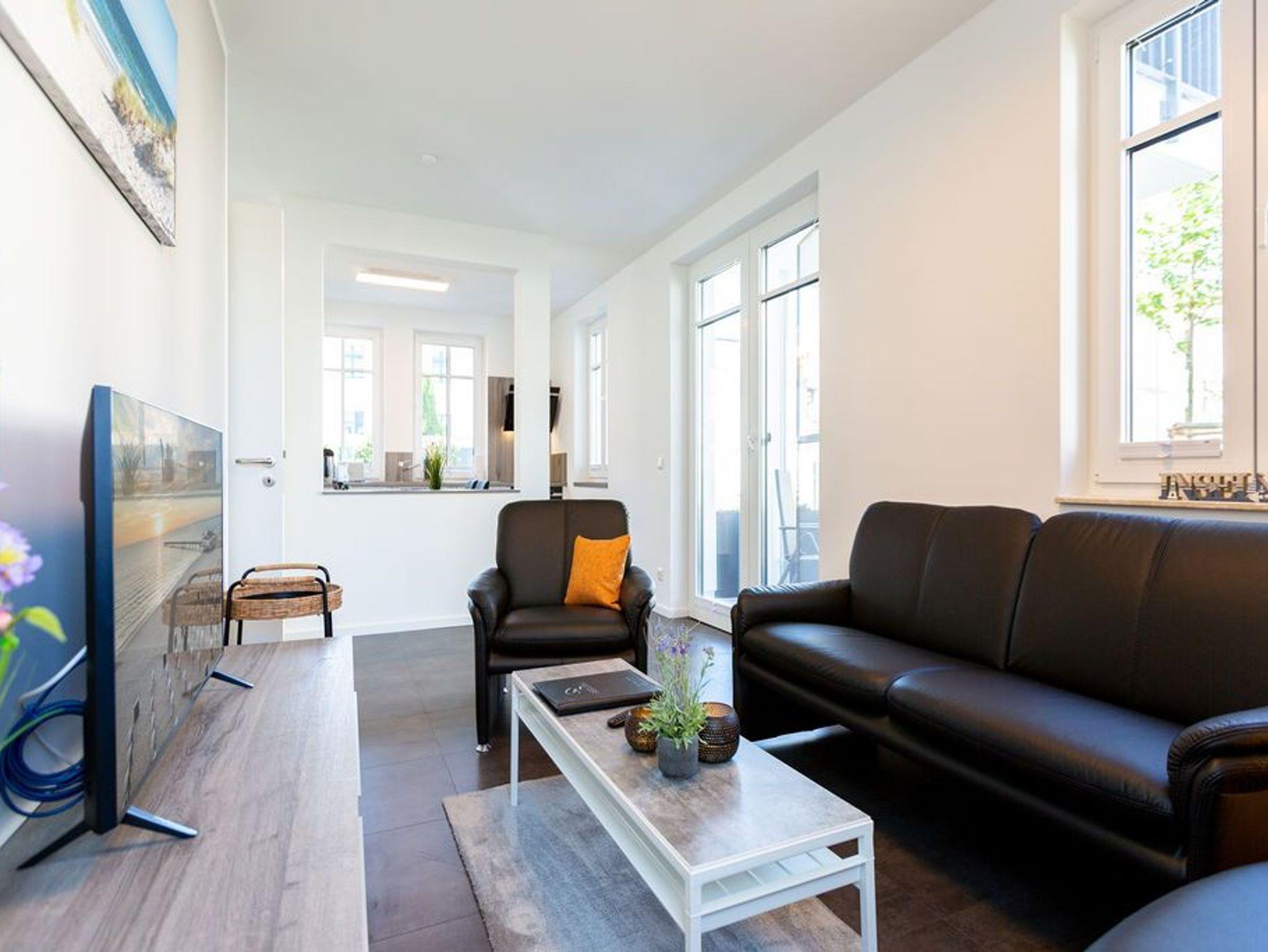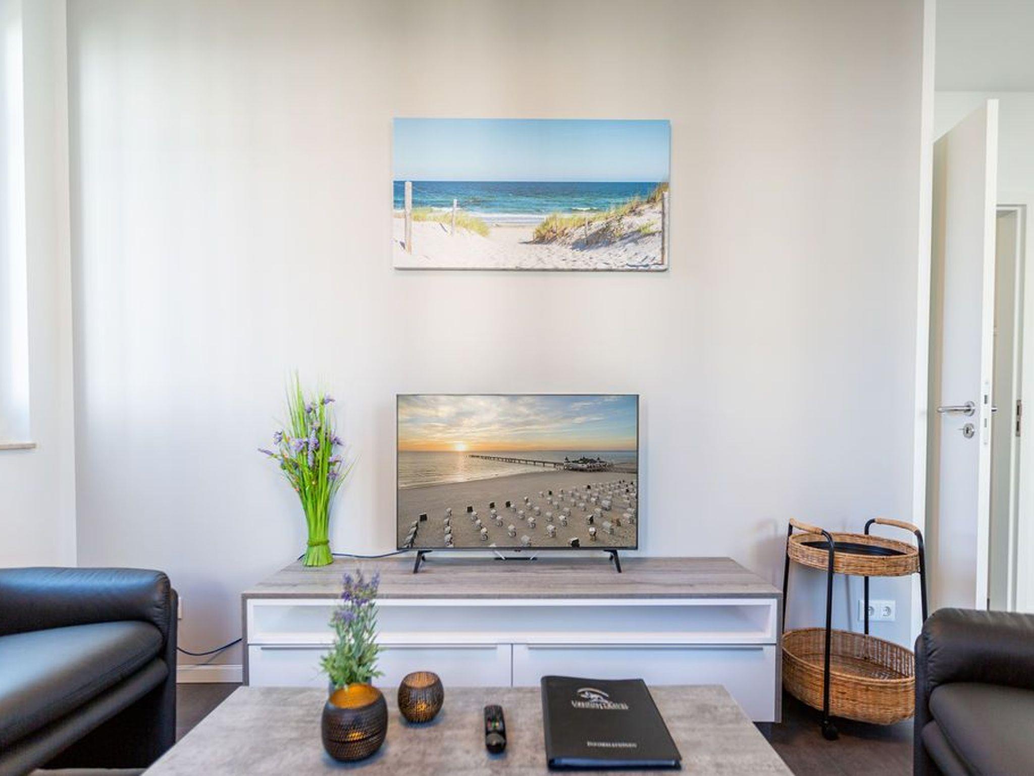 Dieses kleine, aber feine Appartement für zwei bis drei Personen und ein Kleinkind (bis 2 Jahre im Kinderreisebett) ist der ideale Ort für alle, die ein helles, modernes Domizil für ihren Usedom-Urlaub suchen. Hier ist Wohlfühlen auf 59 Quadratmetern garantiert. Das sich im Erdgeschoss befindliche Appartement bietet Zugang zu einer 6 Quadratmeter großen Nord-Ost-Terrasse, die Sie mit Gartenmöbeln für bis zu 4 Personen empfängt. Der Wohnbereich des 3-Raum-Appartements überzeugt durch eine helle und offene Gestaltung. Der perfekte Ort, um nach einem ausgiebigen Strandtag auf der gemütlichen Sofalandschaft vor dem Flat-TV zu entspannen. Die an das Wohnzimmer angrenzende moderne Küche lässt beim Zubereiten Ihrer Speisen keine Wünsche offen. Ob Induktionskochfeld, Backofen, Spülmaschine, Kühlschrank sowie Kleinküchengeräte (Kaffeemaschine, Toaster, Wasserkocher) - hier macht das Kochen auch im Urlaub Spaß. In diesem Appartement müssen Sie nicht auf erholsamen Schlaf verzichten. Das bequeme Boxspringbett (2,00 x 1,40m) im Hauptschlafzimmer lädt zum ausgiebigen Verweilen ein. Eine Schlafcouch (2,00 x 1,20m) wartet in einem weiteren Schlafraum auf eine mitreisende Person. Das wunderbar moderne Badezimmer mit Tageslicht verfügt über Waschtisch, Dusche und WC sowie einer Waschmaschine. Ihren geliebten Vierbeiner (max. Höhe 39cm und gegen Haustierendreinigung von 35,00 EUR) dürfen Sie ebenso mitbringen, wie Ihre Fahrräder, die in einem separaten Fahrradraum Unterstand finden. Ein PKW-Stellplatz in der hauseigenen Tiefgarage gehört ebenso zu diesem Appartement wie kostenfreies W-Lan. Bei Ihrer Anreise sind die Betten bereits bezogen und Handtücher liegen für Sie bereit.