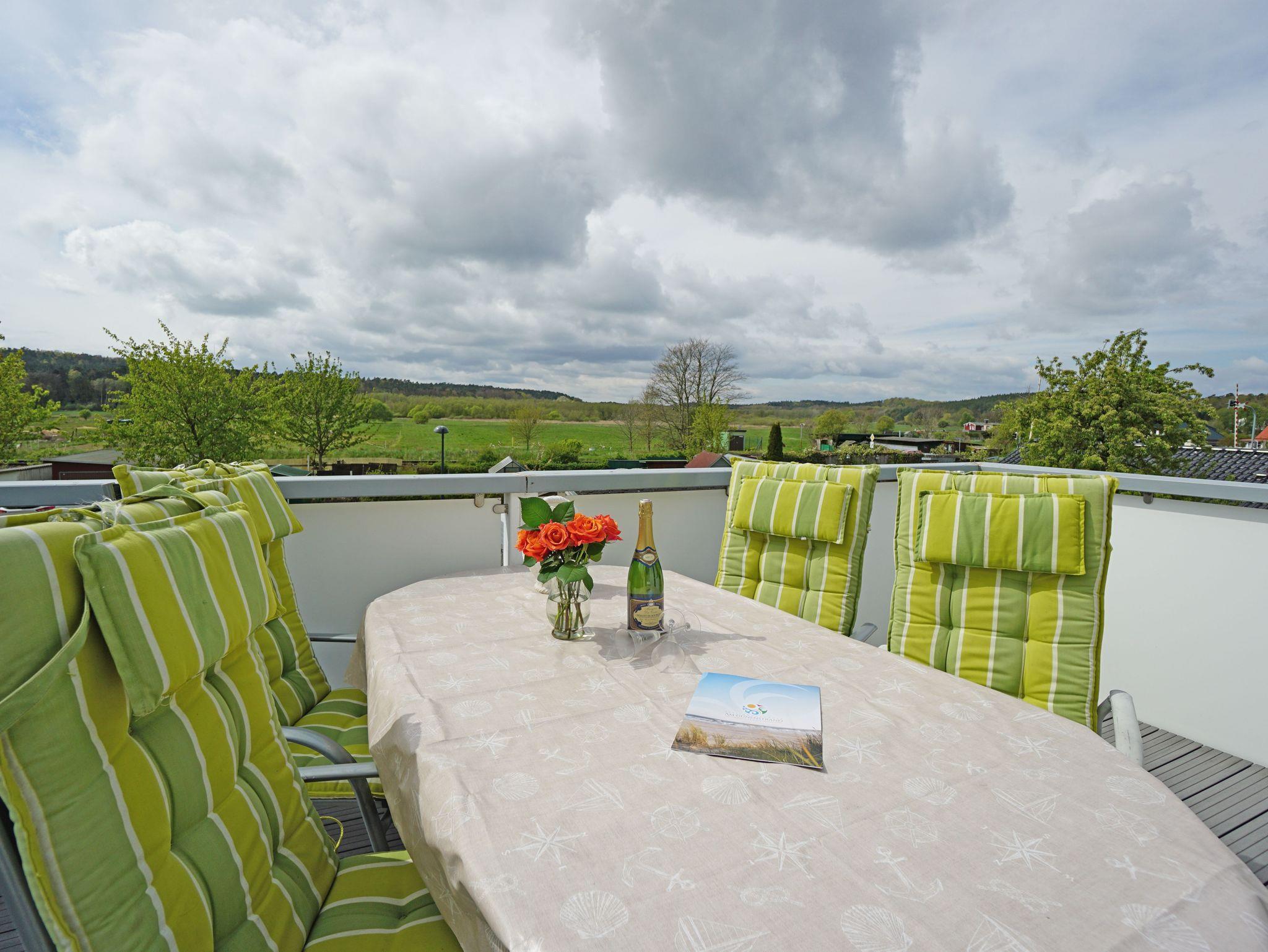 Moderne Ferienwohnung Wiesenblick in Ahlbeck mit großer Sonnenterrasse und Blick auf die Wiesen.
