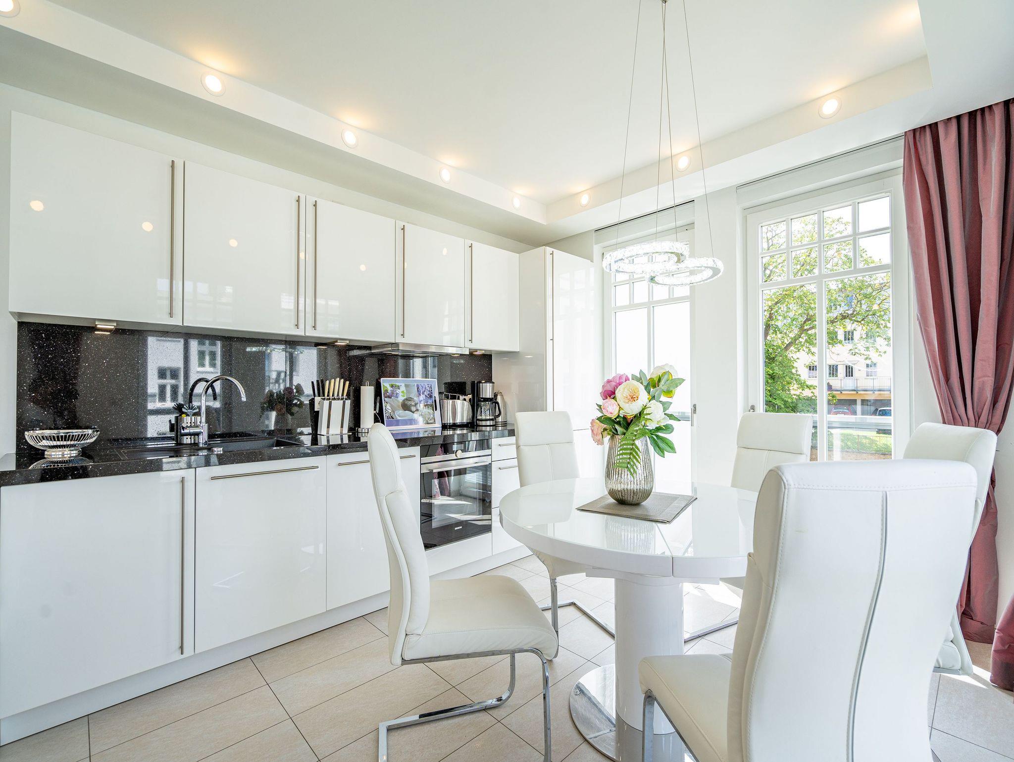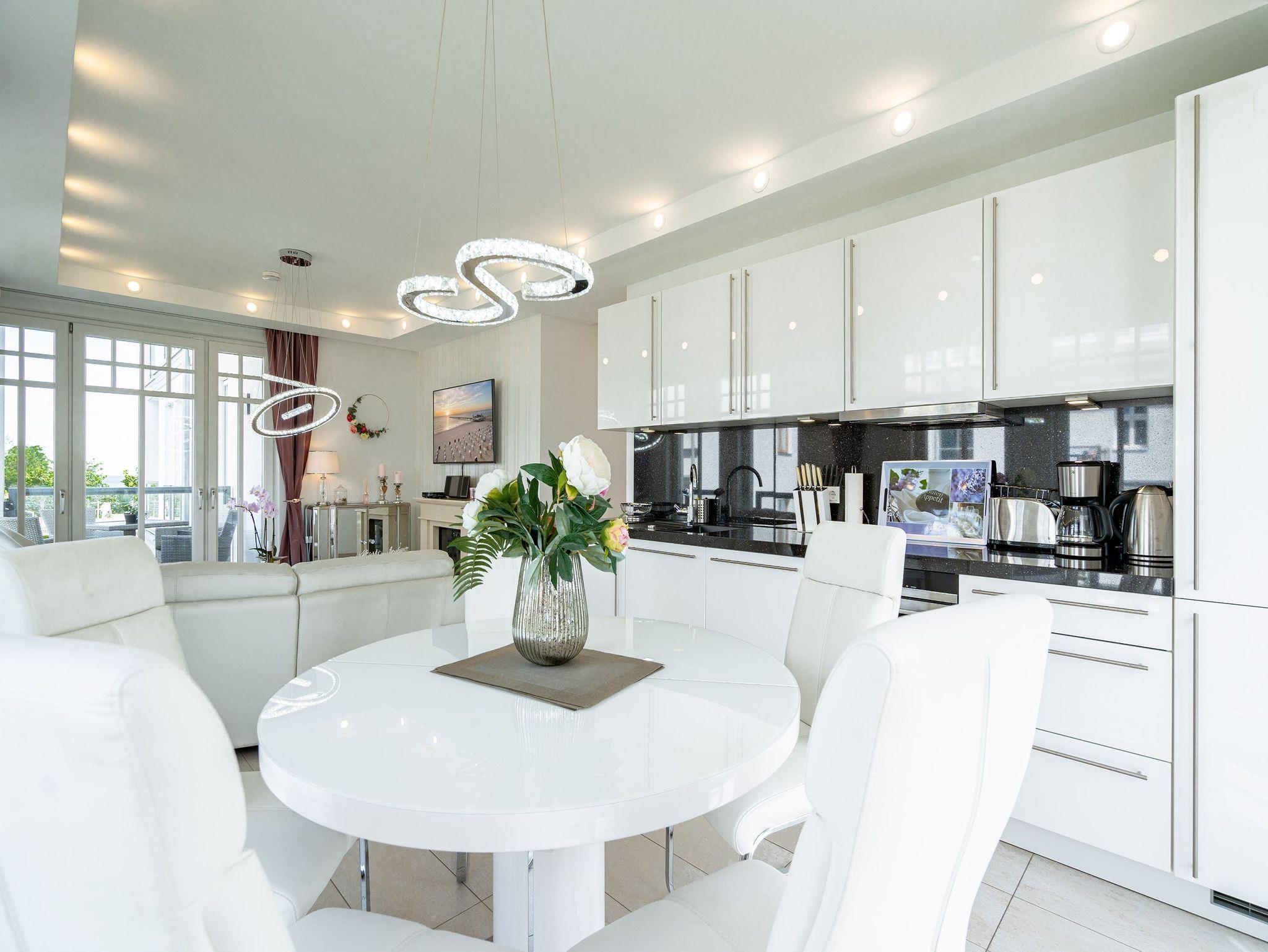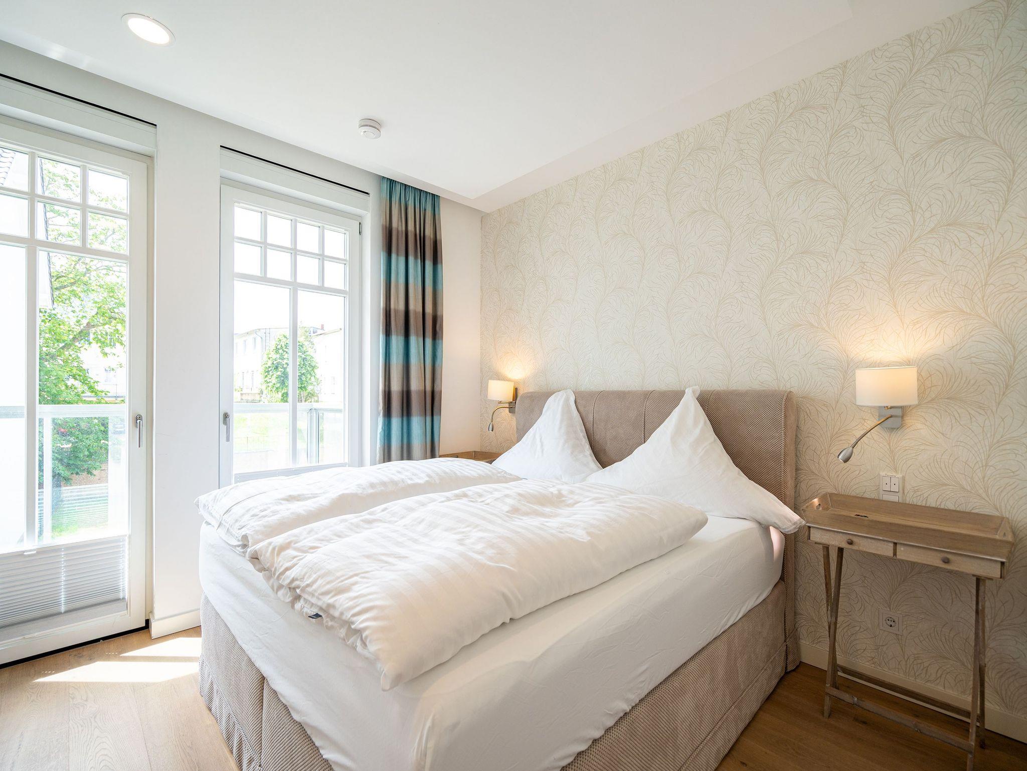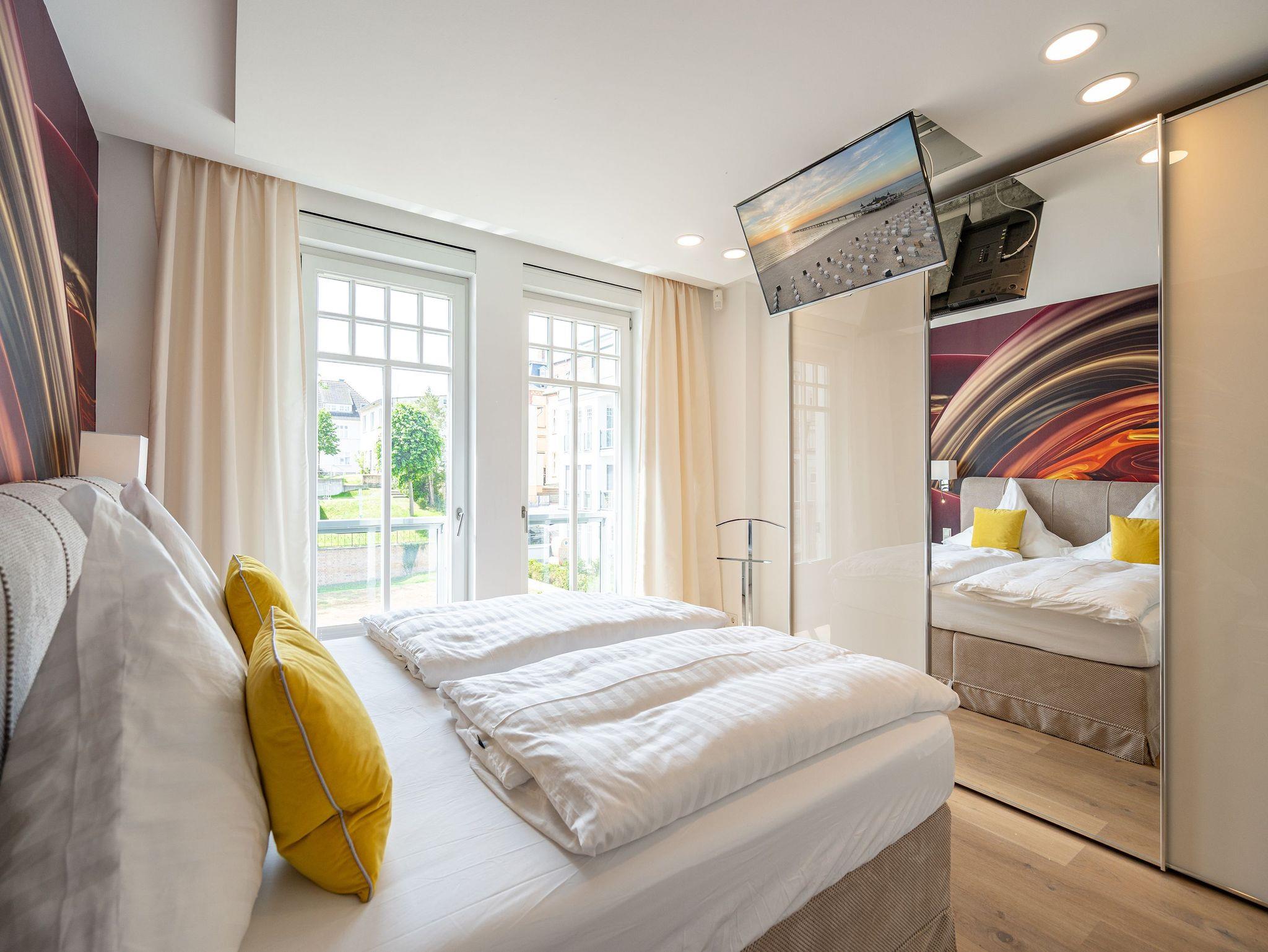 Willkommen in der Villa Westend - Appartement 10! Diese geräumige 3-Raum-Ferienwohnung im 1. Obergeschoss bietet Ihnen auf 84 Quadratmetern Platz für bis zu 4 Personen und 1 Kleinkind (bis 2 Jahre im Kinderreisebett). Der offene, helle Wohnbereich lädt mit einer gemütlichen Sitzgruppe, einem Flat-TV, Blue Ray Player, DVD Player, Radio und einem Elektrokamin mit Fernbedienung zum Entspannen ein. Die voll ausgestattete Küchenzeile verfügt über einen Backofen, ein Induktionsfeld, ein Mikrowellenkombigerät mit Grill, eine Spülmaschine, eine Kühlschrank- Gefrierkombination und eine Nespresso-Kapselmaschine. Hier können Sie Ihre Lieblingsgerichte zubereiten und diese am Essplatz genießen. Die Wohnung bietet zwei Schlafzimmer mit komfortablen Boxspringdoppelbetten (1,80 m x 2,00 m), Kleiderschrank und Flat-TV. Für Ihre Erholung stehen Ihnen zwei innenliegende Bäder zur Verfügung, jeweils mit Dusche, Waschtisch und WC. Ein Bad ist zusätzlich mit einer Finnischen Sauna (nutzbar zwischen 15°° - 21°° Uhr) ausgestattet, in der Sie wunderbar entspannen können. Als zusätzlichen Komfort können Sie den Waschtrockner kostenfrei nutzen. Die Ferienwohnung bietet Ihnen einen Nord-Ost-Balkon mit Meerblick, auf dem Sie den Tag mit einer Tasse Kaffee beginnen können, sowie einen kleinen Süd-West-Balkon. Ein PKW-Stellplatz in der Tiefgarage (Nr. 36) steht Ihnen ebenfalls zur Verfügung. Das WLAN-Netz in der Wohnung ist kostenfrei nutzbar.