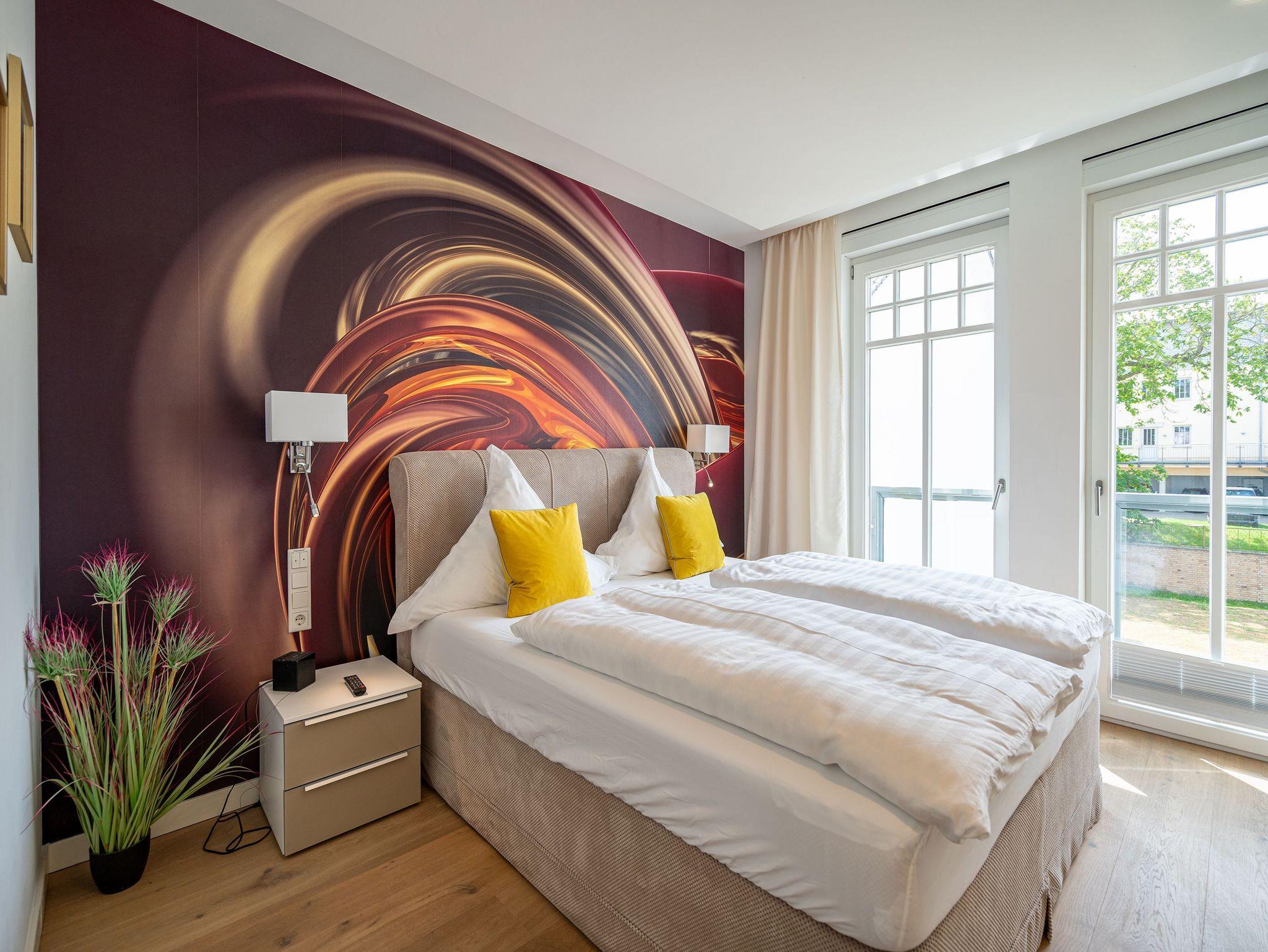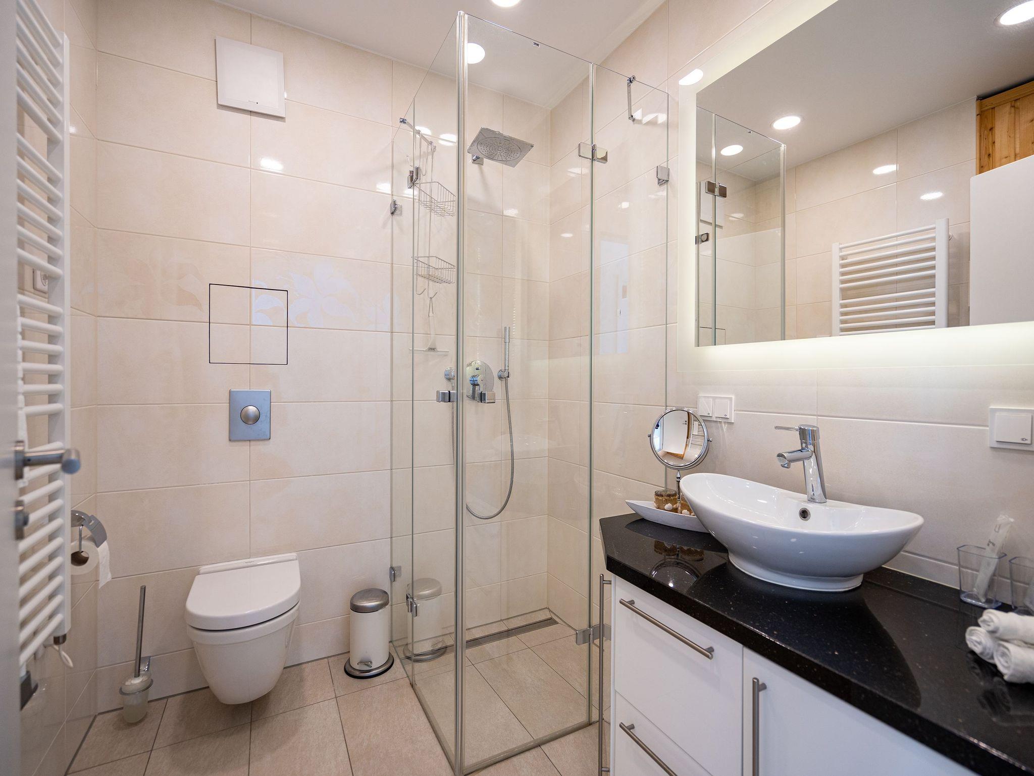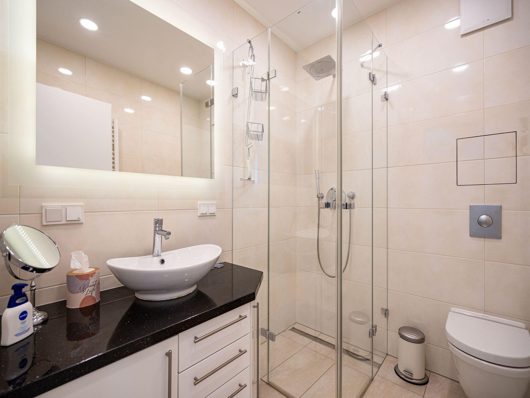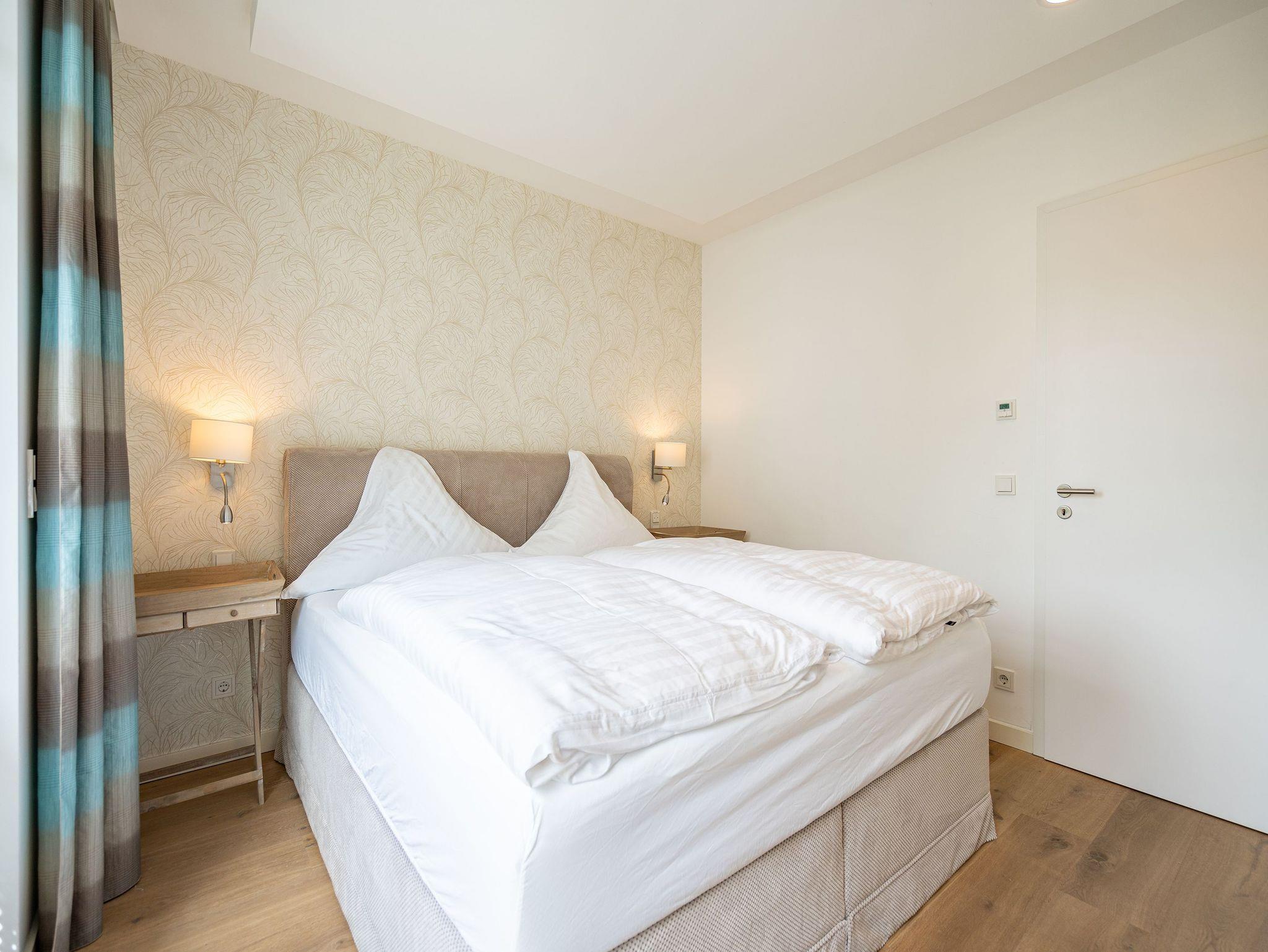 Willkommen in der Villa Westend - Appartement 10! Diese geräumige 3-Raum-Ferienwohnung im 1. Obergeschoss bietet Ihnen auf 84 Quadratmetern Platz für bis zu 4 Personen und 1 Kleinkind (bis 2 Jahre im Kinderreisebett). Der offene, helle Wohnbereich lädt mit einer gemütlichen Sitzgruppe, einem Flat-TV, Blue Ray Player, DVD Player, Radio und einem Elektrokamin mit Fernbedienung zum Entspannen ein. Die voll ausgestattete Küchenzeile verfügt über einen Backofen, ein Induktionsfeld, ein Mikrowellenkombigerät mit Grill, eine Spülmaschine, eine Kühlschrank- Gefrierkombination und eine Nespresso-Kapselmaschine. Hier können Sie Ihre Lieblingsgerichte zubereiten und diese am Essplatz genießen. Die Wohnung bietet zwei Schlafzimmer mit komfortablen Boxspringdoppelbetten (1,80 m x 2,00 m), Kleiderschrank und Flat-TV. Für Ihre Erholung stehen Ihnen zwei innenliegende Bäder zur Verfügung, jeweils mit Dusche, Waschtisch und WC. Ein Bad ist zusätzlich mit einer Finnischen Sauna (nutzbar zwischen 15°° - 21°° Uhr) ausgestattet, in der Sie wunderbar entspannen können. Als zusätzlichen Komfort können Sie den Waschtrockner kostenfrei nutzen. Die Ferienwohnung bietet Ihnen einen Nord-Ost-Balkon mit Meerblick, auf dem Sie den Tag mit einer Tasse Kaffee beginnen können, sowie einen kleinen Süd-West-Balkon. Ein PKW-Stellplatz in der Tiefgarage (Nr. 36) steht Ihnen ebenfalls zur Verfügung. Das WLAN-Netz in der Wohnung ist kostenfrei nutzbar.