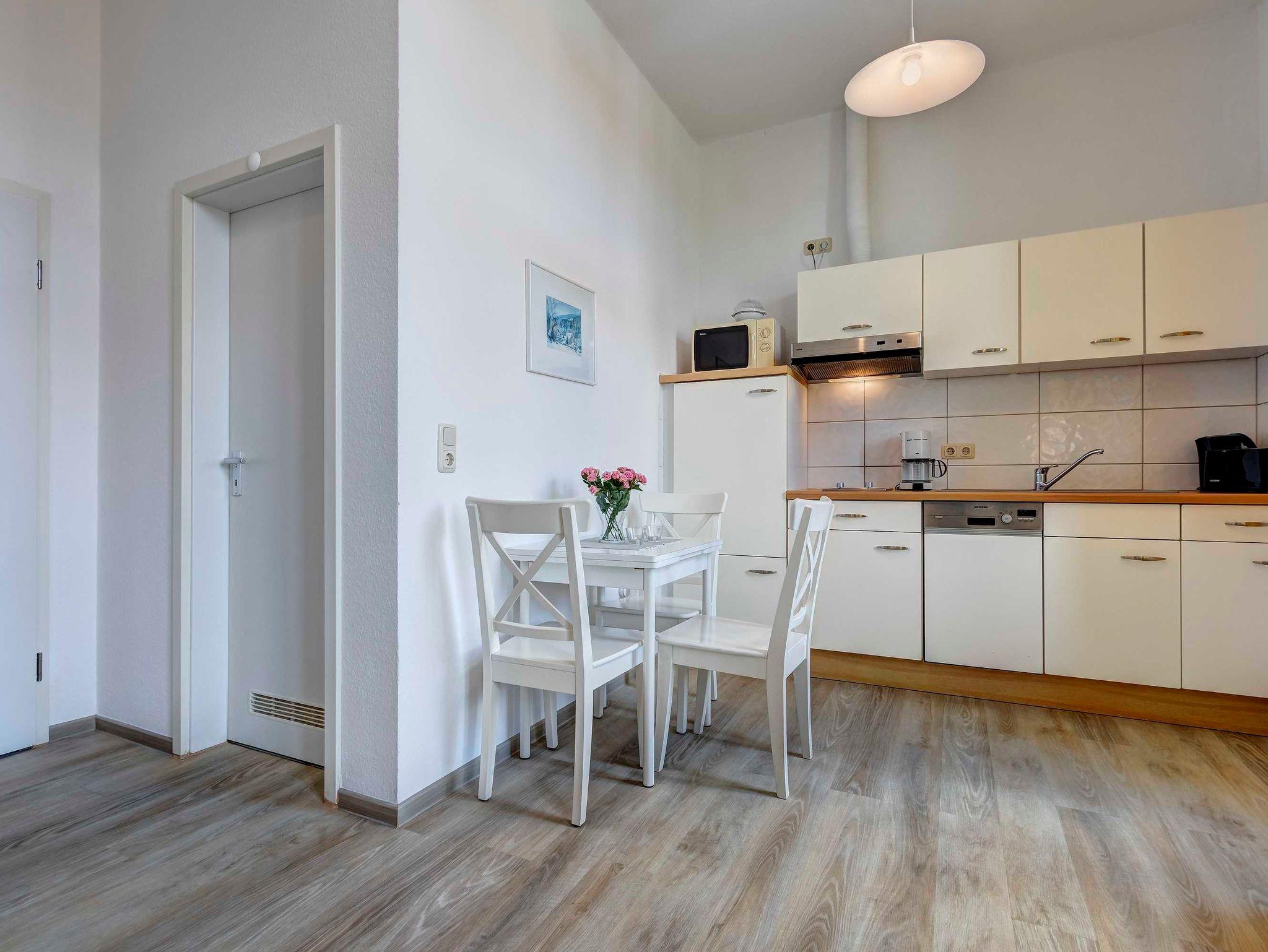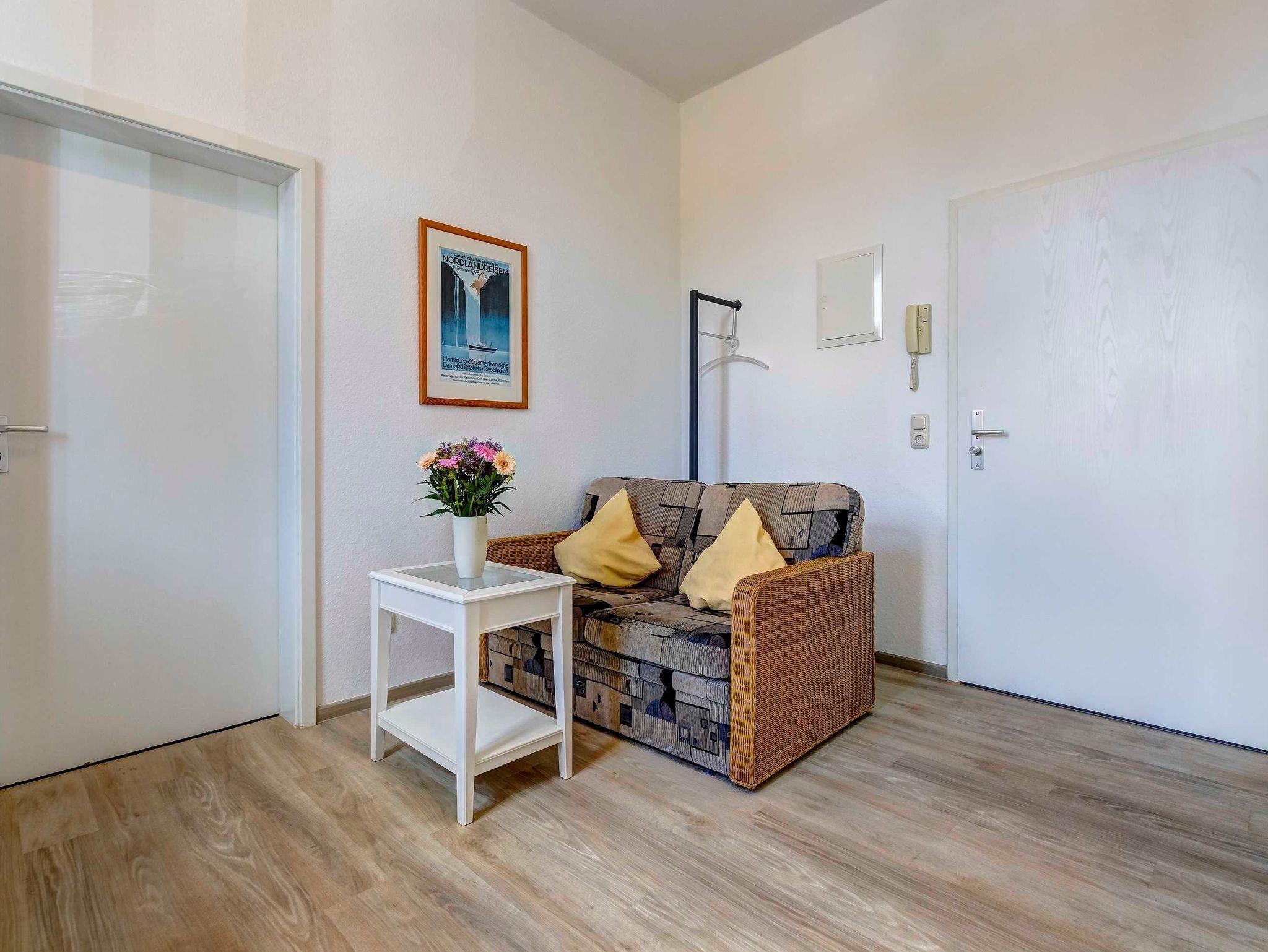 Das gemütliche 2-Zimmer-Appartement Nr. 7 befindet sich im ersten Obergeschoss der Villa Ostseewarte. Es verfügt über ein separates Schlafzimmer mit einem Doppelbett und einen Wohnbereich mit gemütlicher Sitzgruppe und integrierter voll ausgestatteten Küche mit Kaffeemaschine, Wasserkocher, Toaster, Mikrowelle sowie einem Essplatz. Das Bad ist mit Dusche und WC ausgestattet. Zum Appartement gehört darüber hinaus ein möblierter Südbalkon. Ein Pkw-Stellplatz steht Ihnen auf dem Grundstück kostenfrei zur Verfügung und Ihre Fahrräder können Sie ebenfalls auf dem Grundstück in einem separaten Abstellraum unterbringen. Alle Wohnungen in der Villa Ostseewarte haben passwortgeschütztem DSL-WLAN Internetzugang (gerätegebunden, Euro 1,50 pro Tag und Gerät). Ein FAHRSTUHL wurde nachträglich eingebaut. Eine Waschmaschine können Sie gegen Gebühr gern nutzen (Münzgerät).