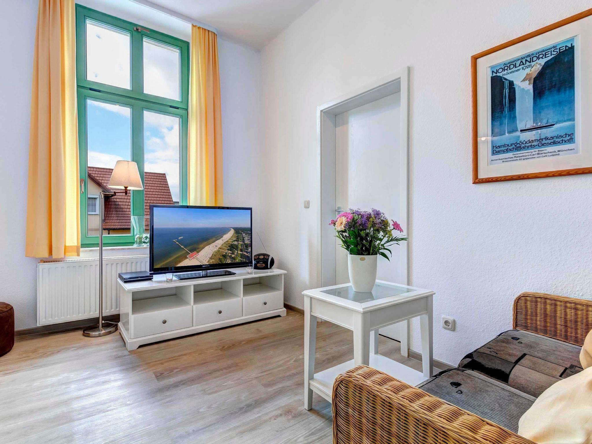 STRANDNAH mit SÜDBALKON! Nur ca. 100 m zur Strandpromenade! Schönes 2-Zimmer-Apartment mit gemütlicher und guter Ausstattung. Separates Schlafzimmer, Wohnzimmer mit Küchenzeile und Essplatz, Duschbad, Südbalkon. Die Wohnung verfügt über einen Pkw-Stellplatz . Abstellraum für Fahrräder und ähnliches ist vorhanden. Eine Sauna in der Villa Germania kann kostenpflichtig genutzt werden. Vom Haus aus können Sie das Ortszentrum und die bekannte Ahlbecker Seebrücke in ca. 3 bzw. 5 Minuten zu Fuß erreichen.