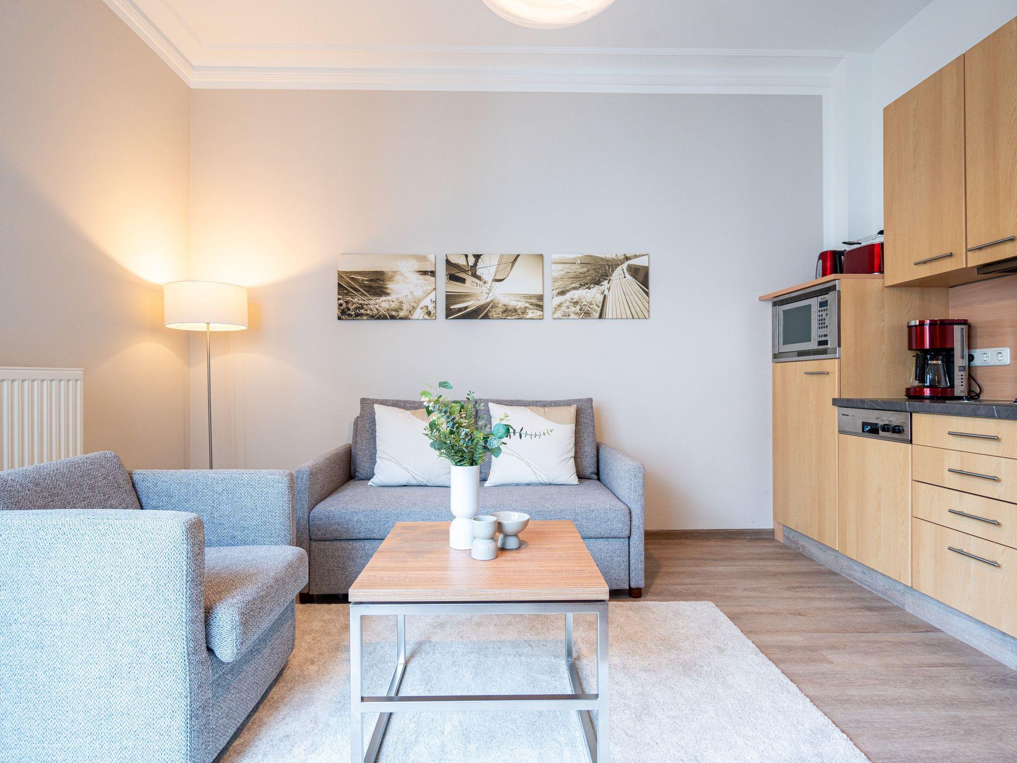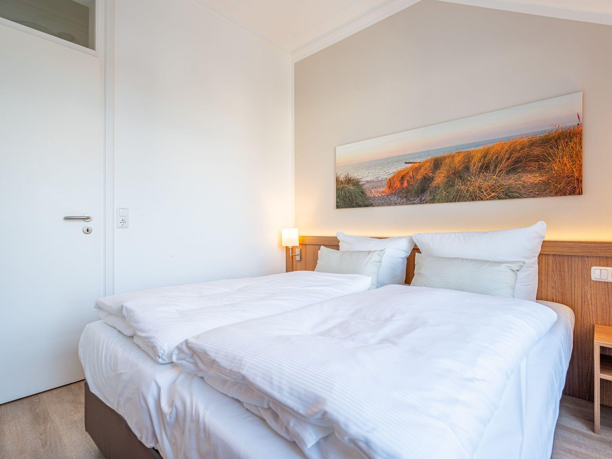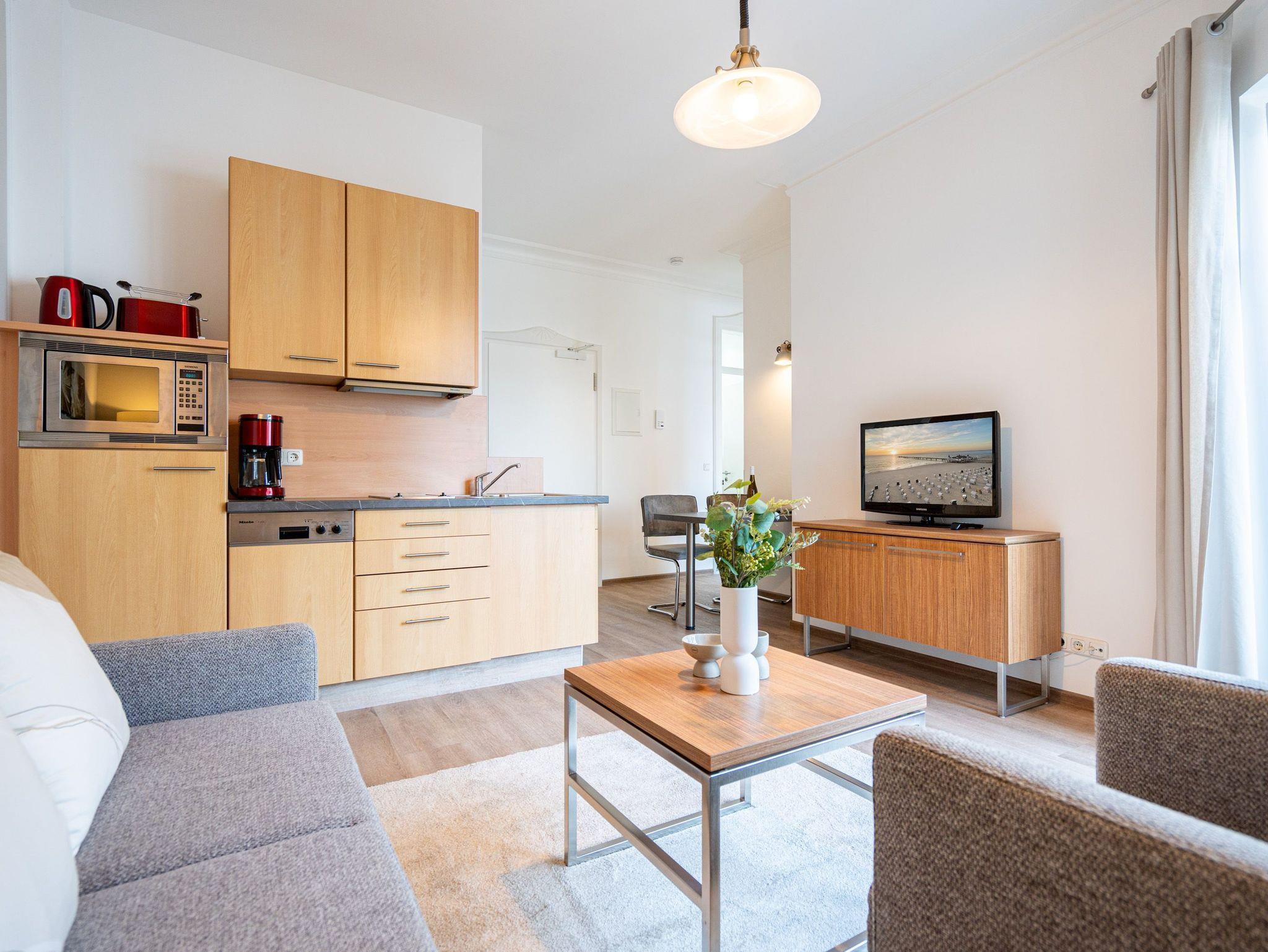 Die 2-Raum-Ferienwohnung Nr. C13 in der Villa Seedüwel bietet auf 38 qm komfortablen Platz für zwei Personen und befindet sich im 2. Obergeschoss. Der offene Wohnbereich ist mit einer gut ausgestatteten Küchenzeile versehen, die ein 2-Platten-Cerankochfeld, eine Mikrowelle und einen Kühlschrank mit Gefrierfach umfasst. Ein Essplatz für zwei Personen, eine gemütliche Sitzgruppe sowie ein Flat-TV vervollständigen das Wohnzimmer. Von hier aus gelangen Sie auf den sonnigen Süd-Ost-Balkon. Das Schlafzimmer ist mit einem Doppelbett (1,60 m x 2,00 m) und einem Kleiderschrank ausgestattet. Das innenliegende Bad verfügt über eine Dusche und ein Waschbecken, zudem gibt es ein separates WC. Ein Stellplatz in der Tiefgarage ( Einfahrthöhe 2,03m) des benachbarten Hauses „Strandterrasse“ ist für Sie reserviert. WLAN steht Ihnen kostenfrei zur Verfügung.