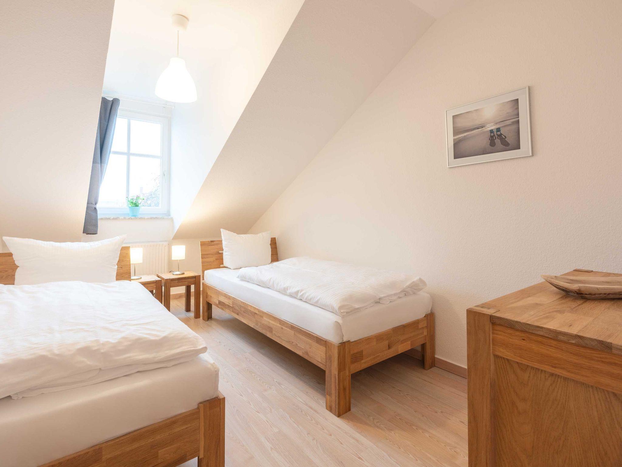Das ca 72 qm große Appartement Meeresbrise verfügt über zwei Schlafzimmer (ein Doppelbett und zwei Einzelbetten), ein Bad mit Waschtisch, Dusche und WC sowie über ein Wohnzimmer mit offener Küche.
