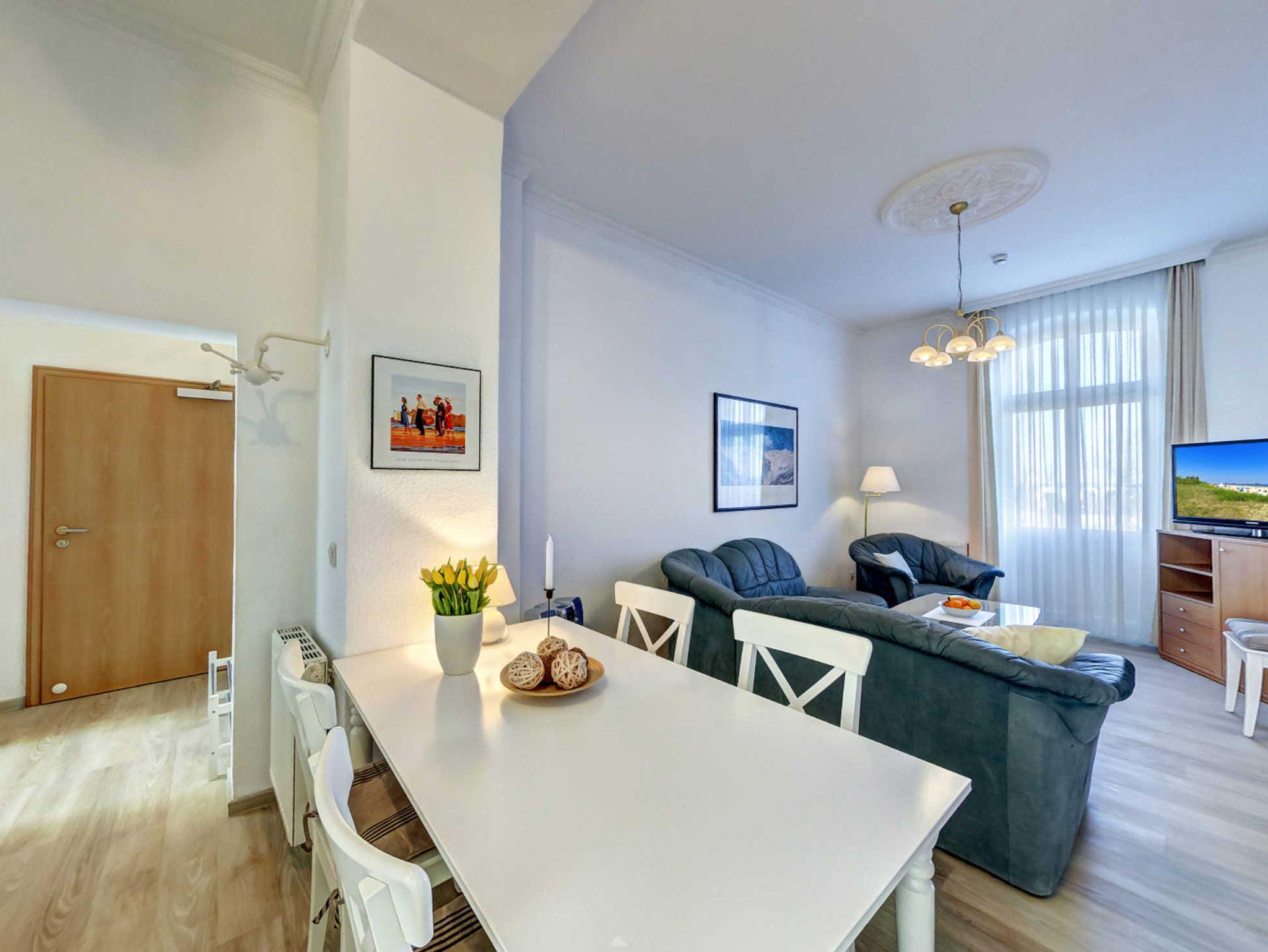 Das komfortable 4-Zimmer-Appartement EG 2 befindet sich im Erdgeschoss der Villa Germania nur 40 Meter vom Strand entfernt. Es verfügt über 3 separate Schlafzimmer mit je einem Doppelbett, einen geräumigen Wohnraum mit gemütlicher Sitzgruppe und einem Essbereich. Die separate Küche ist mit Kaffeemaschine, Wasserkocher, Toaster, Mikrowelle voll ausgestatteten und hat einen zusätzlichen Essbereich. Das Bad ist mit Dusche und WC ausgestattet und das Appartement verfügt über ein zusätzliches Gäste-WC. Vom Wohnraum haben Sie direkten Zugang in den großen möblierten Gartenbereich sowie die Terrasse. Ein Pkw-Stellplatz steht Ihnen auf dem Grundstück kostenfrei zur Verfügung und Ihre Fahrräder können Sie ebenfalls auf dem Grundstück in einem separaten Abstellraum unterbringen. Alle Wohnungen in der Villa Germania haben passwortgeschütztem DSL-WLAN Internetzugang (gerätegebunden, Euro 1,50 pro Tag und Gerät). Eine Waschmaschine, einen Trockner und den Saunabereich mit Ruheraum können Sie jeweils gegen Gebühr nutzen (Münzgeräte).