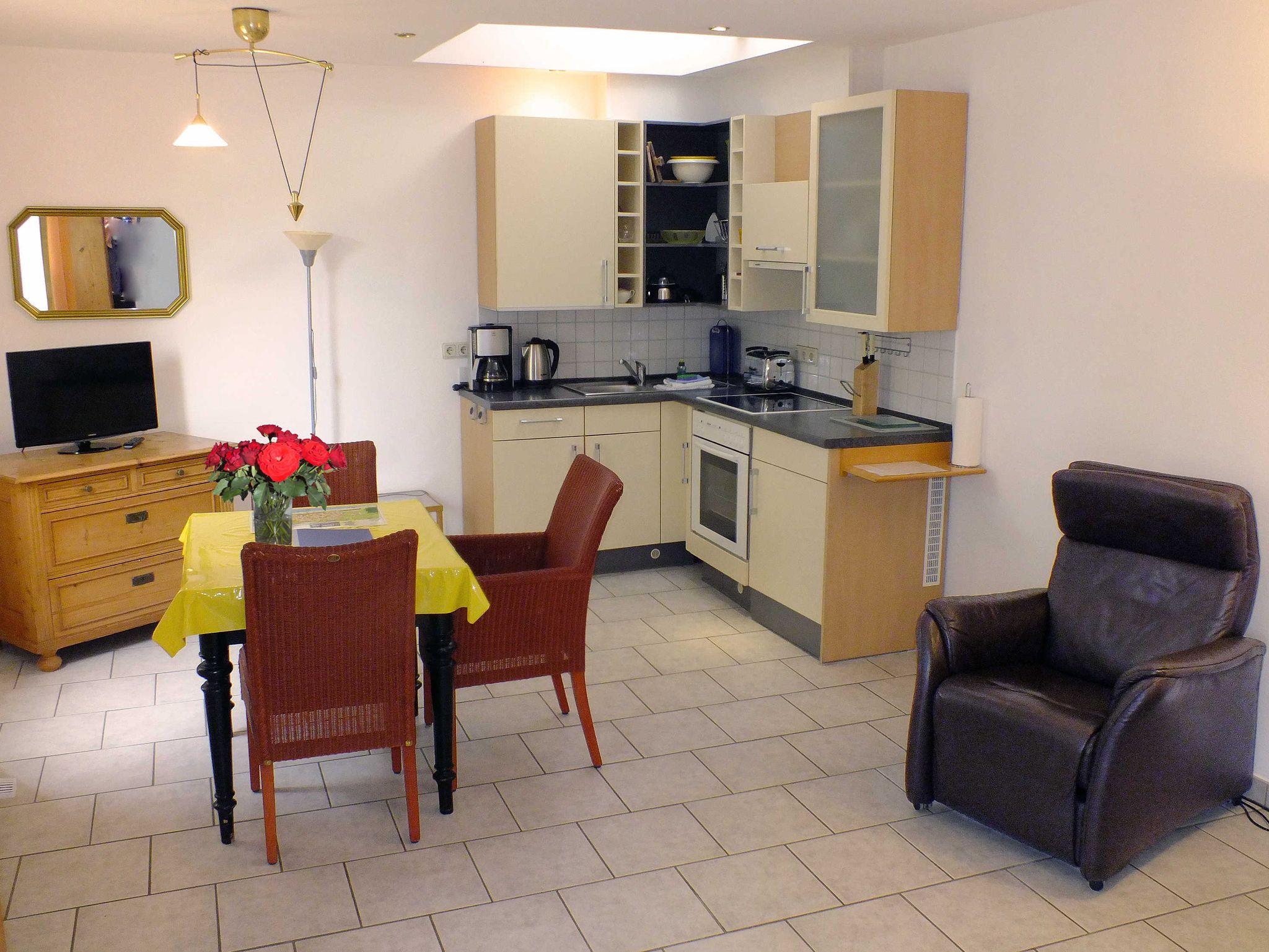 Dieses moderne rollstuhlfreundliche 37 qm große 2-Raum-Appartement befindet sich im Erdgeschoss im Nebengebäude der Villa und ist mit einem kombinierten Wohn- und Schlafraum mit TV, Esstisch mit Stühlen, elektrischem Liegesessel, Kleiderschrank, Schlafsofa mit einer Liegefläche von 1,60 x 2,00 m sowie einer Küchenzeile mit 3-Platten-Herd, Backofen, Spüle, Kühlschrank, Kaffeemaschine, Toaster, Geschirr uvm. ausgestattet. Der Schlafraum verfügt über ein Doppelbett (1,80 x 2,00 m) mit Motorlattenrosten. Das Bad hat neben einer ebenerdigen Dusche auch eine behindertenfreundliche Toilette mit Haltegriffen sowie ein unterfahrbares Waschbecken. Das Appartement ist vollständig gefliest, verfügt über einen separaten Eingang und eine eigene Terrasse, die zum Sitzen und Verweilen einlädt.