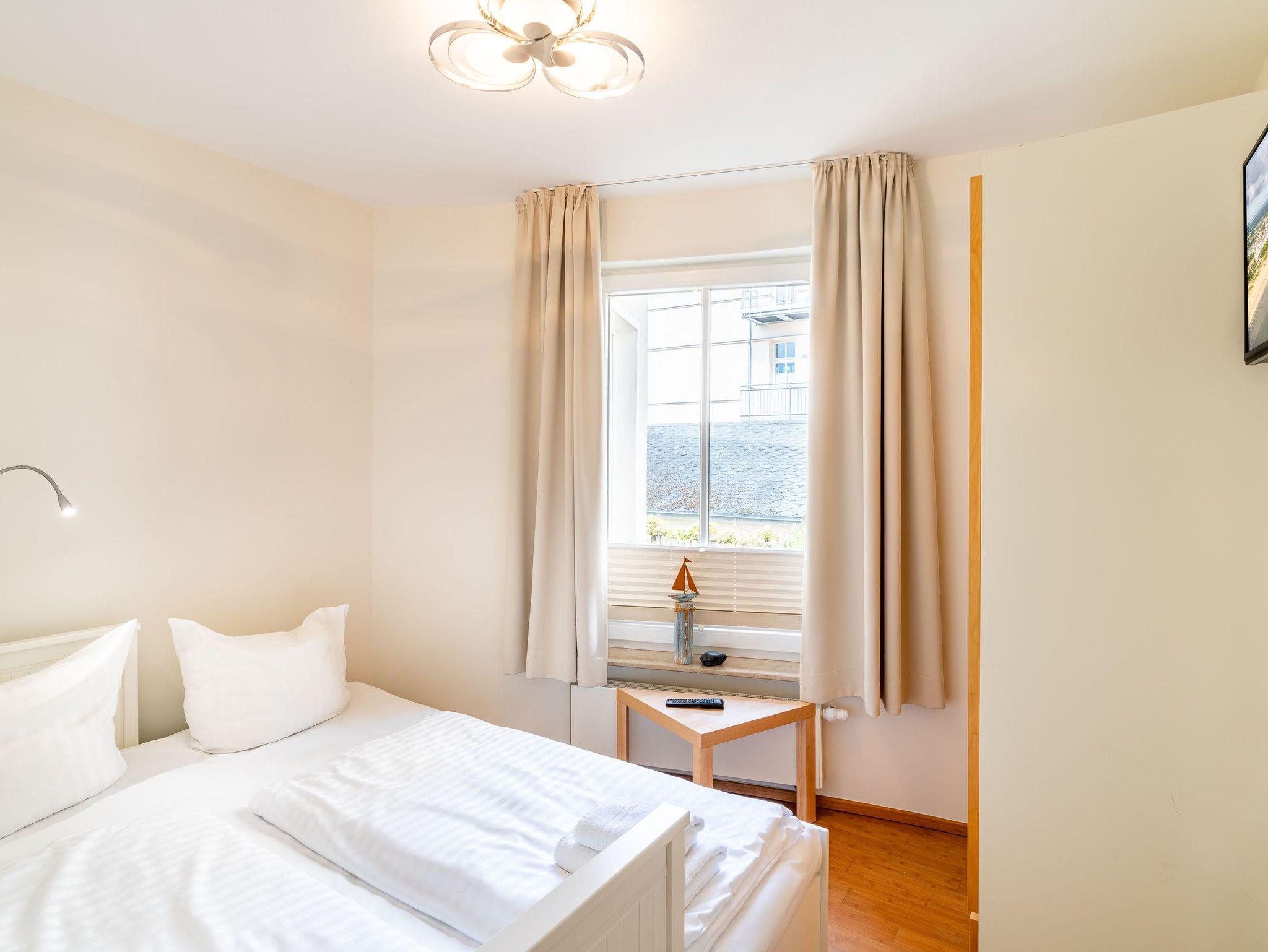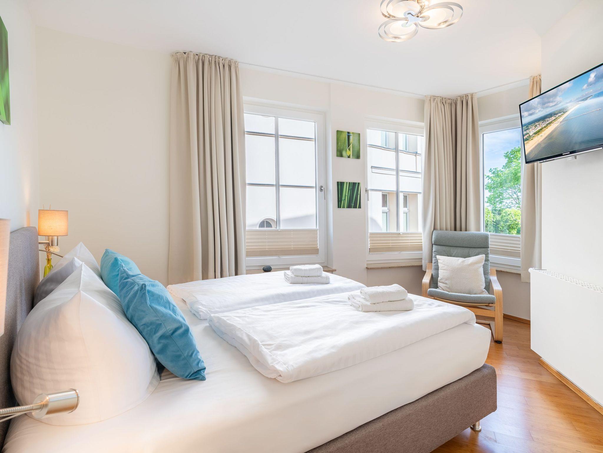 Die in den Wohnraum integrierte Küche bietet jeglichen Komfort (Backofen, Ceranfeld, Geschirrspüler, Kühlschrank mit Gefrierfach, Kaffeemaschine, Wasserkocher, Toaster), den Sie sich von einer Küche wünschen. Für die Nachtruhe wartet im Schlafzimmer ein bequemes Boxspringbett (160 x 200cm / zwei getrennte Matratzen) sowie ein Flat TV auf Sie. Ein weiteres Schlafzimmer verfügt über ein Einzelbett, das mit wenigen Handgriffen in ein Doppelbett (160 x 200cm) für zwei Personen verwandelt werden kann, sowie über einen weiteren Flat TV.