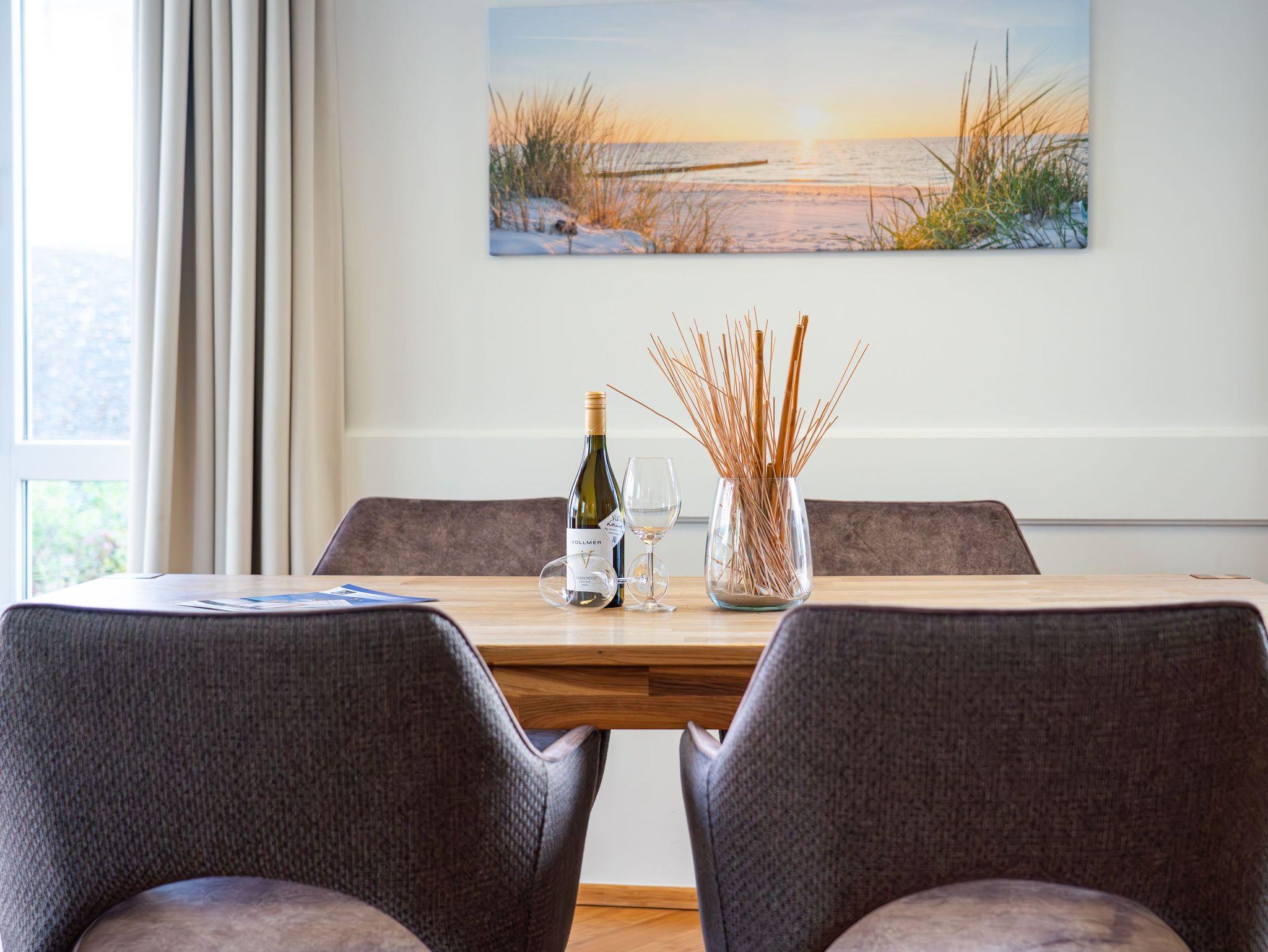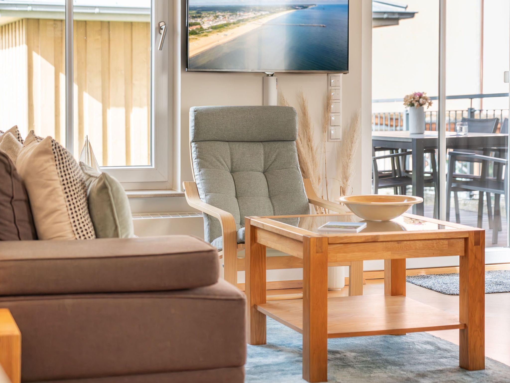 Der offene Wohn- und Kochbereich ist modern und gleichzeitig gemütlich eingerichtet. Die Polstersitzecke lädt zum Relaxen dank Flat-TV und Blu-ray-Player ein, ist aber auch ein idealer Ort für gesellige Spielabende. Im Handumdrehen können Sie die hochwertige Boxspringcouch zum Schlafplatz für zwei Gäste umwandeln. Vom Wohnbereich gelangen Sie auf Ihre private Terrasse mit Südwestausrichtung: dank des kleinen Gartenanteils empfiehlt sich dieses Appartement ideal für Familien. Auf der Terrasse können Sie sich dem Sonnenbaden hingeben oder den Abend bei einem Gläschen Wein ausklingen lassen.