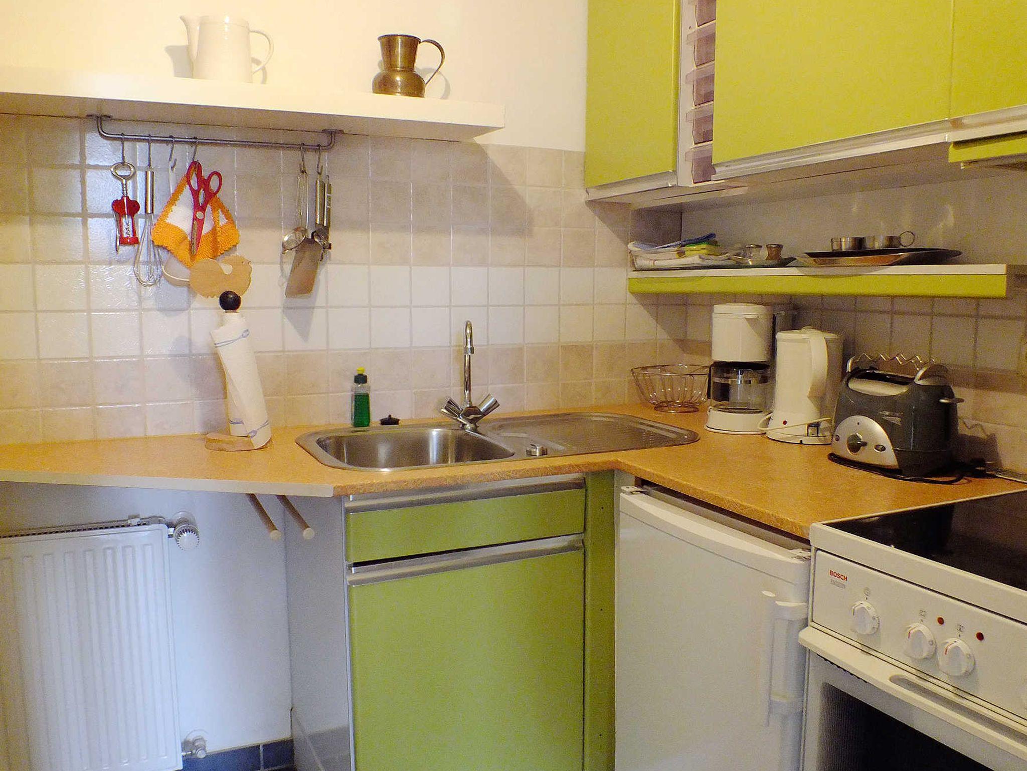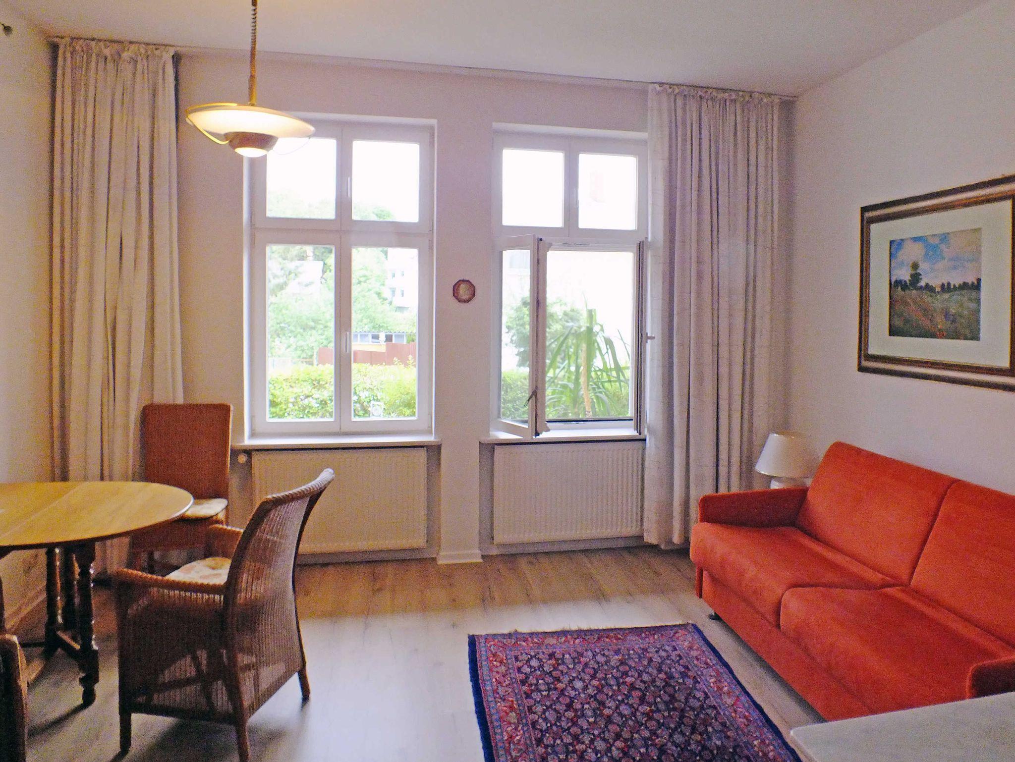 Dieses freundliche 28 qm große 1-Raum-Appartement im Erdgeschoß besteht aus einem kombinierten Wohn- und Schlafraum mit einem Kleiderschrank, einer Kommode, einem qualitativem Bali-Sofa-Bett mit einer Liegefläche von 1,60 x 2,00 m, TV, Esstisch mit Stühlen sowie einer separaten Küche mit 4-Platten-Herd, Backofen, Spüle, Kühlschrank, Kaffeemaschine, Toaster, Geschirr usw. Das Bad hat DU/WC. Das Appartement ist mit Laminat ausgestattet.