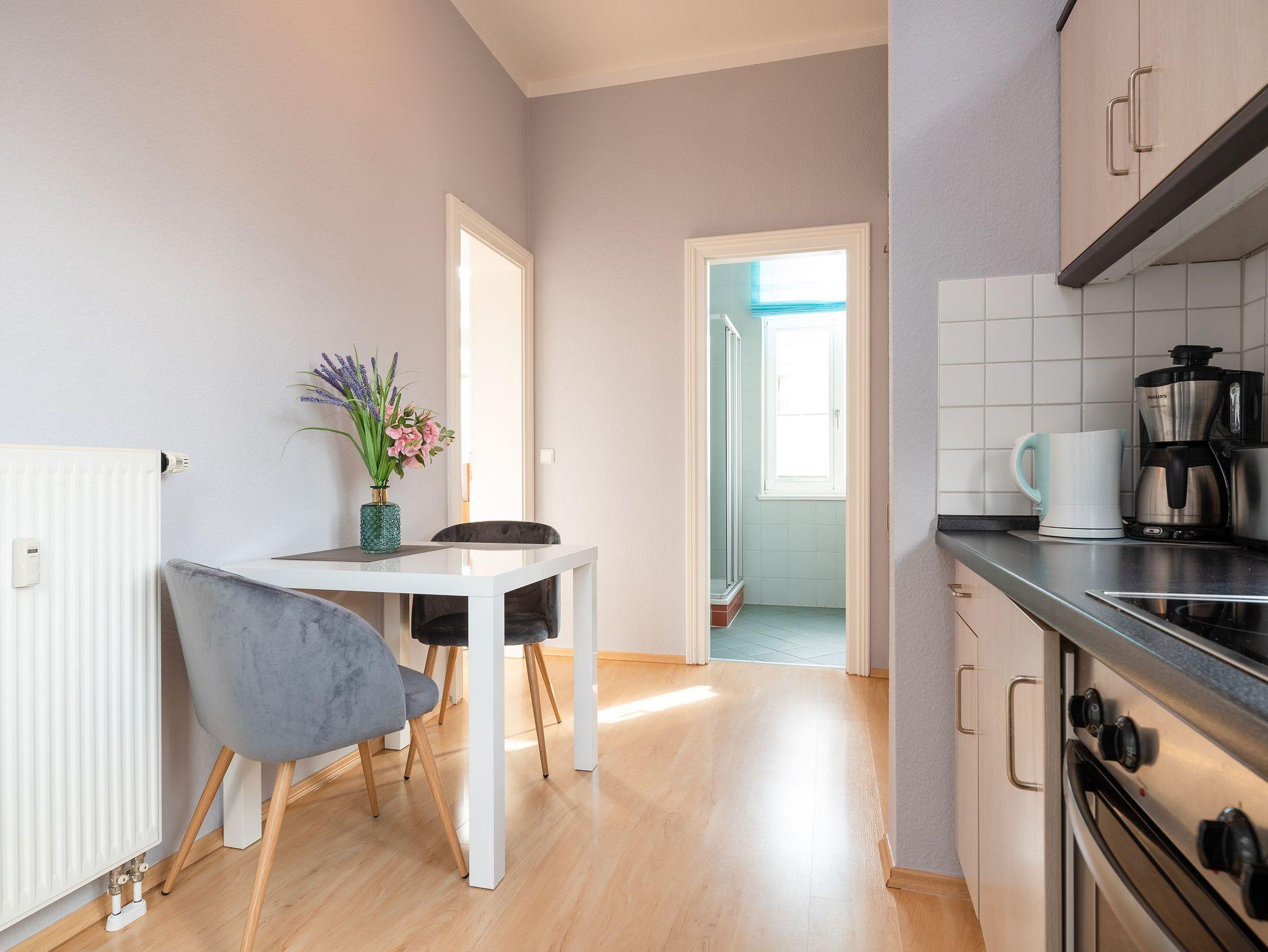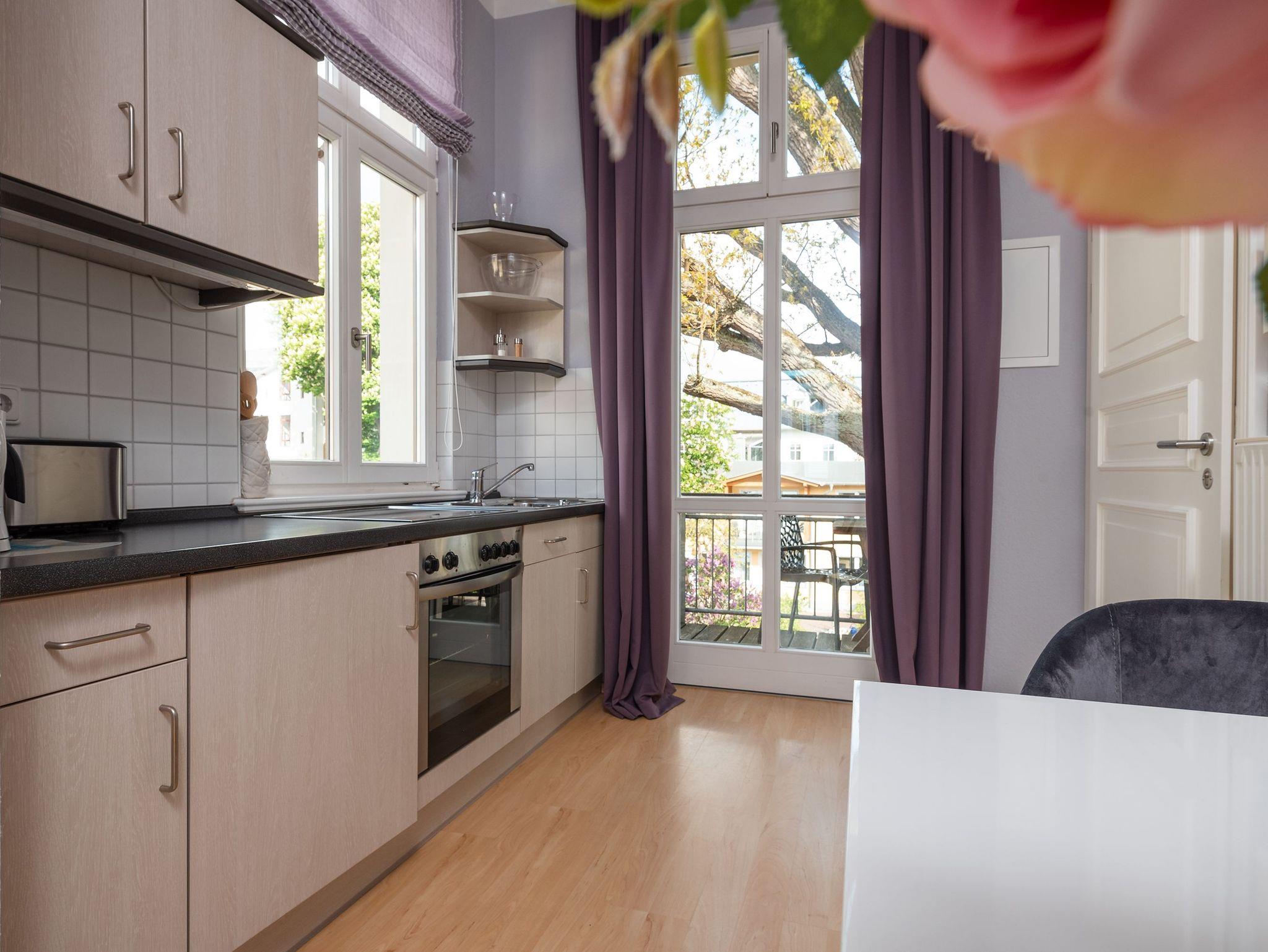 • Die voll ausgestattete, lichtdurchflutete Küche mit Essbereich für zwei Personen ist mit Geschirrspüler, Backofen, Kochfeld, Kaffeemaschine und Wasserkocher bestens ausgerüstet.