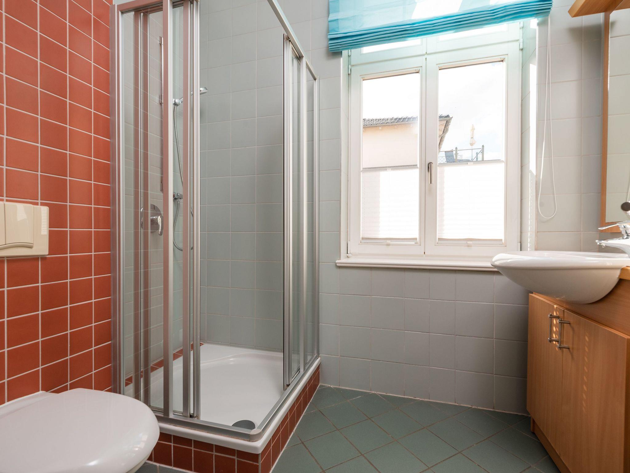 • Ein modernes Badezimmer mit Dusche, WC und Waschtisch.