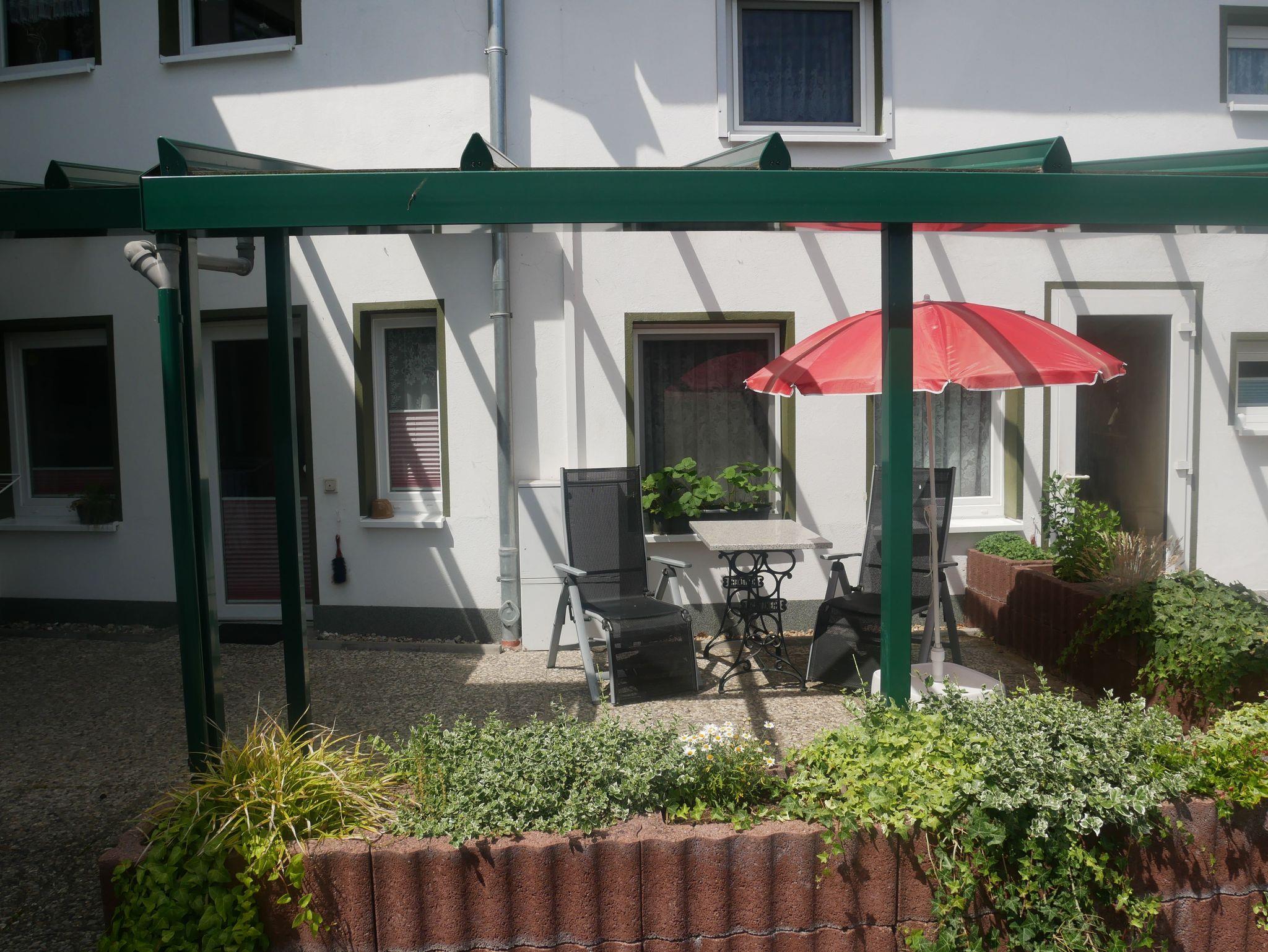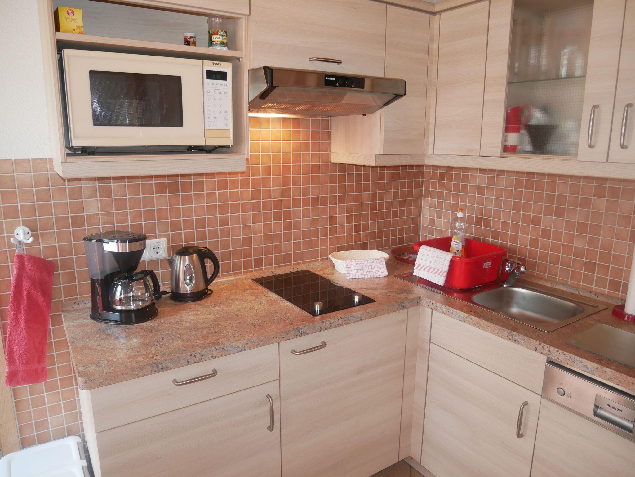 Die 1-Raum-Wohnung Rot befindet sich im Erdgeschoss und sie ist ca. 30 m² groß. Das kombinierte Wohn- und Schlafzimmer ist mit einem gemütlichen Doppelbett, Kleiderschrank, Sitzbereich und Flachbildfernseher ausgestattet. Die separate Küche verfügt über ein 2er-Cerankochfeld, Kühlschrank mit Gefriermöglichkeit, Kaffeemaschine, Wasserkocher, Toaster, Mikrowelle und Essbereich. Das Badezimmer verfügt über eine Dusche und einen Haartrockner. Zur Wohnung gehört eine möblierte Terrasse.