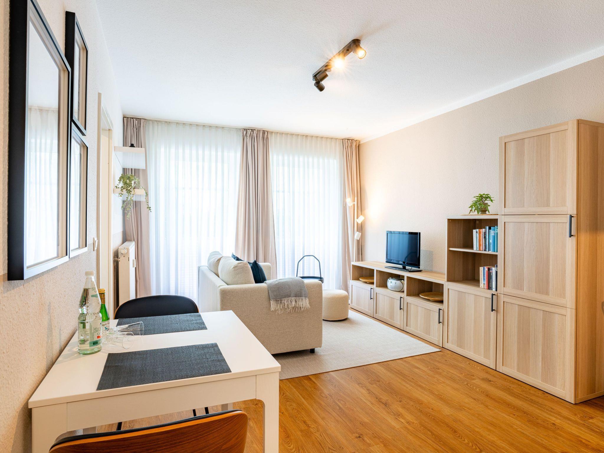 Die 35 qm große Wohnung befindet sich im Erdgeschoss und ist für zwei Personen ausgestattet. Die Wohnung verfügt über ein separates Schlafzimmer mit Boxspring-Bett, ein Wohnzimmer mit Essplatz sowie eine kleine Küchenzeile, ausgestattet mit Mikrowelle,Herd, Kühlschrank u.v.m.. Bad mit Dusche und WC.