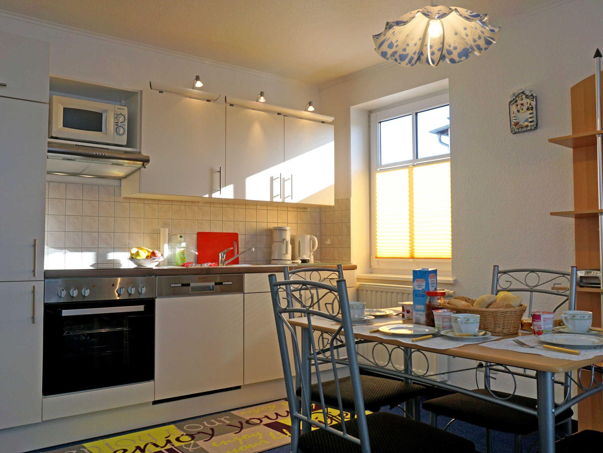 Die Ferienwohnung befindet sich im schönen frisch renovierten Haus Antje im 1. OG. Das gemütliche, komplett eingerichtete Wohnzimmer mit Couchgarnitur (Schlafcouch) und Küchenzeile lässt keine Wünsche offen. Das Schlafzimmer ist mit einem Doppelbett ausgestattet (genügend Platz für Babybett vorhanden). Das großzügige Bad ist ausgestattet mit Badewanne, Waschtisch und WC.