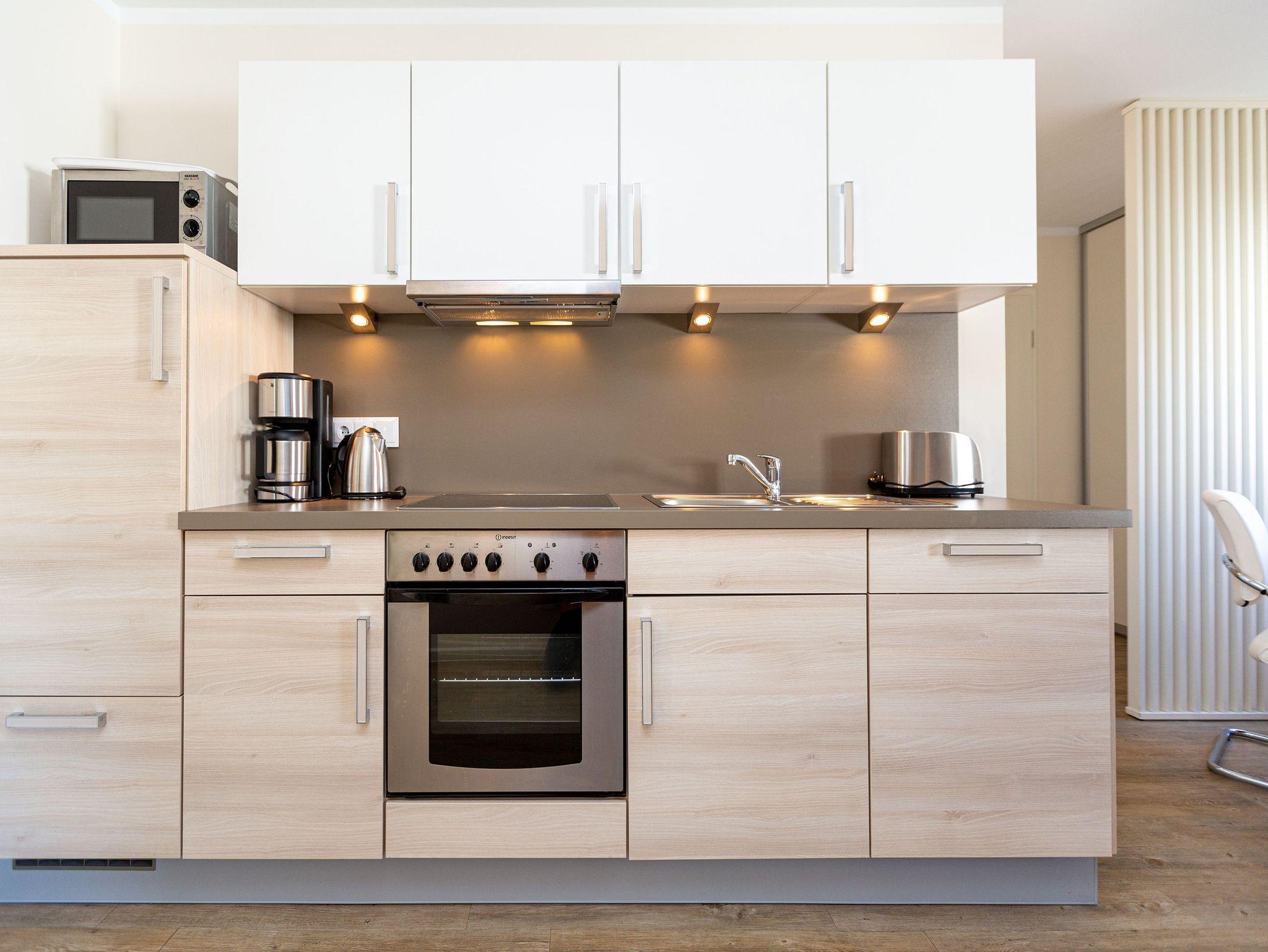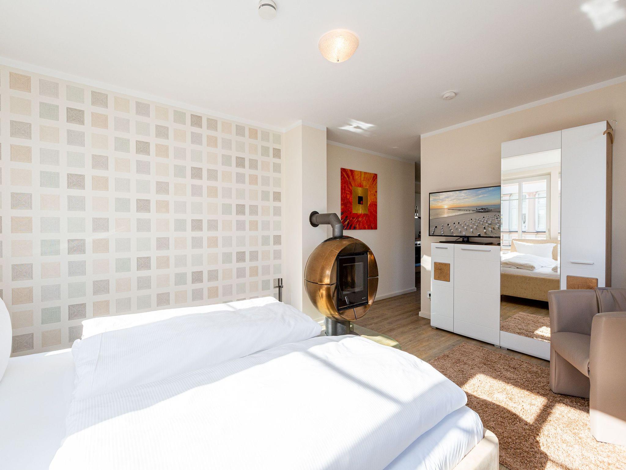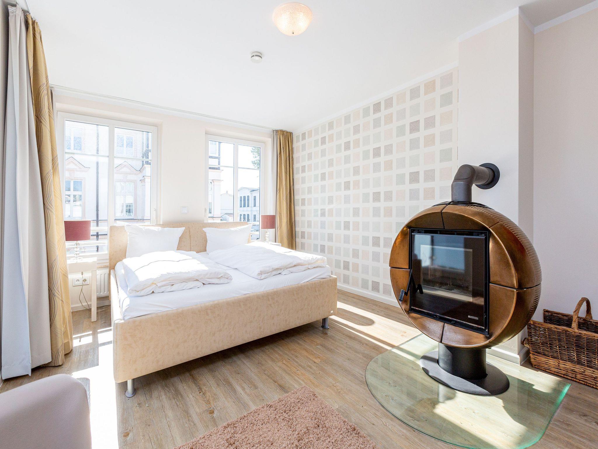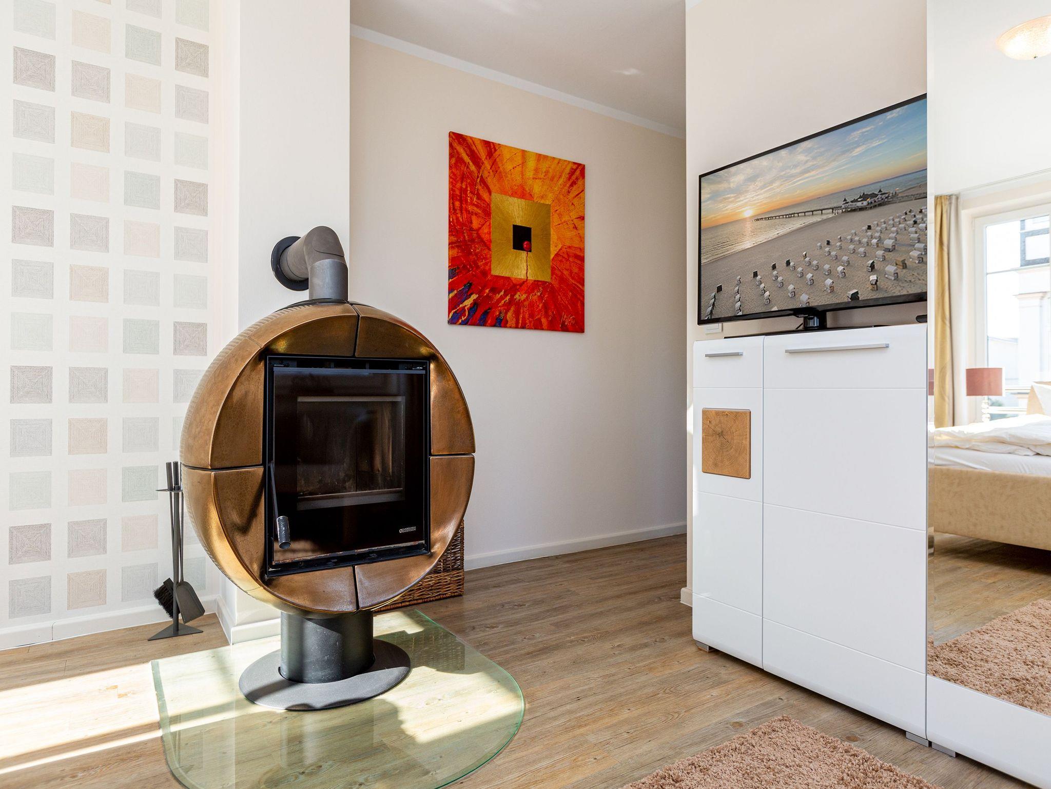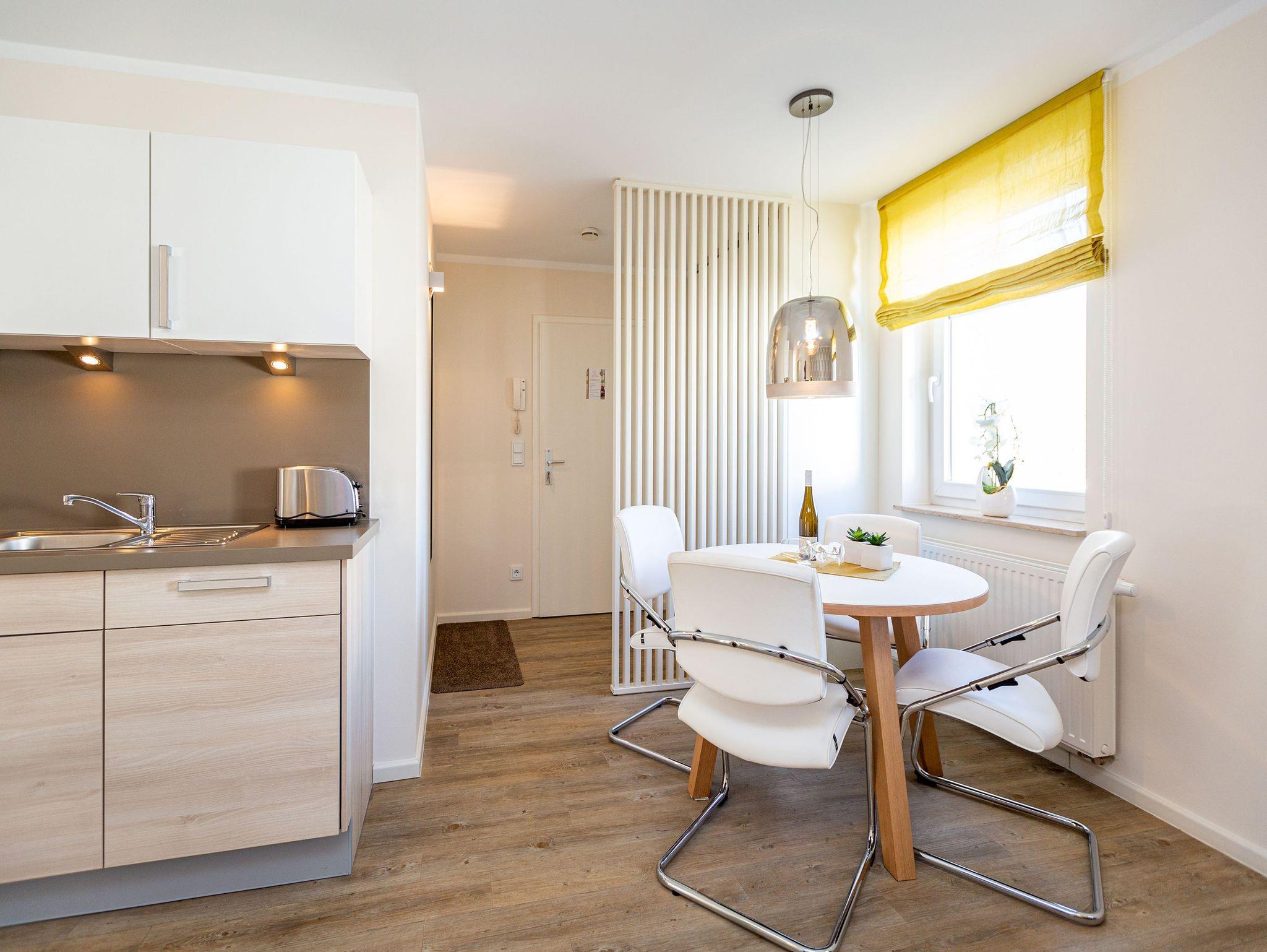 Freuen Sie sich auf einen erholsamen Urlaub zu zweit! Harmonisch abgestimmte Farben und ein großzügiges und durchdachtes Raumkonzept erwarten Sie im Appartement 8 in der Weißen Düne. Im 1. Obergeschoss des Hauses gelegen, empfängt Sie dieses 2-Raum-Appartement neu gestaltet mit hochwertigem Mobiliar und einem stylischen Ambiente. Die sanften und hellen Farben in Beige und Weiß mit einem Tupfer Gelb versetzen Sie direkt in Urlaubslaune. Der moderne Strandhausstil durchzieht das gesamte Appartement und besticht durch Helligkeit und Freundlichkeit. Im offenen Wohn-Ess-Bereich befindet sich neben einer gemütlichen Couch, Flat-TV, DVD-Player und Minianlage mit Radio ein Essplatz für bis zu vier Personen. Die voll ausgestattete Küche mit Backofen, Ceranfeld, Spülmaschine, Mikrowelle und Kühlschrank lässt beim Zubereiten Ihrer Speisen keine Wünsche offen. Für einen erholsamen Schlaf in Ihrem Urlaub sorgt das komfortable Bett im offenen Schlafbereich. Selbstverständlich befindet sich auch hier ein Flat-TV für gemütliche Fernsehabende zu Zweit. Das Highlight bildet der runde Kamin, dessen Knistern Sie abends vom Bett aus genießen können. Könnte ein Urlaubstag schöner beginnen, als mit dem Blick auf die Ostsee? Von Ihrem kleinen Nord-Ost-Balkon aus gelingt Ihnen die Sicht auf die Strandpromenade und den dahinterliegenden Sandstrand. Ein Duschbad mit Toilette und Waschtisch sowie kostenfreies WLAN und ein hauseigener Außenstellplatz Nr. 8 runden Ihren Urlaub auf der Insel Usedom ab. Für Ihren Komfort sind die Betten bei Anreise bereits bezogen und Handtücher liegen für Sie bereit (Erstausstattung).