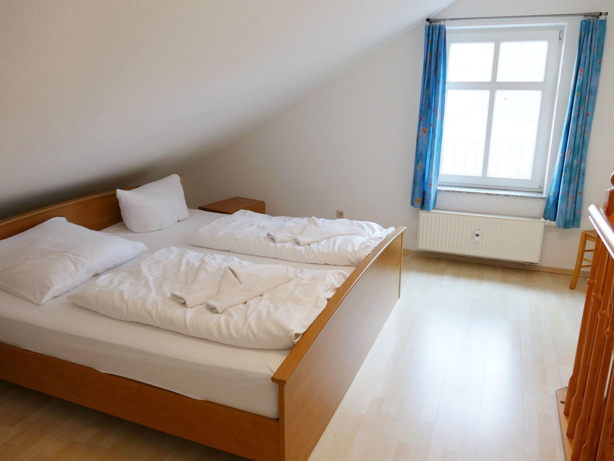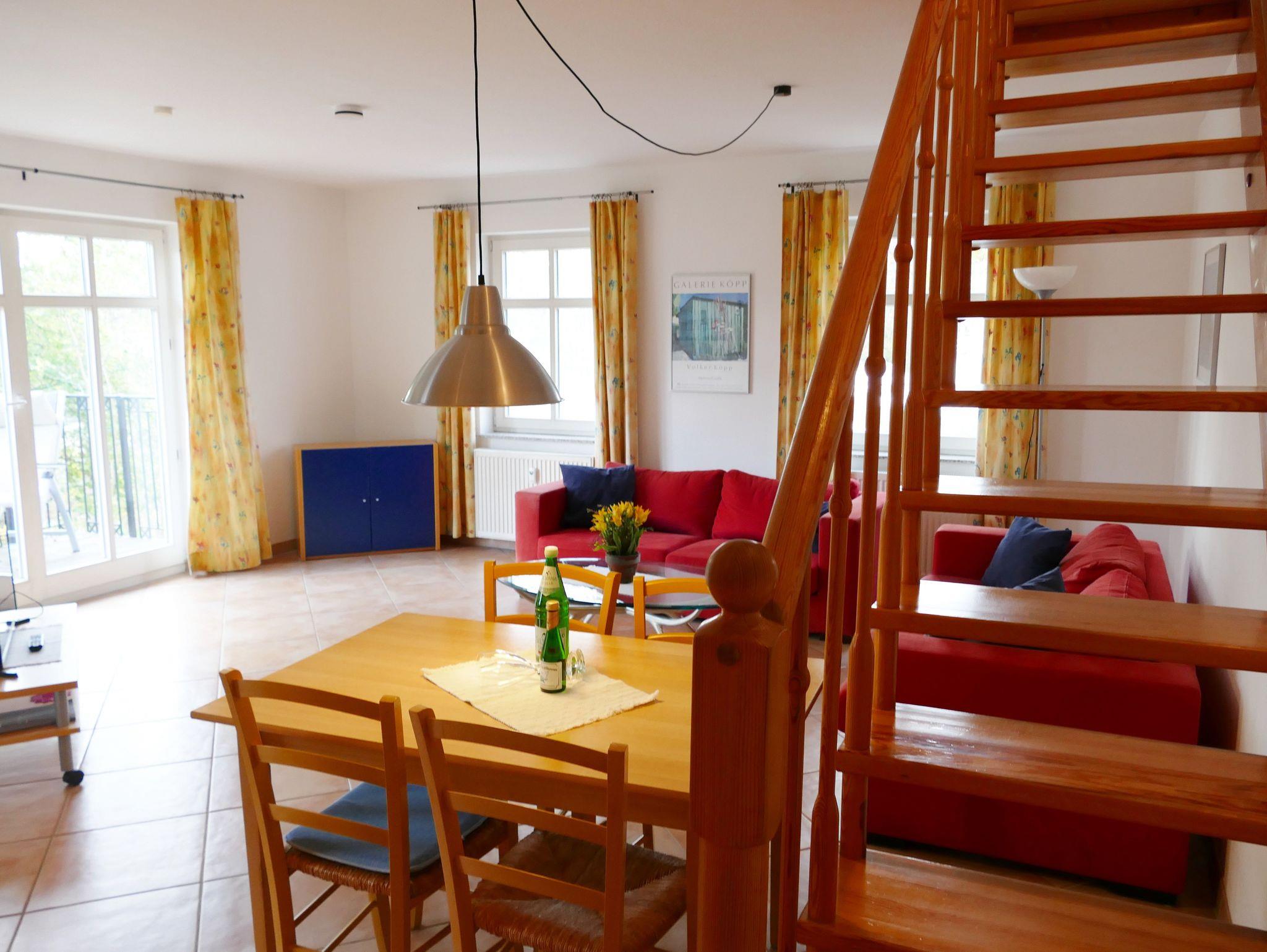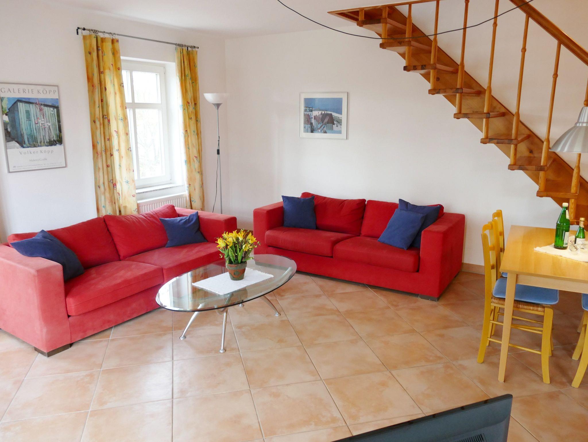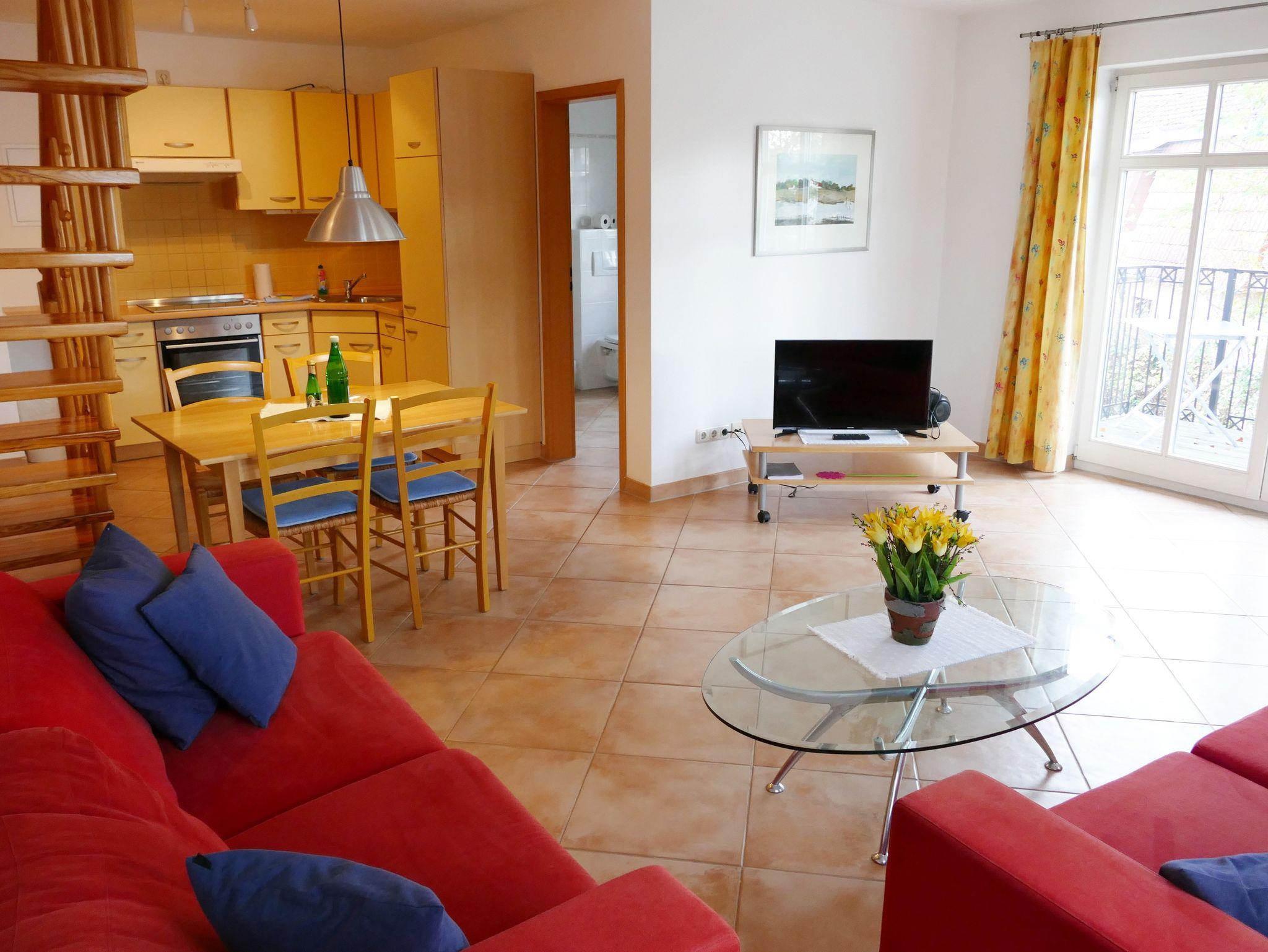 Die 53 qm große Maisonette-Ferienwohnung bietet Platz für max. 4 Personen. Die Wohnung verfügt über einen Wohnbereich und Küchenzeile, ein Badezimmer mit Dusche und WC und in der oberen Etage über ein Schlafzimmer mit einem Doppelbett und ein Schlafzimmer mit 2 Einzelbetten. Die Wohnung hat einen Balkon zur Gartenseite. Der Wohnbereich ist mit einer gemütlichen Sitzgruppe und einem Essplatz eingerichtet. Ebenso sind Kabel-TV und CD-Spieler mit Radio vorhanden.