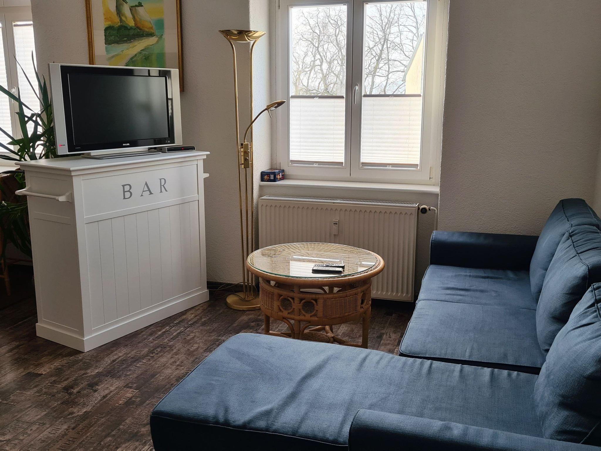 Die 52 qm große Ferienwohnung befindet sich im Obergeschoss und ist mit einem Wohnzimmer mit Sitzeck und TV und einer kleinen Küchenzeile mit Kühlschrank und Gefriermöglichkeit, 2-Platten-Ceranherd, Spülmaschine etc ausgestattet. Das Schlafzimmer verfügt über ein Doppelbett und ein Etagenbett. Bad mit Dusche und WC.