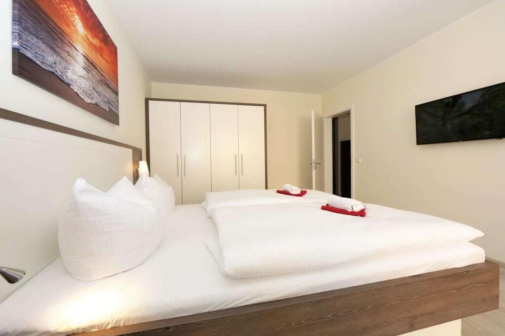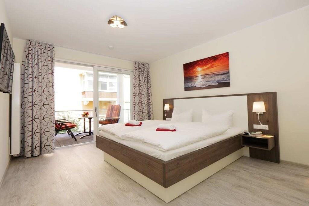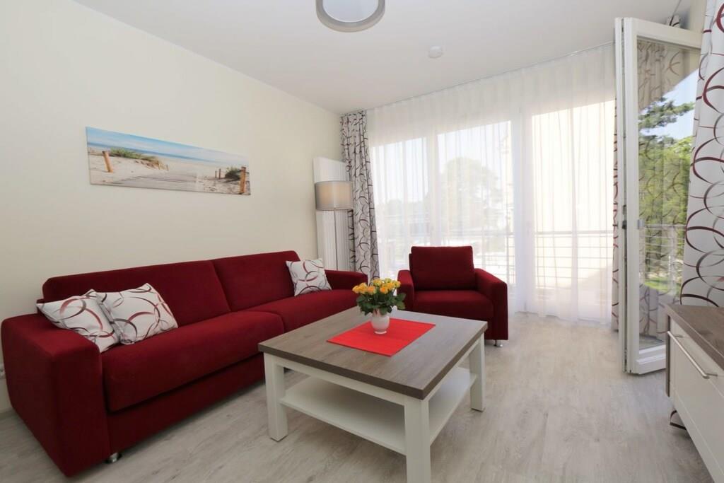 Der hell eingerichtete Wohnraum in der ersten Etage verfügt über eine gemütliche Sitzecke (mit Schlaffunktion) und einen separaten Essplatz. Von der Terrasse haben sie Meerblick. Eine im Wohnbereich integrierte Küchenzeile mit Geschirrspüler, Backofen, Mikrowelle p.p läßt auch für den Hobbykoch keine Wünsche offen. Das Schlafzimmer ist mit Doppelbett und genügend Schrankraum ausgestattet. Ein Duschbad sowie eine Terrasse runden diese Ferienwohnung ab. TV und Radio stehen zur Nutzung bereit. Der Pkw-Stellplatz befindet sich in der Tiefgarage und ist der Ferienwohnung zugeordnet. Fahrräder können im Keller untergestellt werden. Von Oktober bis März können Sie die Sauna zu bestimmten Zeiten nutzen.
