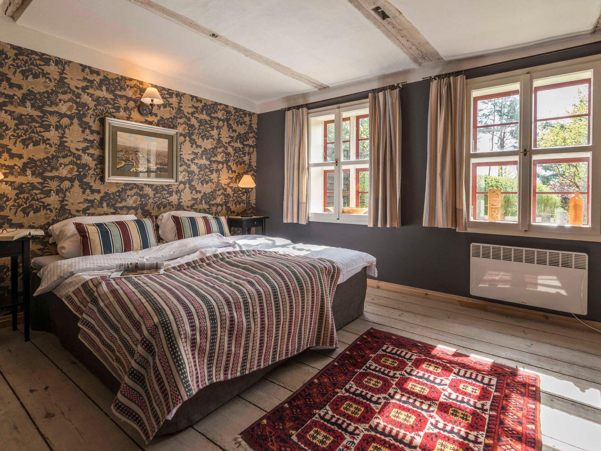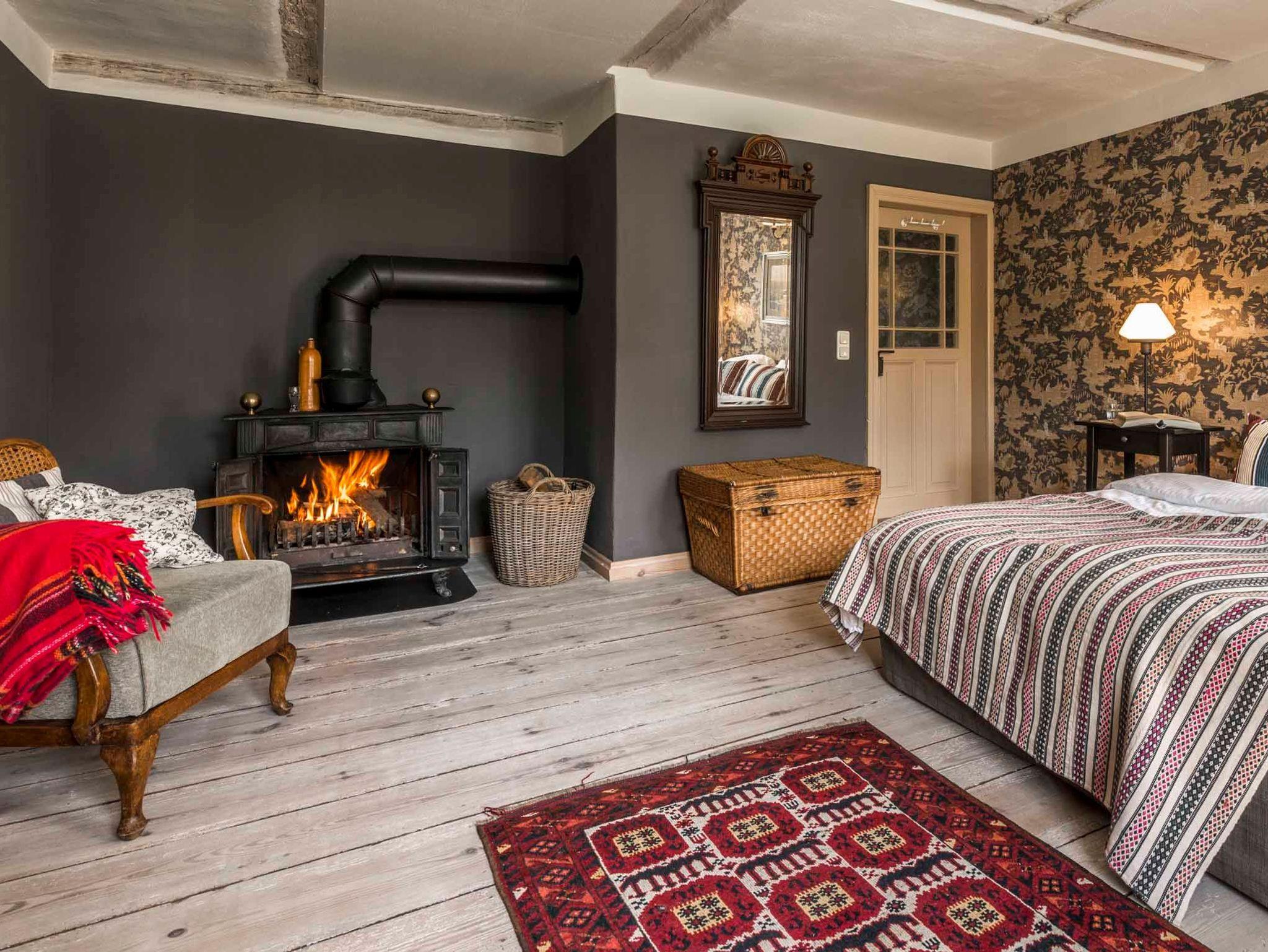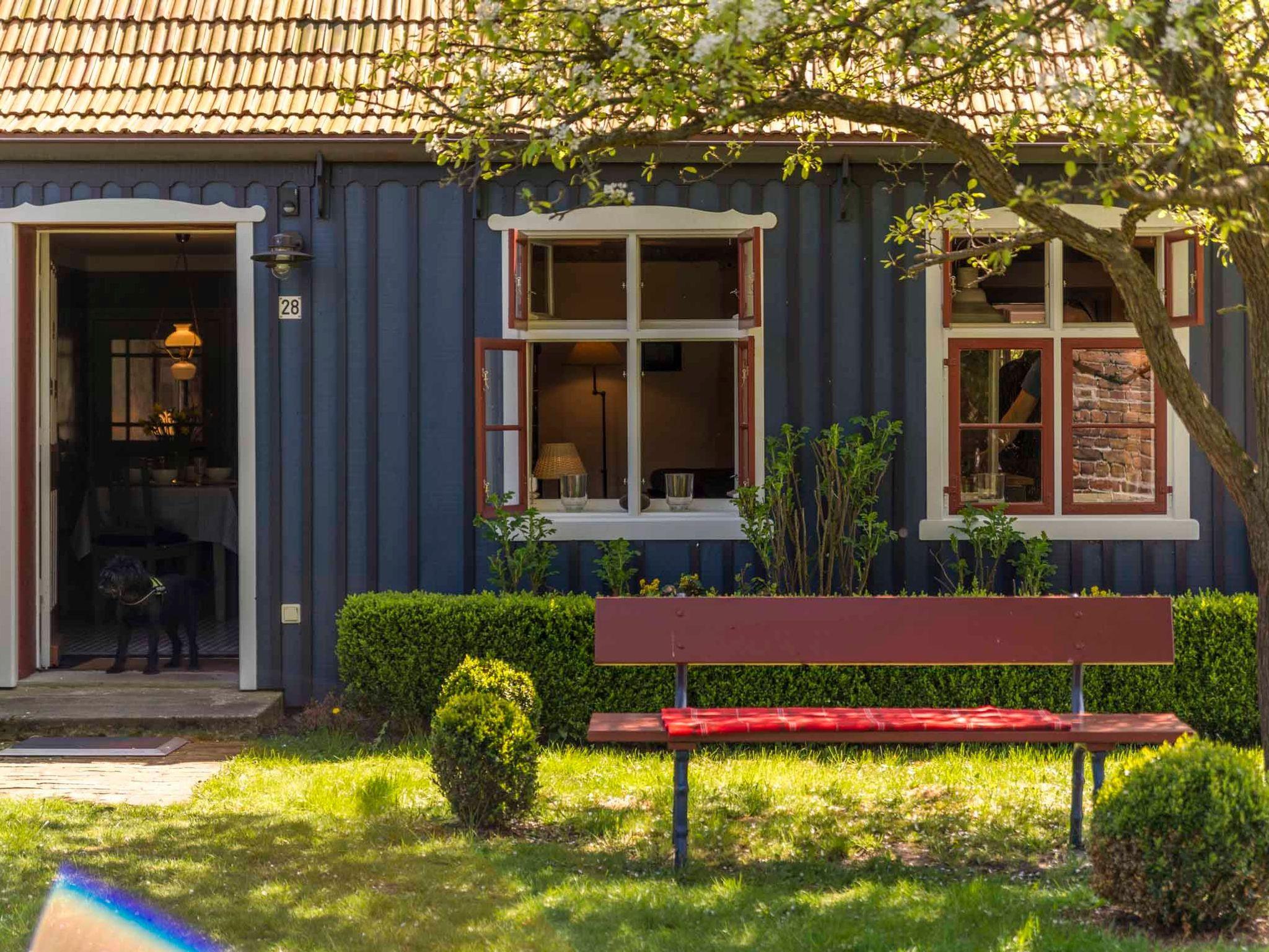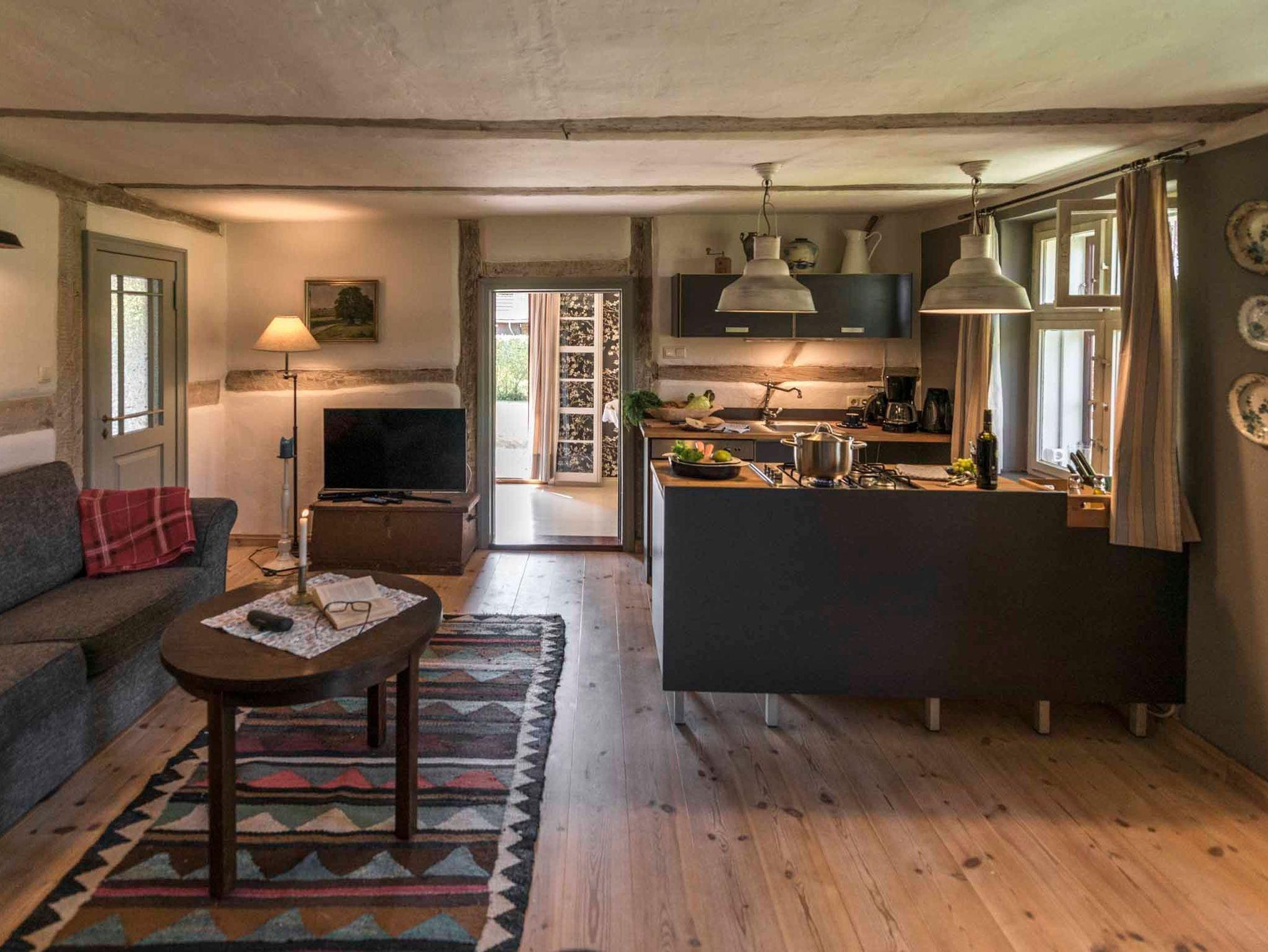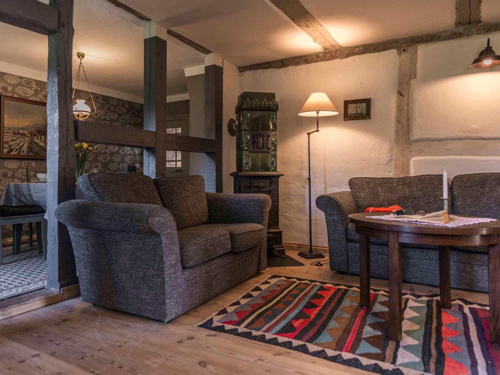 Unser Colonistenhaus ist ein liebevoll saniertes Fachwerkhaus aus dem Jahr 1757. Haben Sie schon einmal Ihren Urlaub in einem 250 Jahre alten Haus verbracht? Lieben Sie blankgegriffene Türklinken, tiefe Balkendecken, die Struktur handgeformter Lehmwände, das Spiel von Licht und Schatten auf gelaugten Dielen und antiken Möbeln? Dann lassen Sie sich von fast 100m² Geschichte im Colonistenhaus verzaubern. Bei unserem mit viel Liebe sanierten Fachwerkhaus aus dem Jahr 1757 wurde ganz besonders darauf geachtet, den ursprünglichen Charme eines historischen pommerschen Gebäudes zu bewahren und dabei viel Wert auf ökologische Materialien wie Lehm, Holz und Naturfarben gelegt. So haben wir das Haus mit der für diese Häuser typischen Holzfassade aus heimischer Fichte versehen. Das Dach wurde 2016 mit wunderbaren, historischen Tonziegeln eines Abbruchgebäudes im Nachbardorf neu gedeckt. Die zum Teil noch barocken Kastenfenster wurden aufwendig restauriert oder da wo möglich durch helle, bodentiefe Fenstertüren komplettiert, sodass direkte Zugänge zur umlaufenden großen Holzterrasse geschaffen wurden. Die urgemütliche Atmosphäre der Räume, mit niedrigen Balkendecken, edlen Tapeten und Zementfliesen, Fachwerkwänden, den antiken Schränken und Kommoden wird Sie verzaubern. Hier sorgt ein antiker Lübecker Kachelofen im Winter für wohlige Wärme. Außerdem wurde eines der beiden Schlafzimmer mit einem gusseisernen Franklin Ofen ausgestattet, der hier nun auf Wunsch für ausgesprochen romantische Abende sorgt.