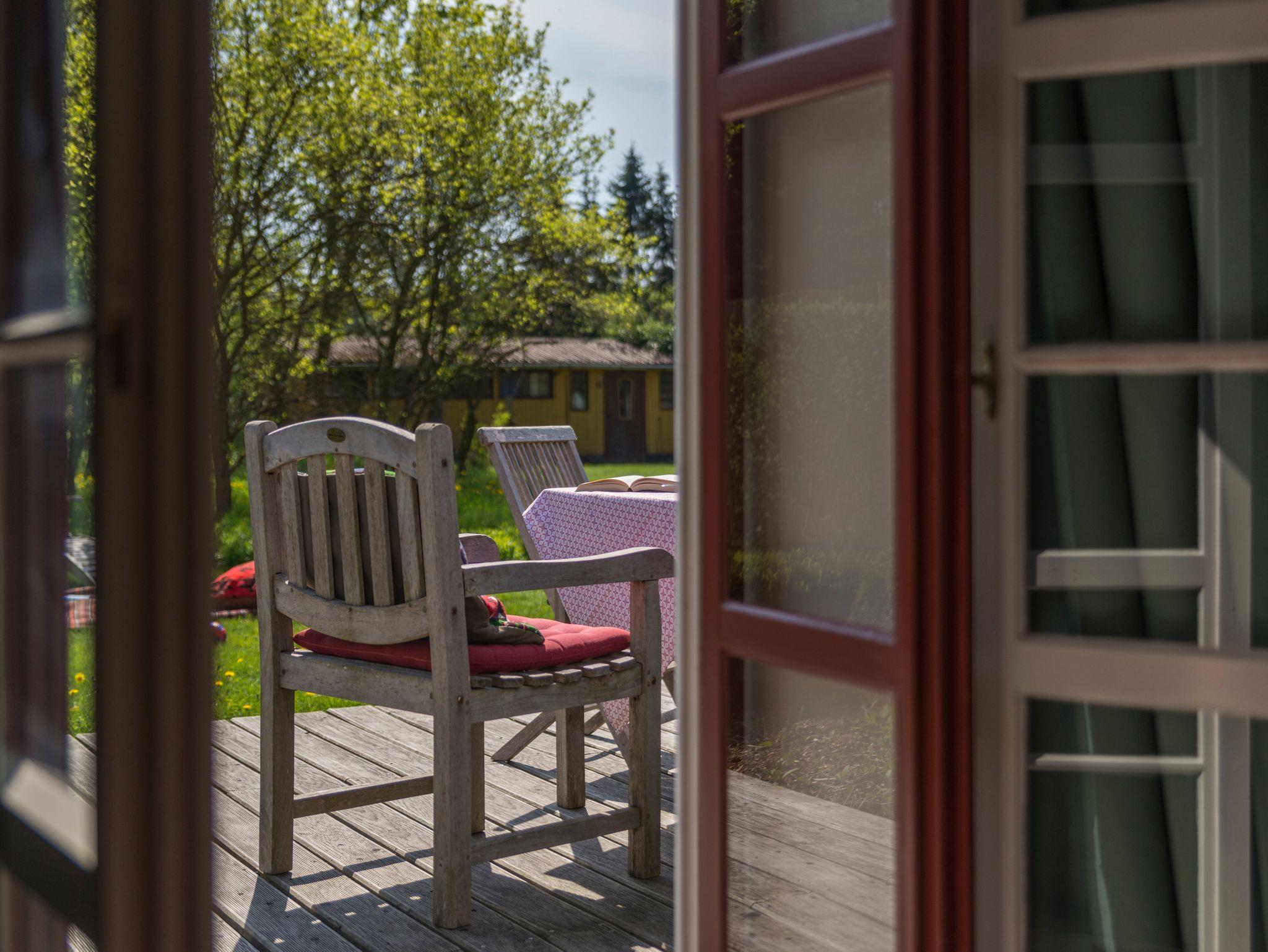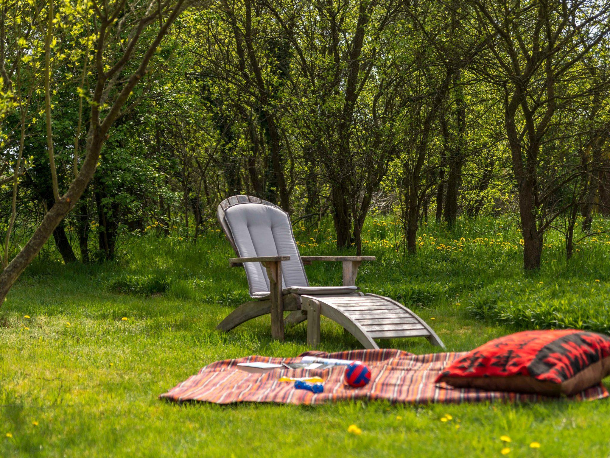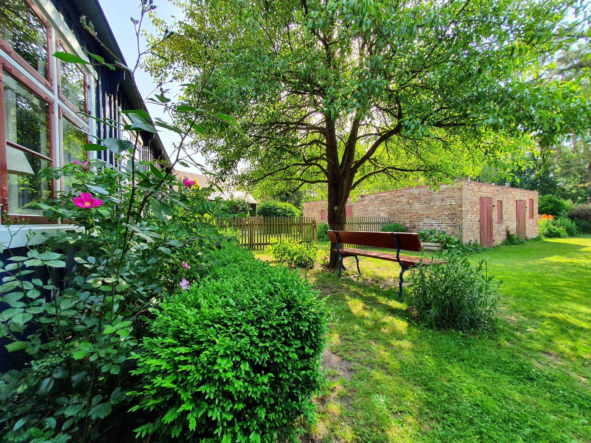 Die antike Bank unter dem Birnbaum vorm Haus, Teakmöbel auf der großen Holzterrasse und weitere Sitz und Liegemöglichkeiten stehen für Sie zum Entspannen bereit. Von hier aus schaut man in den wildromantischen Obstgarten mit seinen im Frühling prächtig blühenden Kirsch-, Apfel- und Pfirsichbäumen und gepflegten Hecken, auf eine Spielwiese mit Sandkasten für die Kleinsten und auf ein verlassenes Imkerhaus.