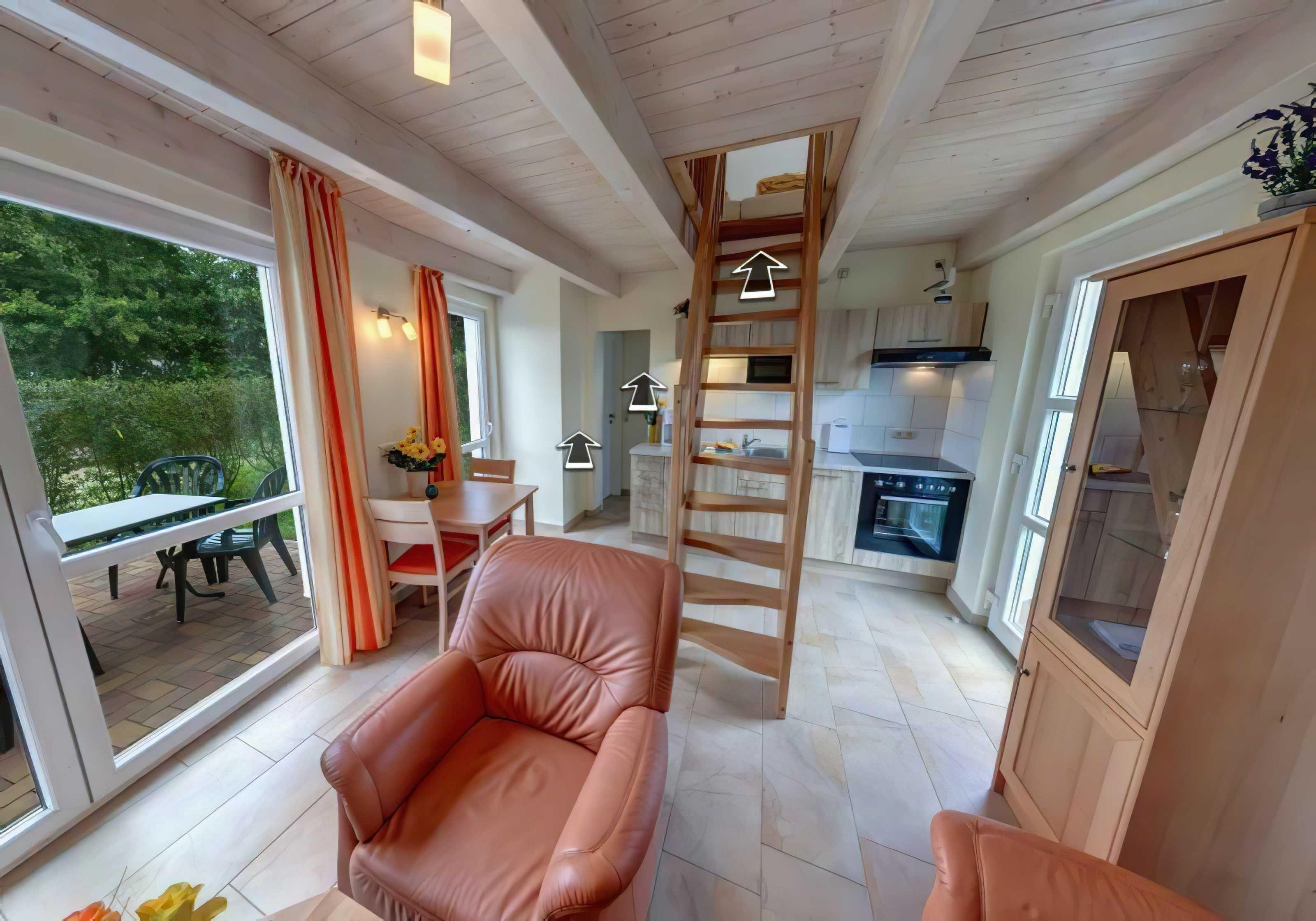 2 Etagen, ca. 54 m² (4 Personen) Zur Ausstattung gehören ein Schlafzimmer mit Doppeltbett und ein Schlafzimmer mit 2 Einzelbetten. Zur weiteren Ausstattung gehören ein Wohnzimmer mit integrierter vollausgestatteter Küche (Geschirrspüler, Ceranherd mit Backofen, Mikrowelle, Kaffeemaschine) einem Bad mit Dusche/WC und einer großen Terrasse mit Sitzmöglichkeiten.