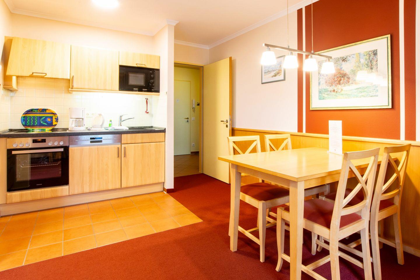 Das Nichtraucher-Apartment verfügt über kostenfreies WLAN und eine voll ausgestattete offene Küche mit Geschirrspüler, Gefrier- und Kühlschrankkombination, Kaffeemaschine, Toaster, Wasserkocher, Mikrowelle, 4-Platten-Elektro-Herd und Backofen sowie über einen behaglichen Wohn-Essbereich. Der Wohnbereich ist ausgestattet mit einem Flatscreen-TV, einer HiFi-Anlage sowie einer Schlafcouch.