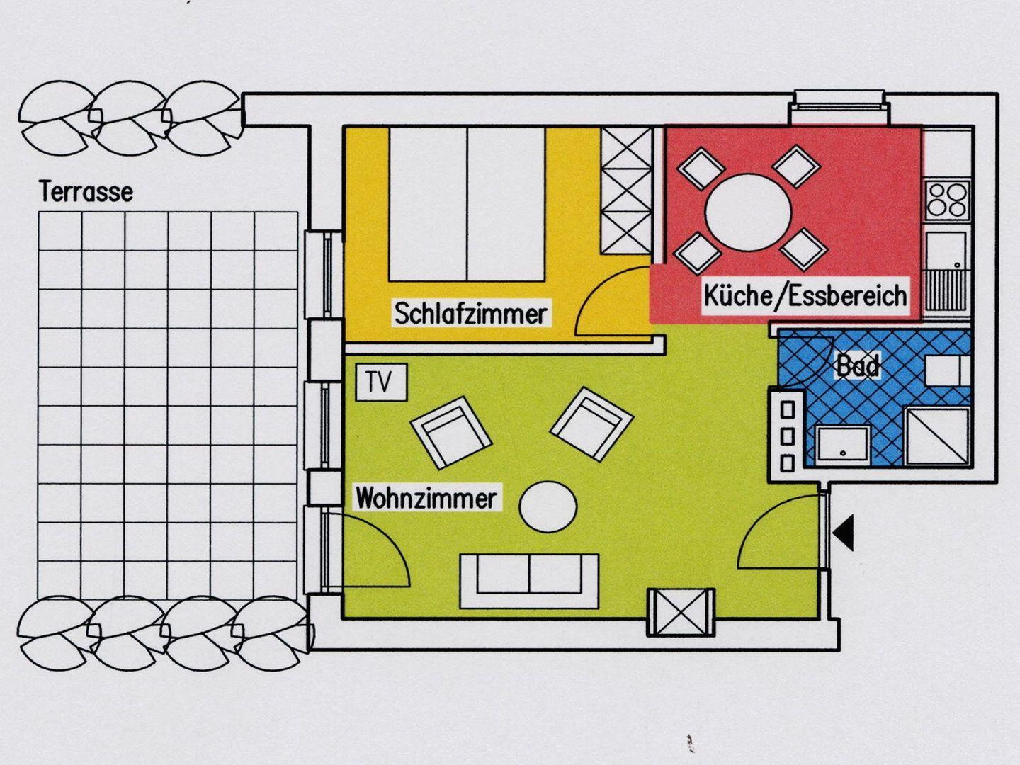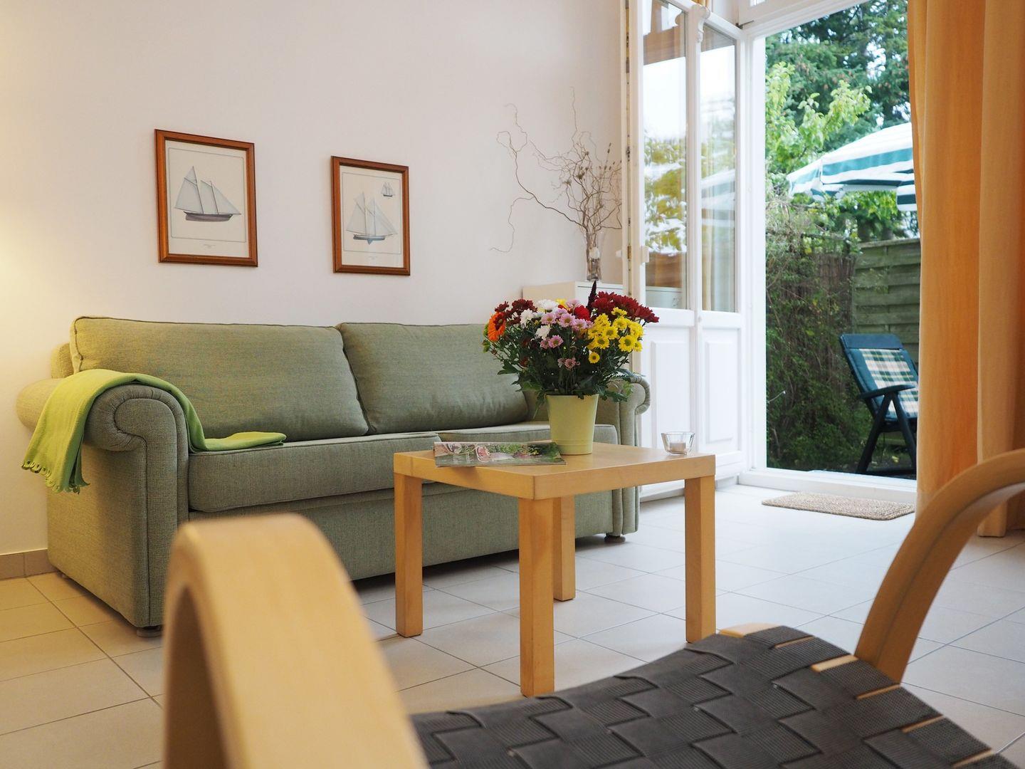 Das gemütliche Wohnzimmer mit Übergang in den Küchenbereich mit seinem separaten Essplatz lädt zum Verweilen ein, während die Schlafmöglichkeiten mit einem Doppelbett ( 160 x 200 cm ) im Schlafzimmer und einer Schlafcouch ( 140 x 190 cm ) im Wohnzimmer für Flexibilität sorgen. Die Küche ist voll ausgestattet und ermöglicht Ihnen eine unabhängige Selbstverpflegung während Ihres Aufenthalts. Das Bad mit seiner superflachen Dusche rundet das Angebot ab.