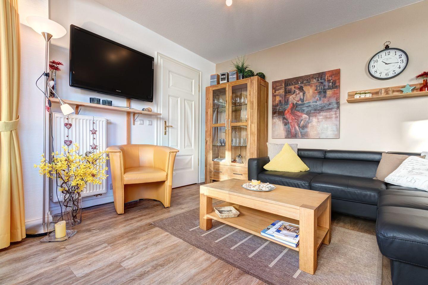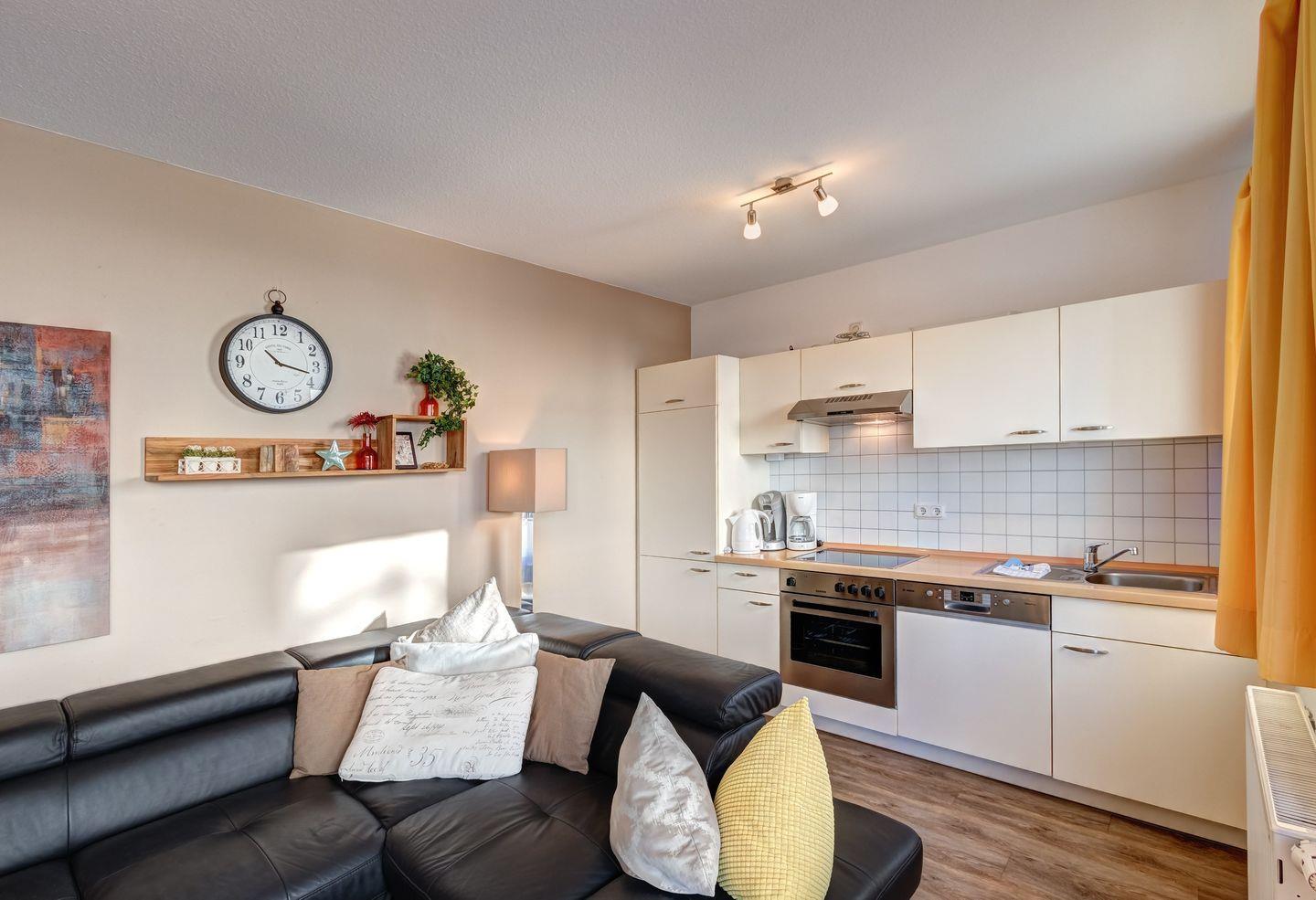 - Wohnzimmer mit gemütlicher Sitzecke und einer voll ausgestatteten Küchenzeile, die unter anderem mit einem Geschirrspüler für Ihren Komfort ausgestattet ist.