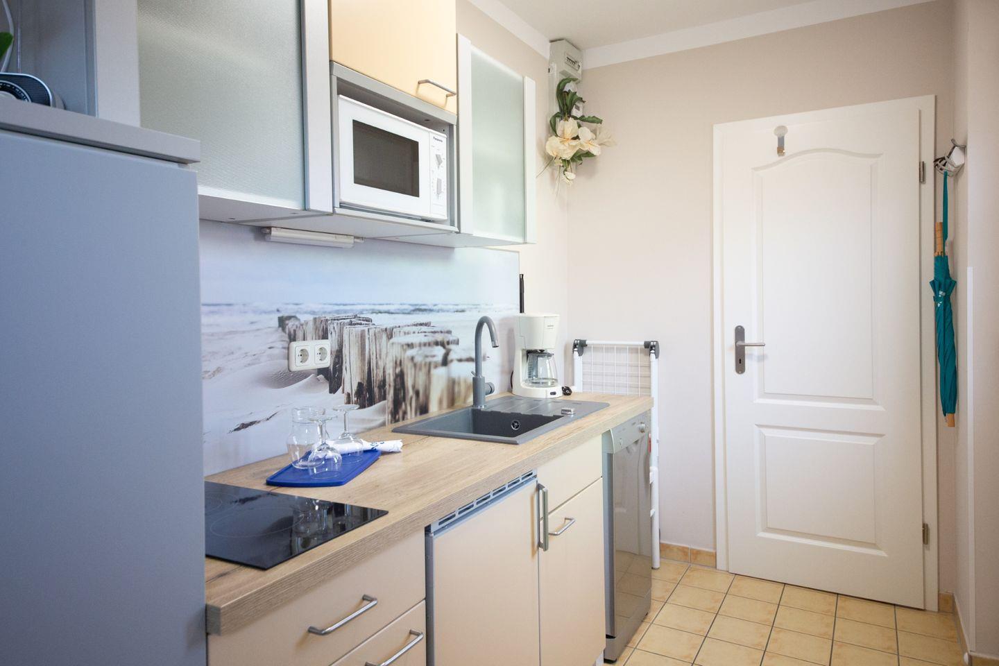 Die Erdgeschoss-Ferienwohnung in einem Eigenheim bietet mit 27 m² Platz für bis zu 2 Personen. Idyllisch am Waldesrand und in der Nähe des Ortszentrums gelegen, verfügt sie über einen separaten Eingang, Parkplatz und eine Terrasse mit Grill sowie Gartenmöbeln. Das Schlafzimmer und der Wohnraum mit einer einladenden Essecke komplettieren die Wohnung. Der Strand ist nur etwa 500 Meter entfernt, und von hier aus können Sie die Insel ideal zu Fuß oder mit dem Fahrrad erkunden.