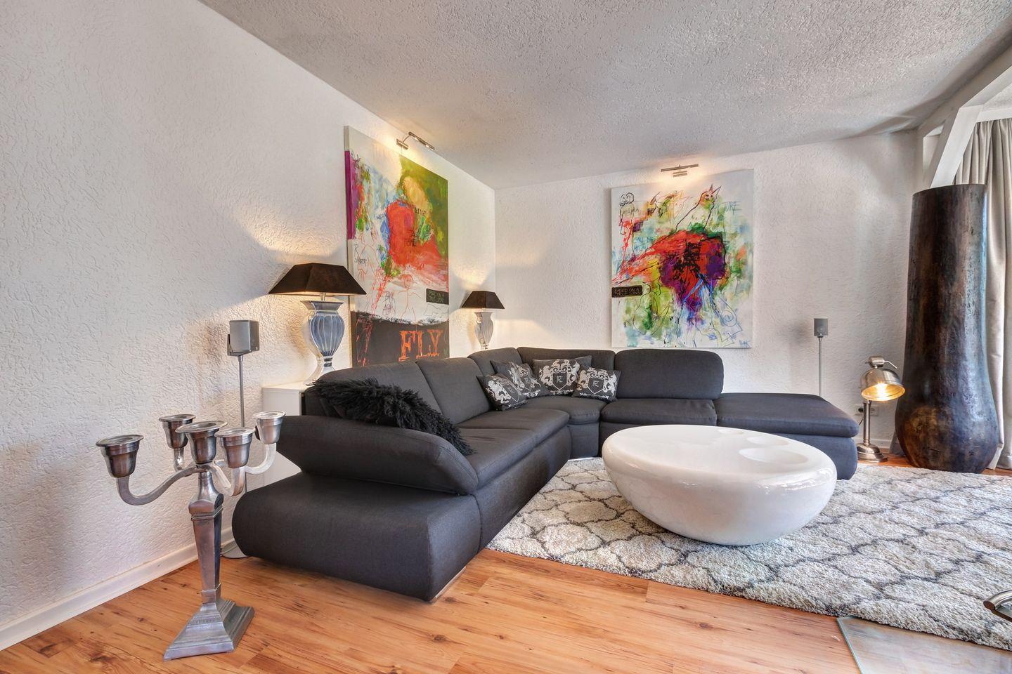 Genießen Sie entspannte Momente auf der großzügigen Sonnenterrasse mit Zugang zum kleinen Gartenbereich und dem Saunabereich im Untergeschoss.