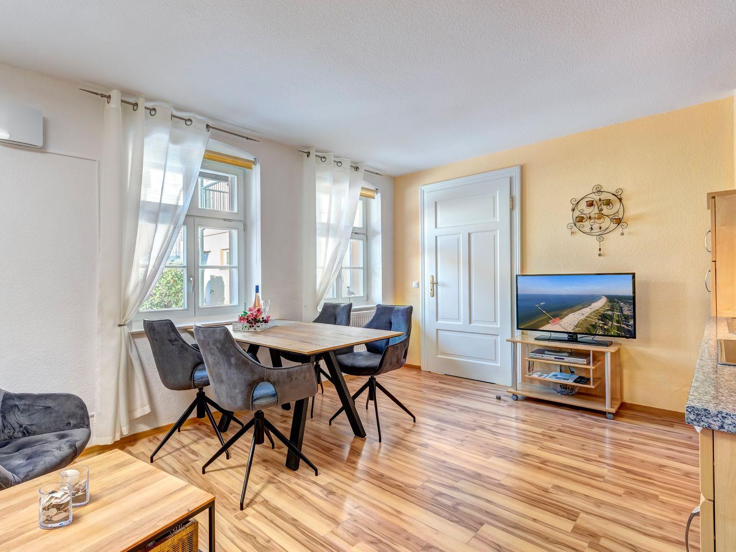 In der Residenz Bellevue erwartet Sie ein 120 m² großes Appartement für 4 Personen und ein Kleinkind. Es bietet einen großzügigen Wohnbereich mit Ledersitzgruppe, Essbereich und Zugang zur Terrasse.