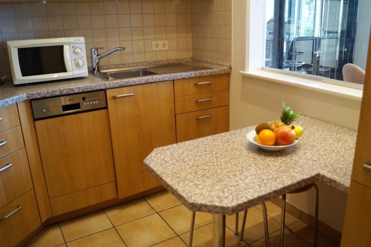 Herzstück der Wohnung ist der geräumige Wohnbereich mit einer Sitz- und Essecke sowie einem schönen Kamin, der an kalten Wintertagen für eine gemütlich heimelige Atmosphäre sorgt. Die separate Küche ist komplett ausgestattet und verfügt neben den klassischen Einbaugeräten zusätzlich über eine kleine Sitzecke.