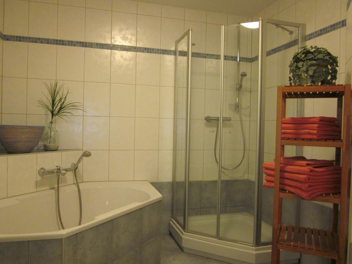 Das Badezimmer bietet sowohl Wanne als auch Dusche, einen Waschtisch und ein WC.
