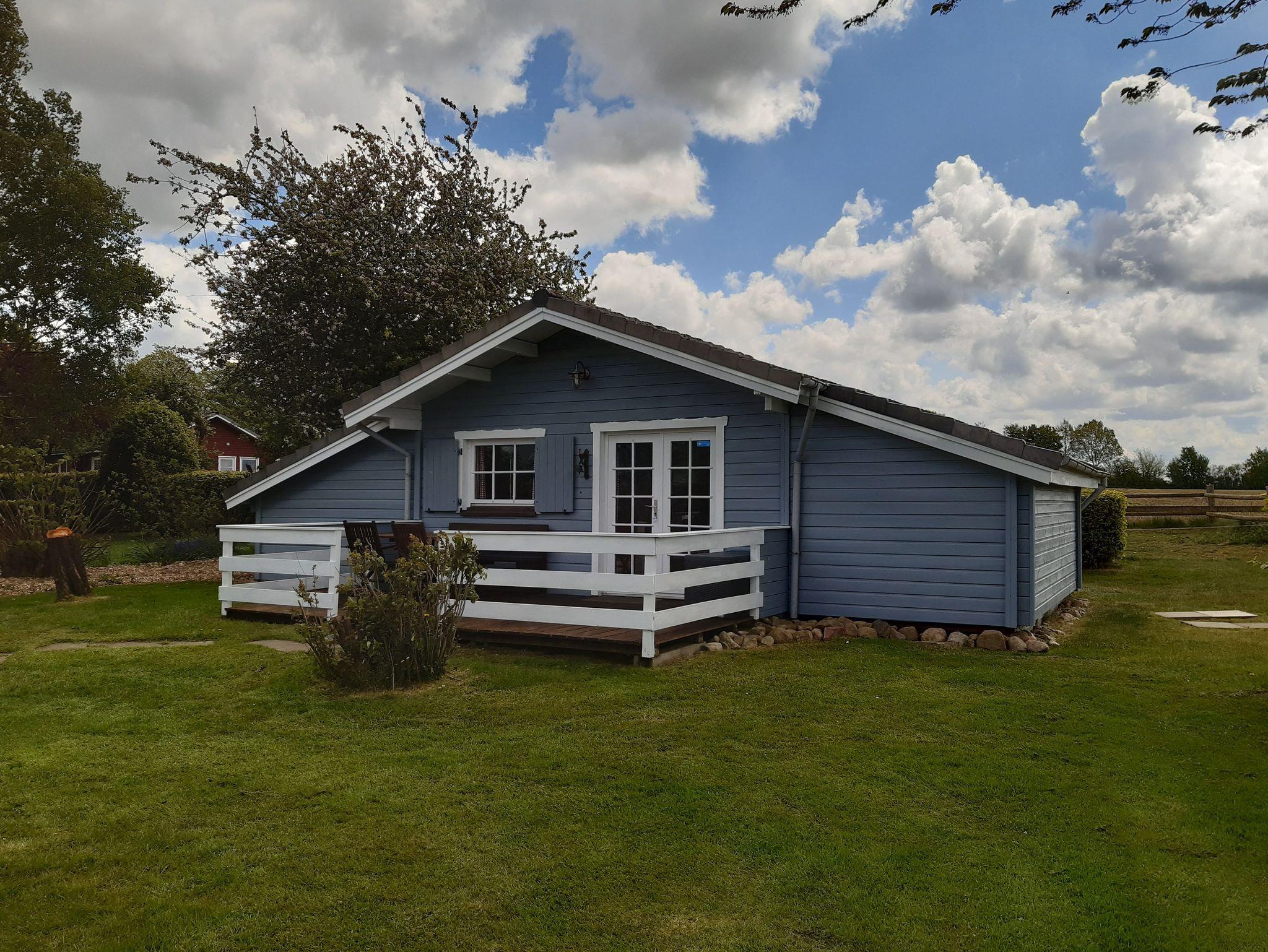 Gemütliches Blockbohlenhaus auf Ferienhof Schmeling in idyllischer Ostsee-Schleiregion mit Terrasse und großzügigem Garten.