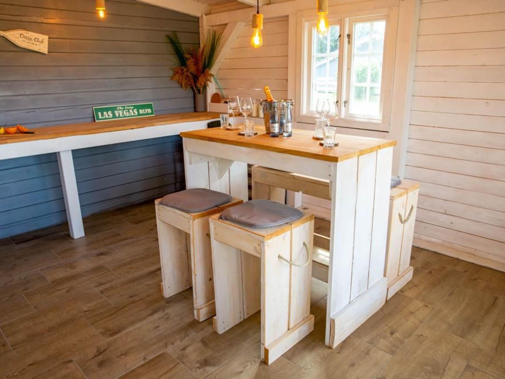 Die offenen Balken und Blockbohlen im Inneren des Hauses verleihen dem Haus einen besonderen Charme und schaffen Behaglichkeit zum Wohlfühlen. Direkt vor der Tür befindet sich eine großzügige Holzterrasse zum Garten, die dazu einlädt, in der Morgensonne zu frühstücken oder die herrlichen Urlaubsabende in gemütlicher Atmosphäre zu genießen.