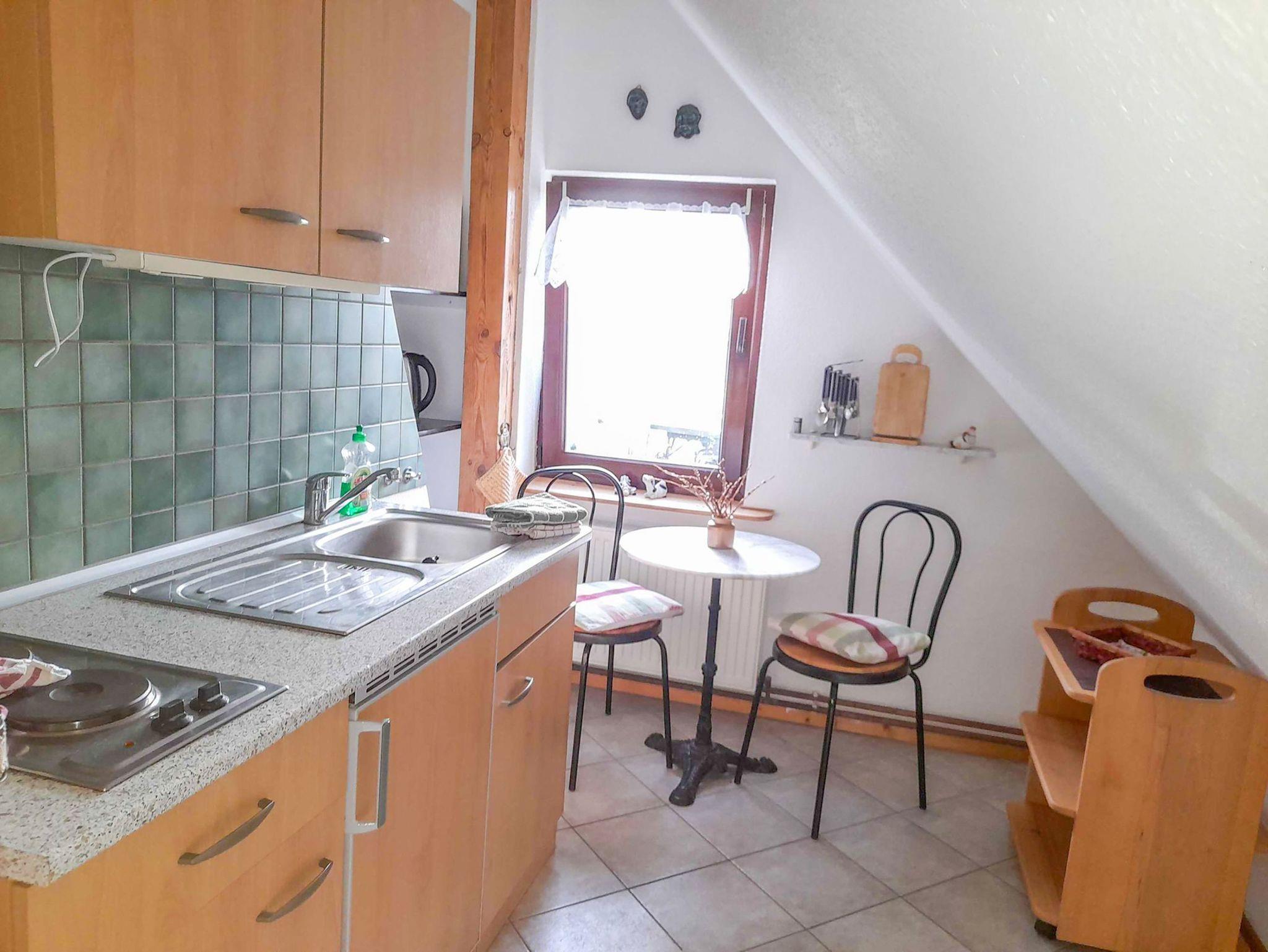 Die Ferienwohnung 2 bietet dir und deiner Familie auf 50 m² ein gemütliches Zuhause für bis zu 4 Personen und ein Kleinkind bis 2 Jahre. Sie erstreckt sich über das Ober- und Dachgeschoss des Hauses, das du über den Hausflur im Erdgeschoss erreichst. Der offene und großzügige Wohnbereich vereint alles, was du für einen entspannten Aufenthalt brauchst: ein bequemes Sofa und einen TV zum Relaxen, einen Essbereich für gemeinsame Mahlzeiten sowie ein komfortables Doppelbett (180x200). Zwei Einzelbetten (90x200) sind harmonisch in den Raum integriert und können bei Bedarf durch einen Vorhang vom restlichen Raum abgetrennt werden ? ideal für ein wenig mehr Privatsphäre. Die Küche ist kompakt, aber funktional ausgestattet: Mit einer Küchenzeile, einem Kühlschrank, einer Mikrowelle, einem Wasserkocher, einer Kaffeemaschine und einem Toaster hast du alles zur Hand, um dich und deine Lieben zu verwöhnen. Das Bad mit Dusche und WC ist hell und modern ? ideal, um den Tag frisch zu beginnen oder nach einem erlebnisreichen Ausflug zu entspannen. Ein Highlight für die Kinder: Über eine steile Wendeltreppe im Wohnzimmer gelangst du in den Dachboden. Dort erwarten dich zwei weitere Einzelbetten (90x200), die eine charmante Rückzugsmöglichkeit bieten. Die Ferienwohnung 2 ist der perfekte Ort für eine kleine Auszeit, bei der du die Alleinlage am Waldrand genießen und dich ganz auf die Ruhe der Natur einlassen kannst.
