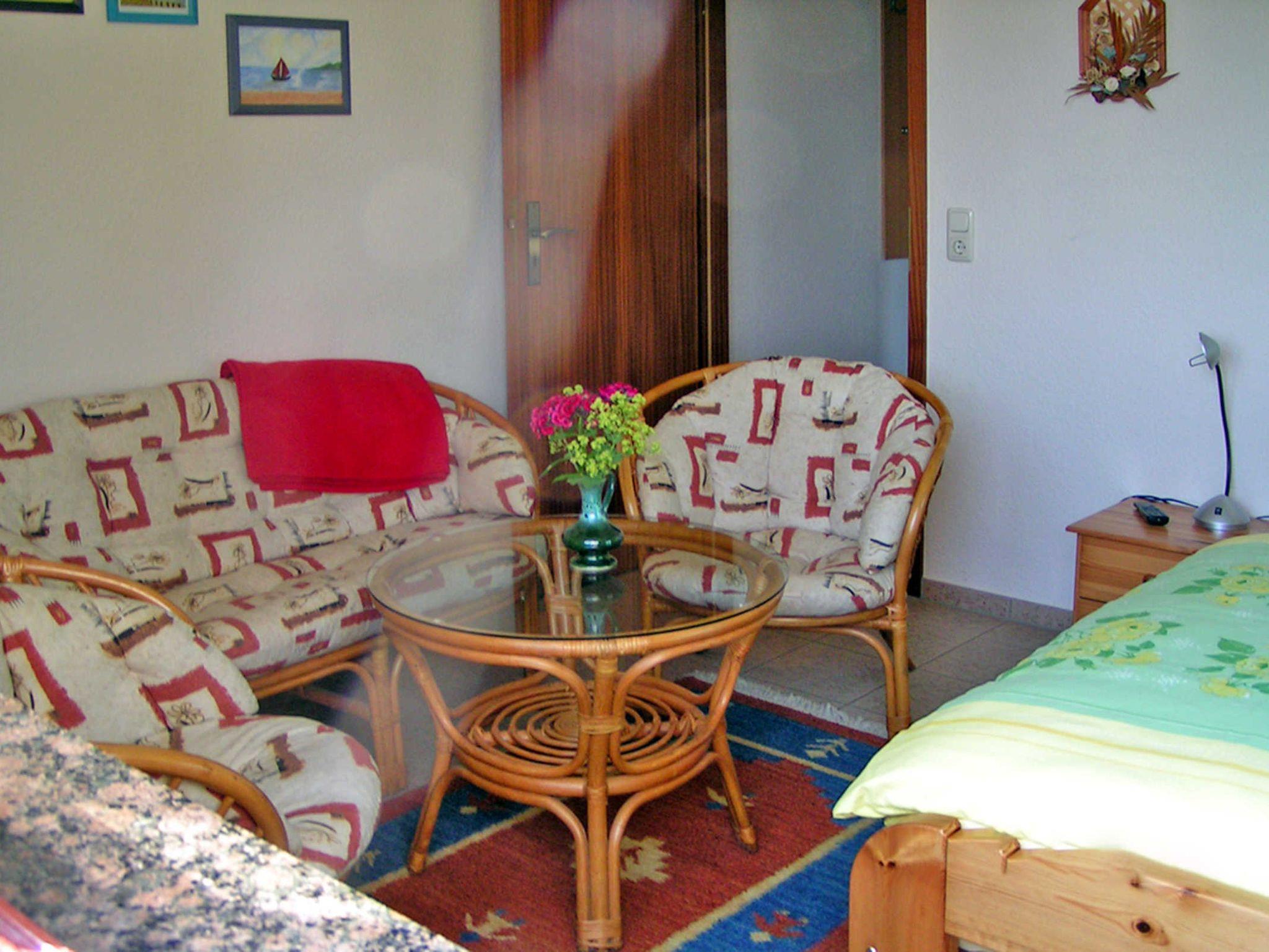 Die Ferienwohnung verfügt über einen kombinierten Wohn- und Schlafraum, der mit einem Doppelbett, einer Rattan-Sitzgruppe und einen SAT-TV ausgestattet ist, einen Durchgangsraum in dem sich ein Doppelstockbett und ein Schrank, eine voll ausgestattete Küche mit Kühlschrank, Gefriermöglichkeit und Backofen sowie ein Bad mit Dusche und WC.