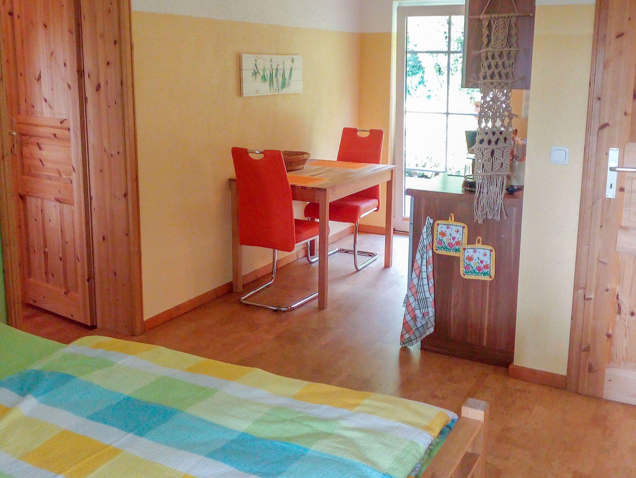 Die Ferienwohnung am Wald in Ahrenshagen-Daskow bietet auf 32 m² alles, was du für einen entspannten Aufenthalt benötigst. Die ebenerdige Wohnung ist ideal für bis zu 3 Personen und überzeugt mit einer praktischen und gemütlichen Ausstattung. Der kombinierte Wohn- und Schlafbereich ist das Herzstück der Wohnung. Hier findest du ein bequemes Doppelbett (180x200), eine gemütliche Sitzgelegenheit sowie einen Essbereich, an dem du deine Mahlzeiten genießen kannst. Ein TV sorgt für Unterhaltung, falls du einen ruhigen Abend drinnen verbringen möchtest. Die offene Küche ist gut ausgestattet und bietet dir einen Backofen, einen Herd, einen Kühlschrank, einen Toaster, einen Wasserkocher und eine Kaffeemaschine ? perfekt, um dir kleine Köstlichkeiten zuzubereiten. Ein separater kleiner Raum mit einem Klappbett (90x200) bietet eine zusätzliche Schlafmöglichkeit und macht die Wohnung flexibel nutzbar. Das Badezimmer ist mit einer Dusche und einem WC ausgestattet und rundet den Innenbereich praktisch ab. Hier findest du auf kleinem Raum alles, was du für eine entspannte Auszeit in der Natur benötigst.