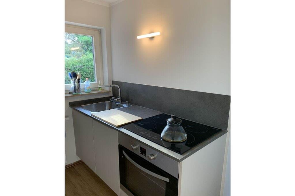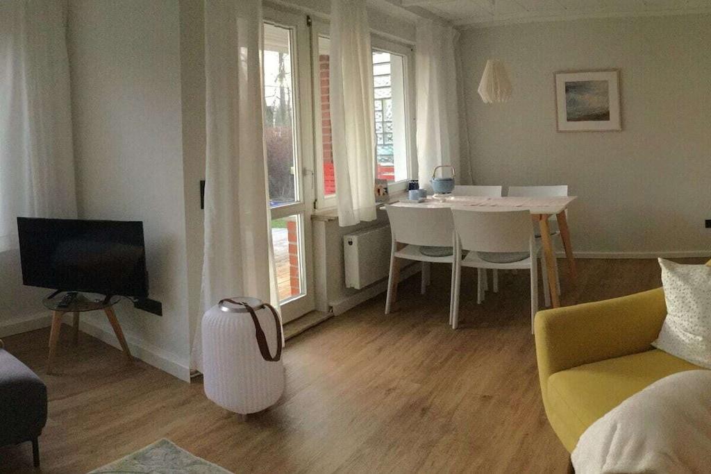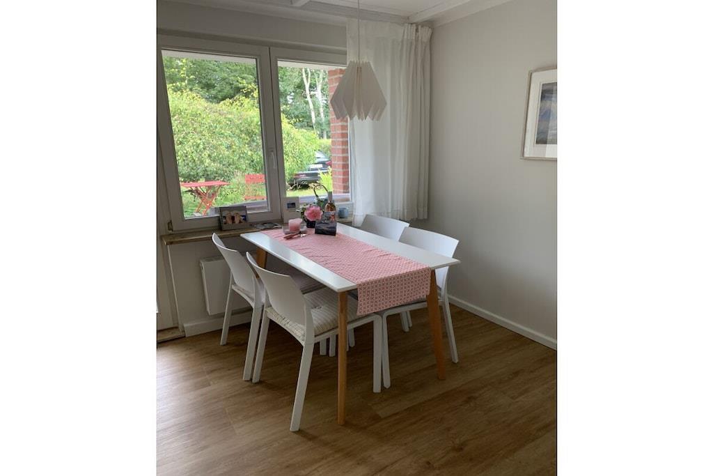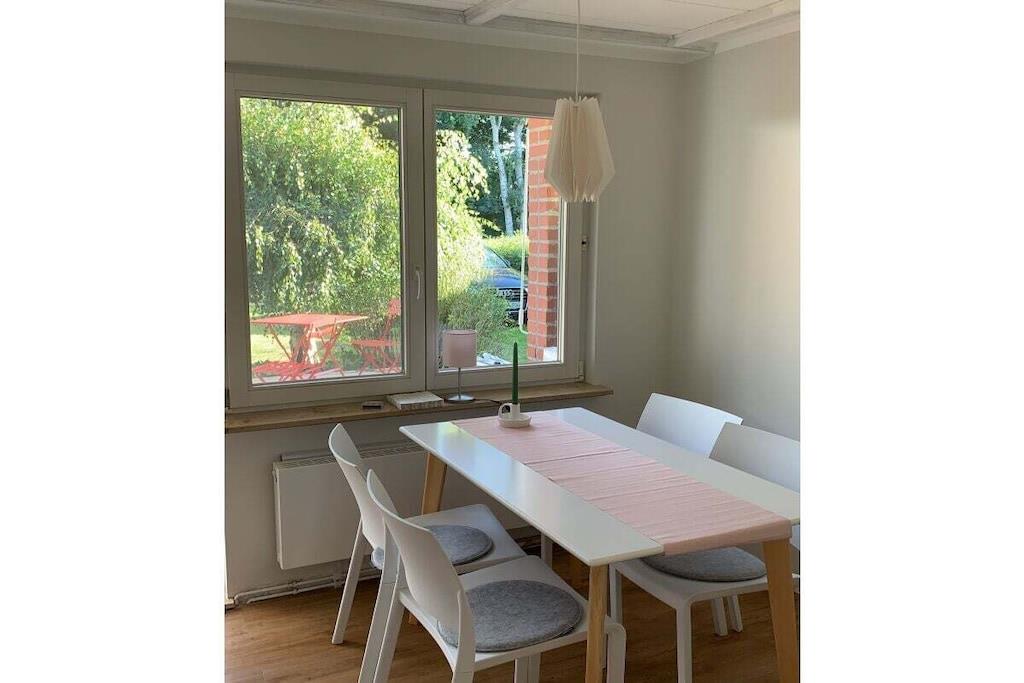 Unser kleines Häuschen verfügt über einen Wohn- und Essbereich, eine komplett eingerichtete Küche, 2 Schlafzimmer und ein großes Bad mit Fenster. Eine Südterrasse , mit Blick über die Felder, lädt zum Verweilen ein.