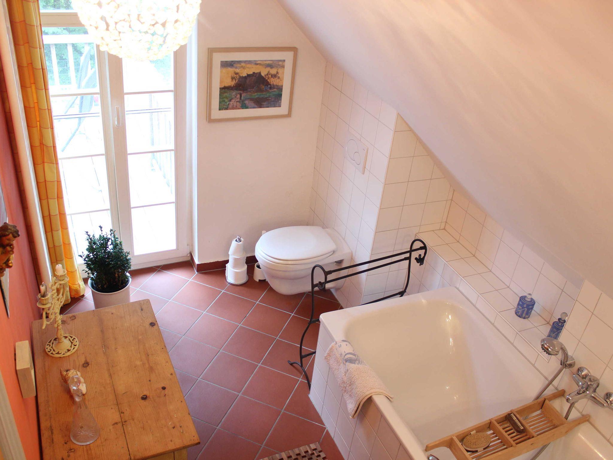 1 Schlafzimmer mit Doppelbett, Bad (Badewanne und WC) und Dachterrasse