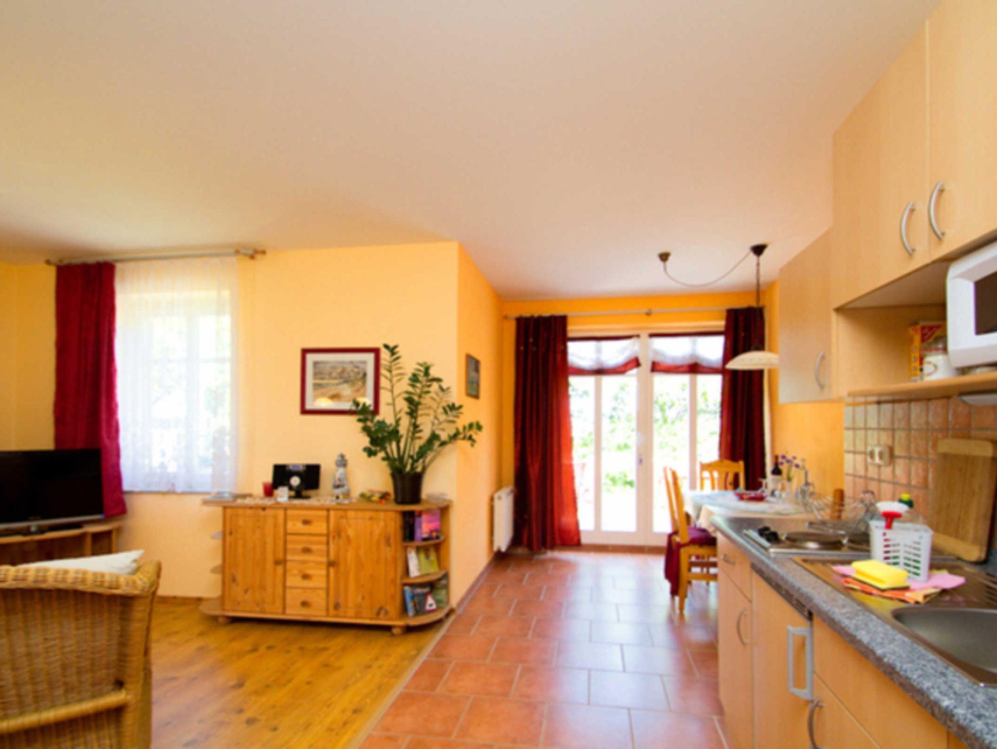 Der Wohnraum mit gemütlicher Sitzecke lädt zum Entspannen ein. Die Küchenzeile mit 2-Platten Herd, ist vollausgestattet und ein großer Esstisch erwartet Sie. Das Bad ist ausgestattet mit Dusche / WC und Waschtisch. Auf der Westterrasse können Sie entspannt zu schauen wie die Sonne hinterm Bakelberg untergeht. Eine extra gelegene gemeinsame große Grillecke auf dem Grundstück lädt zum gemütlichen Abendessen an der frischen Luft ein.