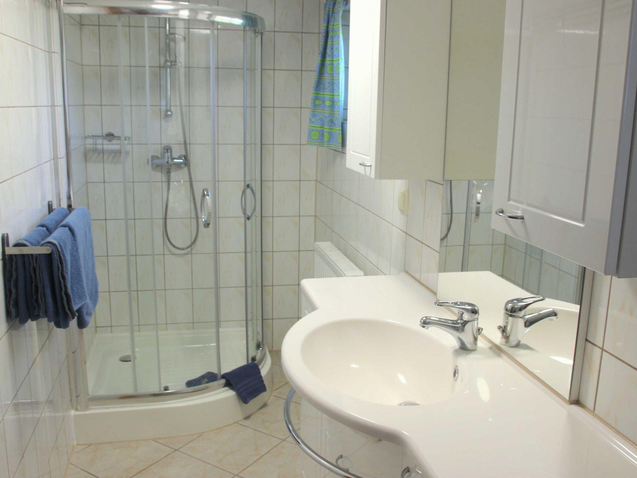 Das Badezimmer ist mit einer Dusche ausgestattet.